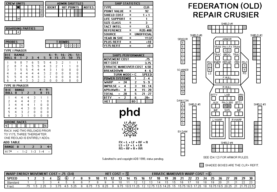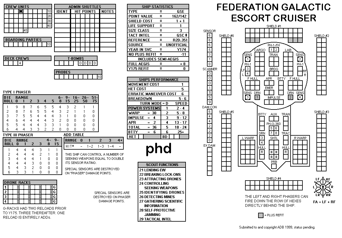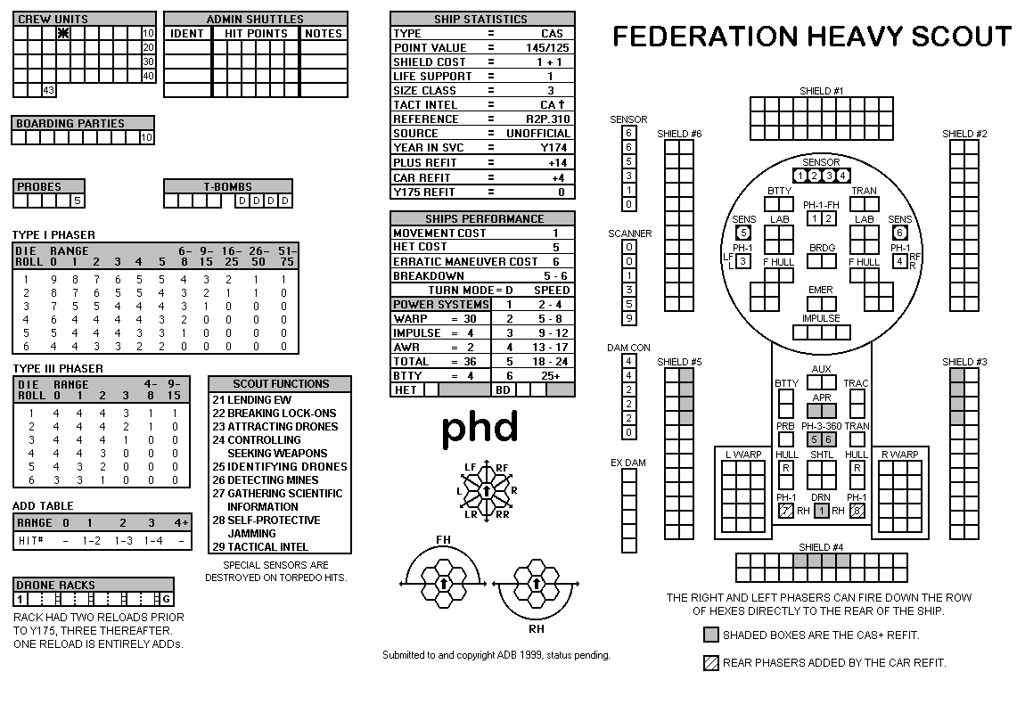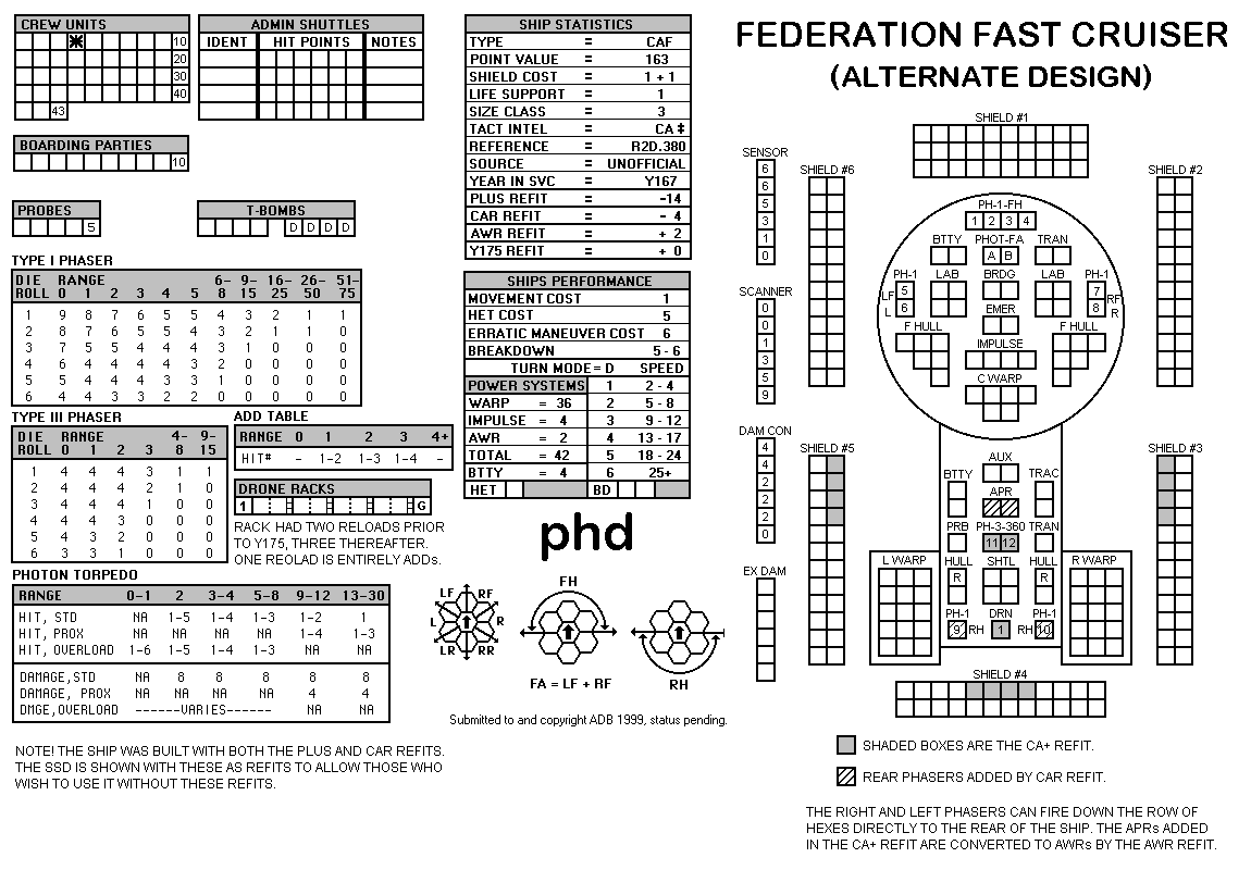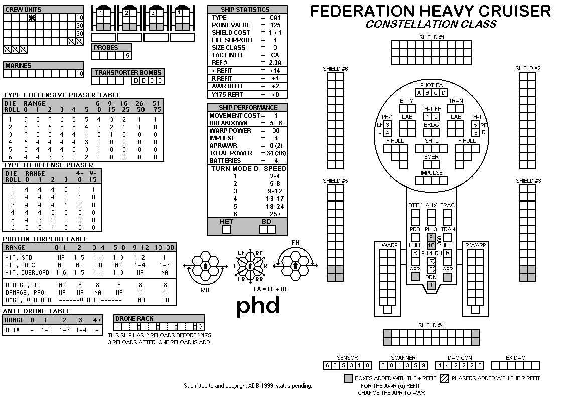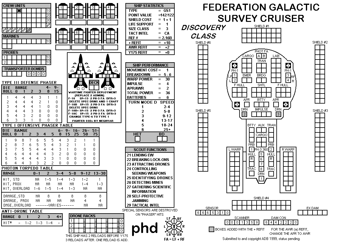 and the ADDs represent the Y175 refit. NOTE: On most SSDs the fighter/shuttles have shaded boxes, these represent the crippled the status of the fighter/shuttle. NOTE: On some SSDs the crew check-off boxes have a 'B' or 'D' in them, these represent the crew units that are Boarding Parties or Deck Crews. |