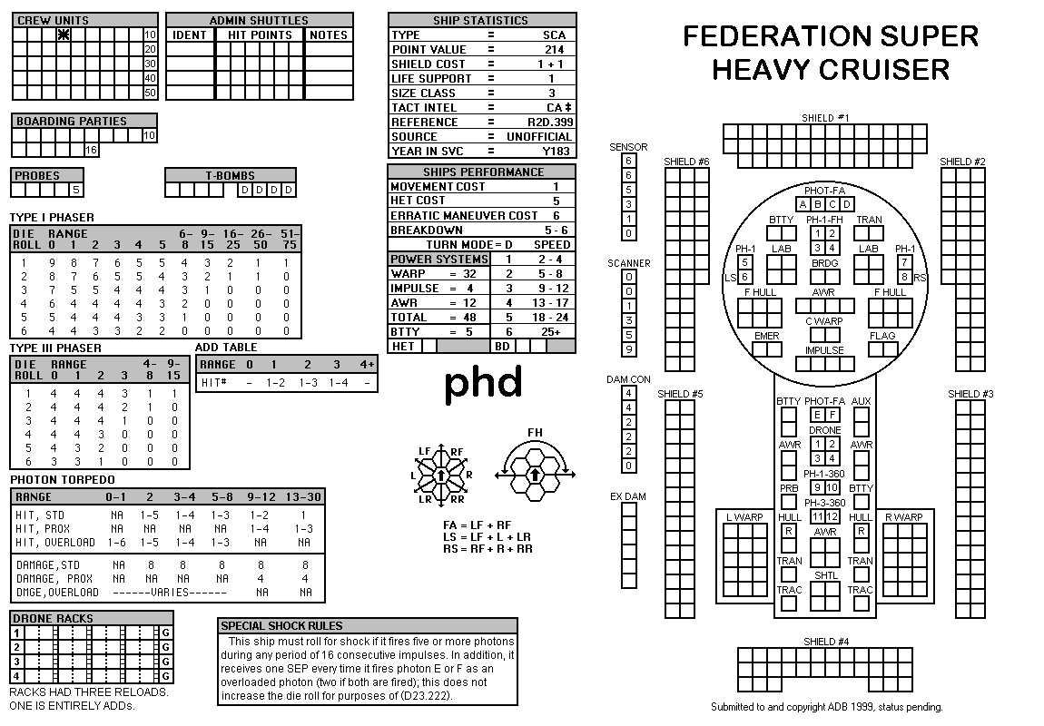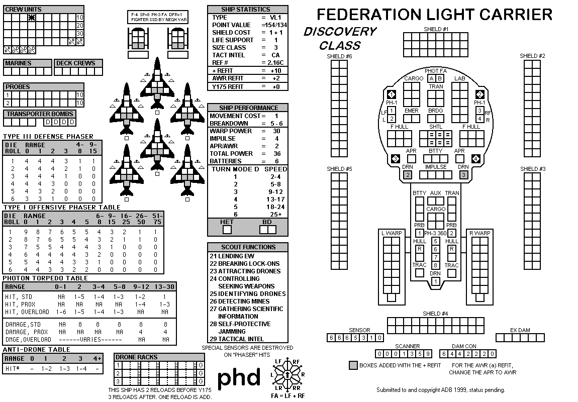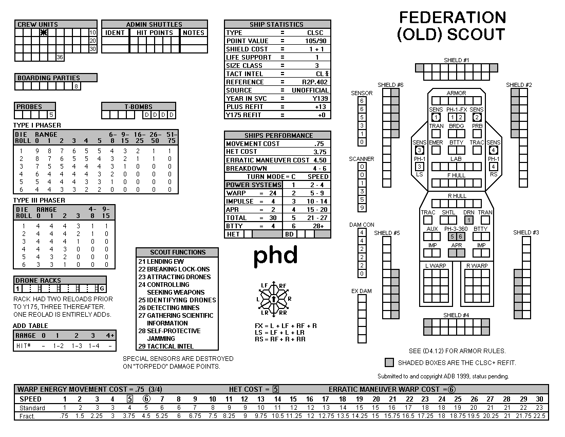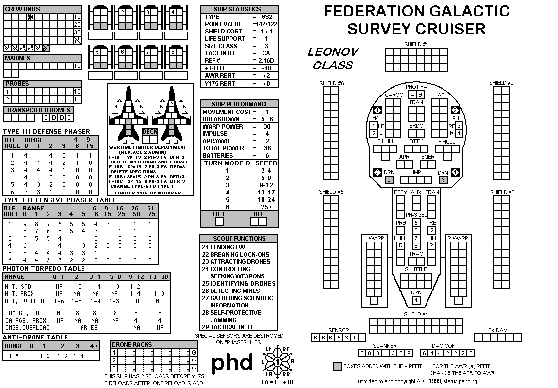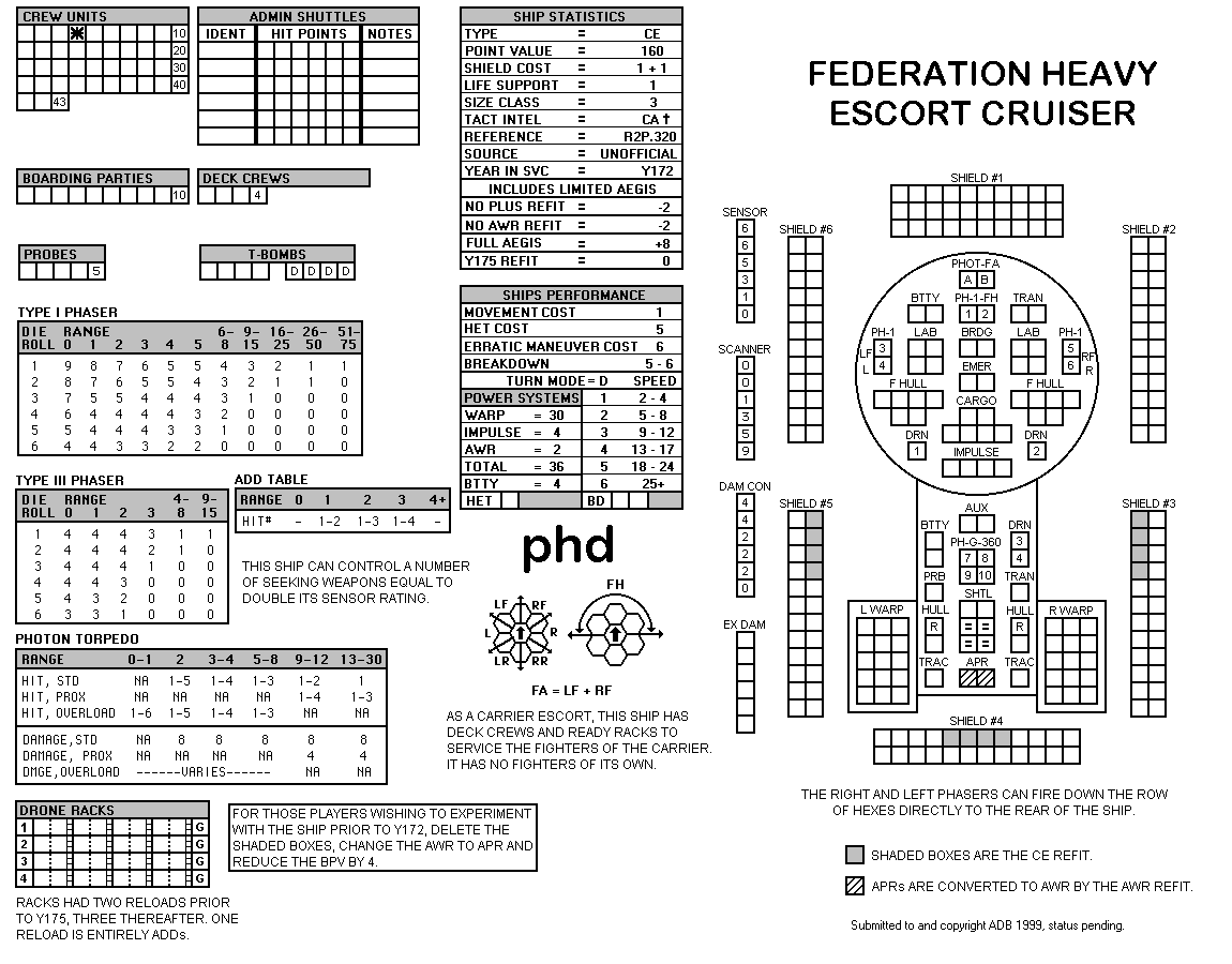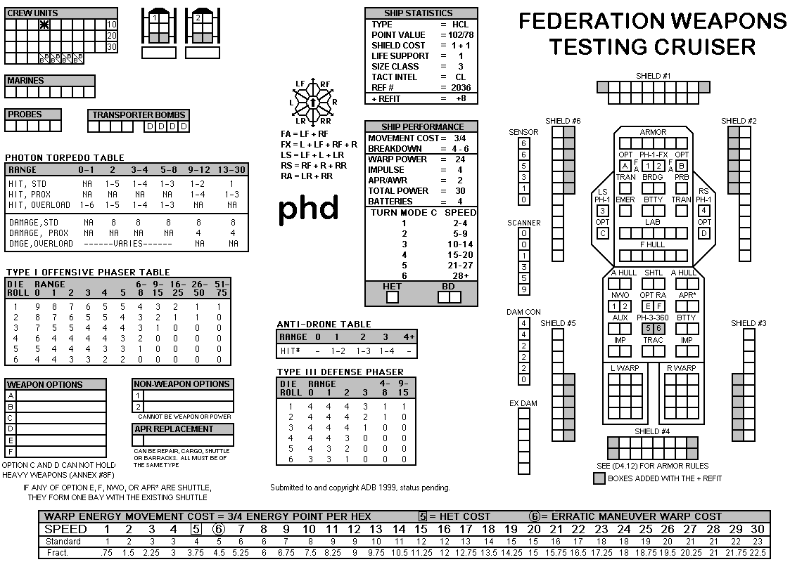 and the ADDs represent the Y175 refit. NOTE: On most SSDs the fighter/shuttles have shaded boxes, these represent the crippled the status of the fighter/shuttle. NOTE: On some SSDs the crew check-off boxes have a 'B' or 'D' in them, these represent the crew units that are Boarding Parties or Deck Crews. |