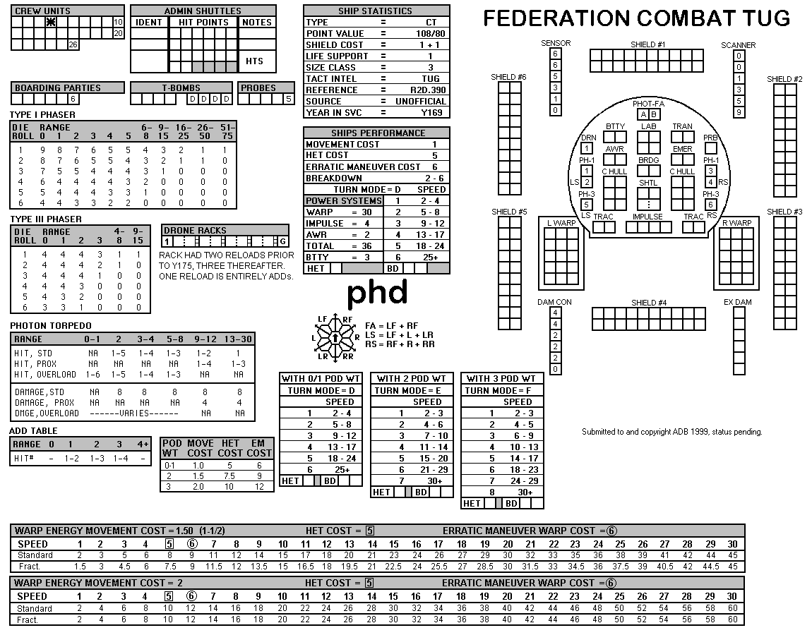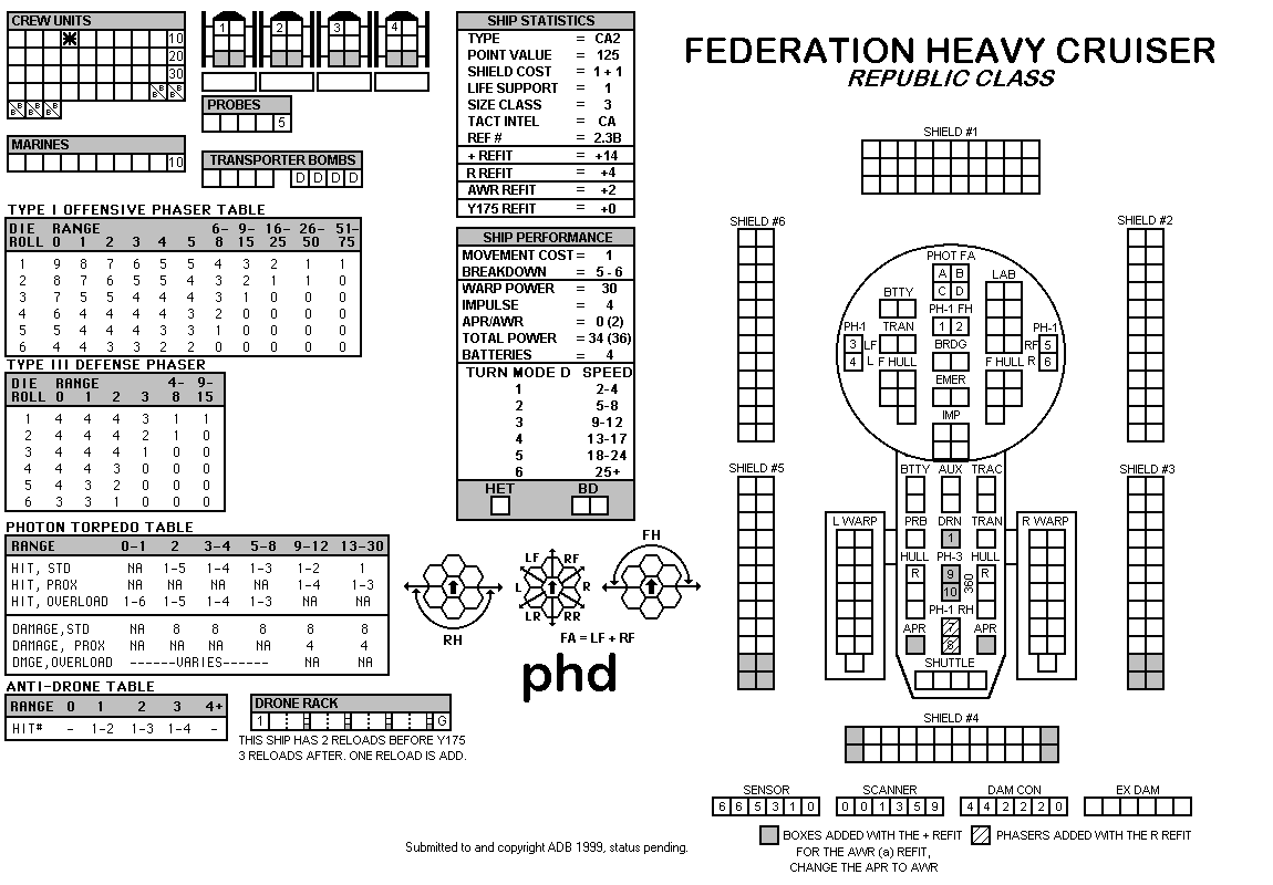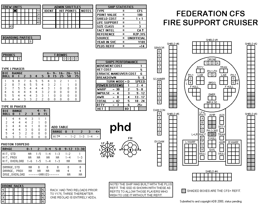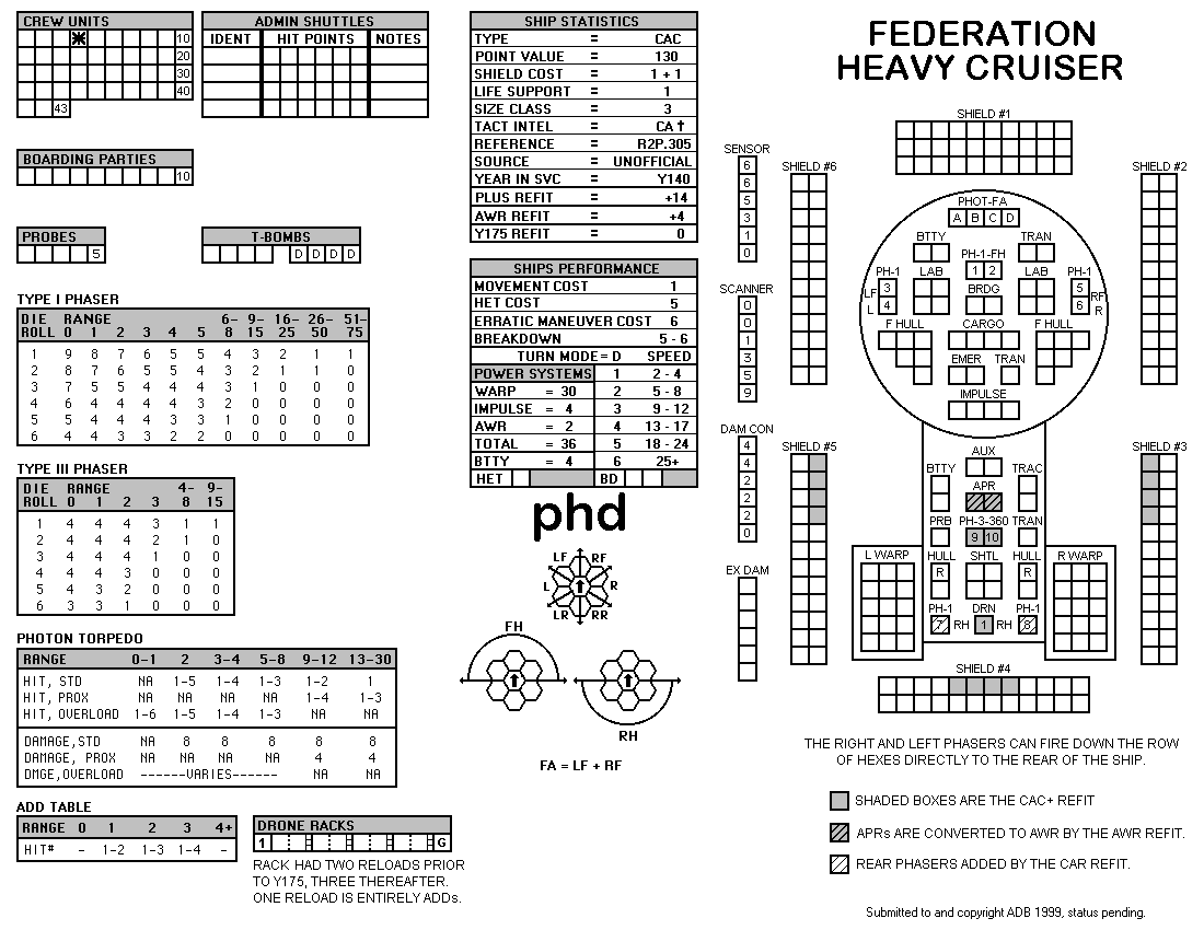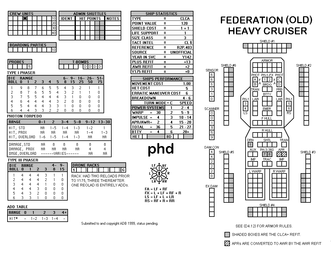 and the ADDs represent the Y175 refit. NOTE: On most SSDs the fighter/shuttles have shaded boxes, these represent the crippled the status of the fighter/shuttle. NOTE: On some SSDs the crew check-off boxes have a 'B' or 'D' in them, these represent the crew units that are Boarding Parties or Deck Crews. |