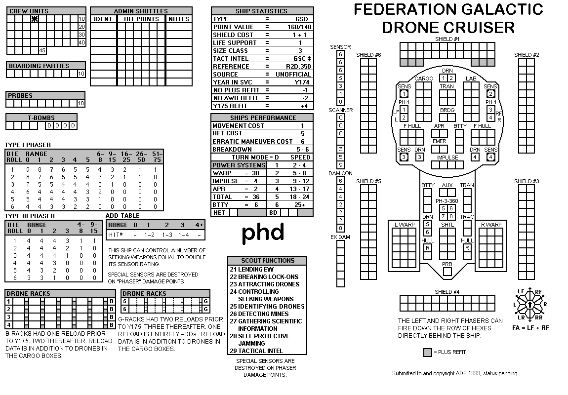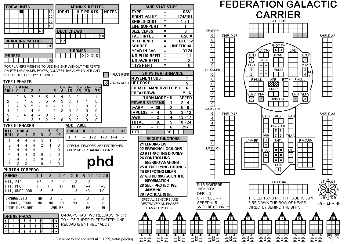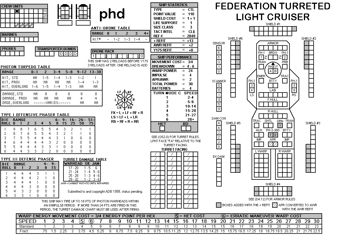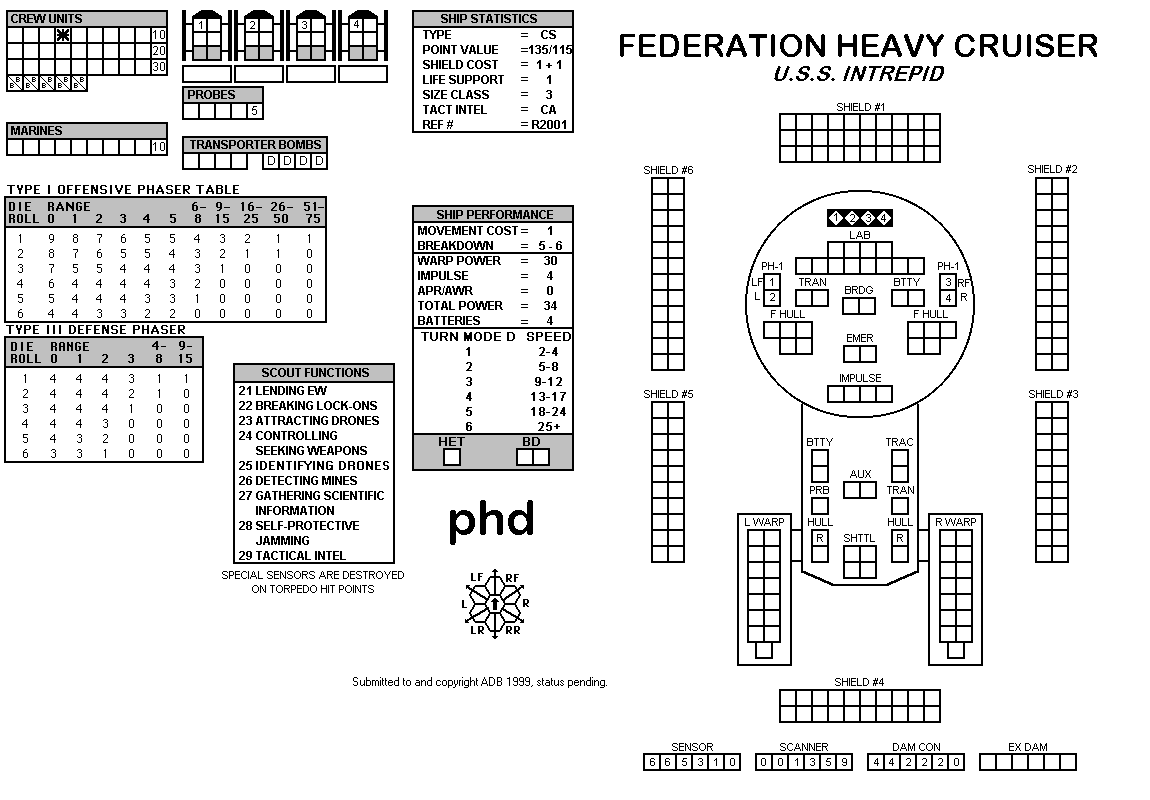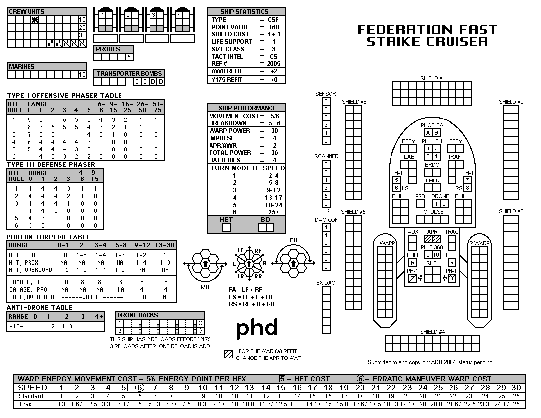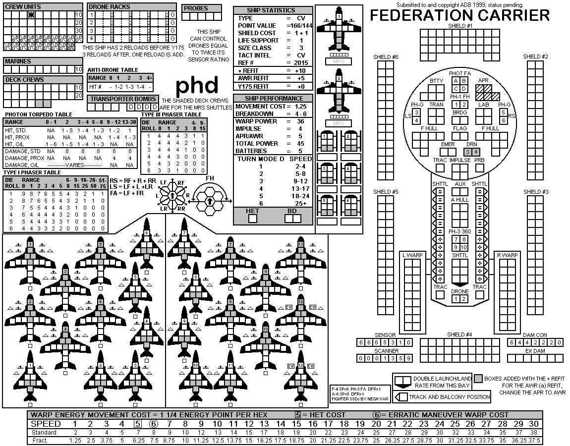 and the ADDs represent the Y175 refit. NOTE: On most SSDs the fighter/shuttles have shaded boxes, these represent the crippled the status of the fighter/shuttle. NOTE: On some SSDs the crew check-off boxes have a 'B' or 'D' in them, these represent the crew units that are Boarding Parties or Deck Crews. |