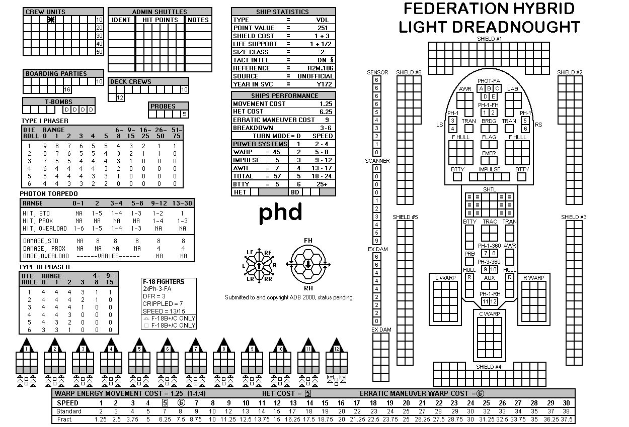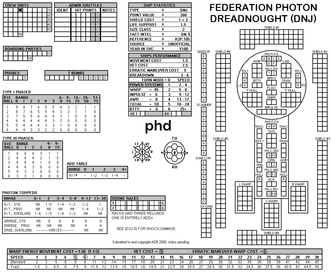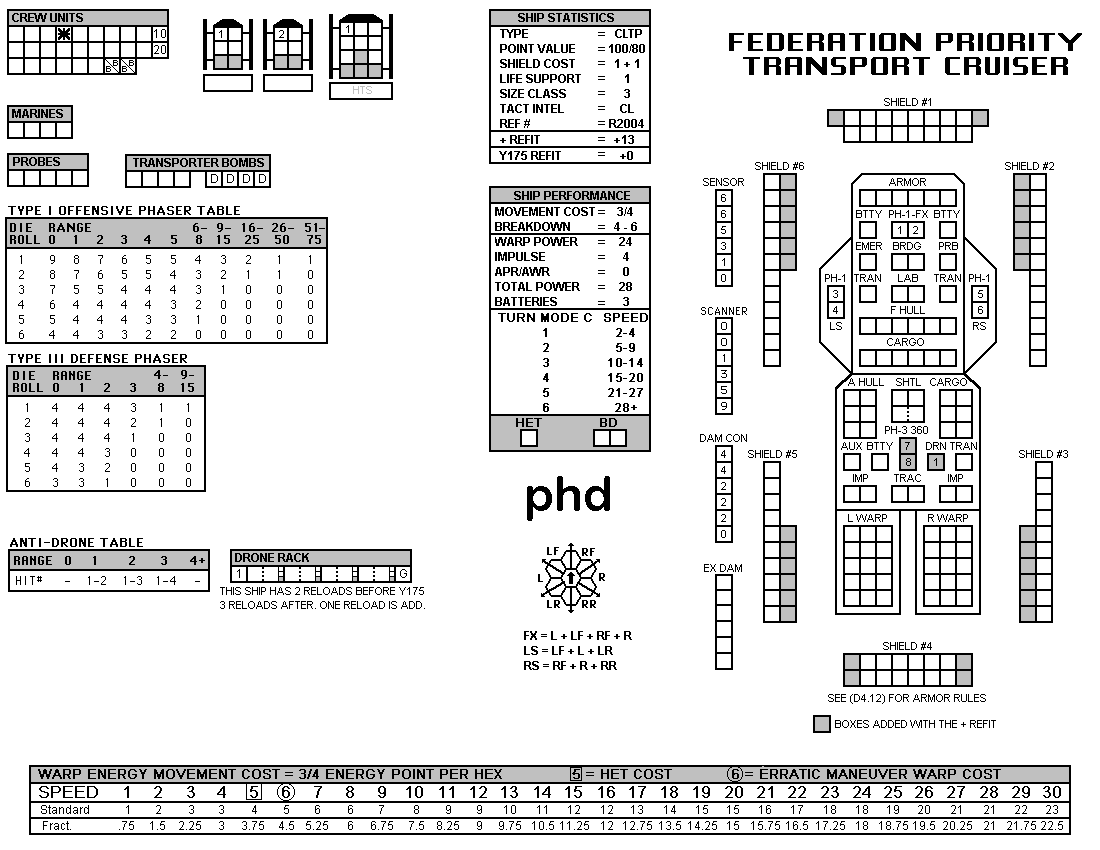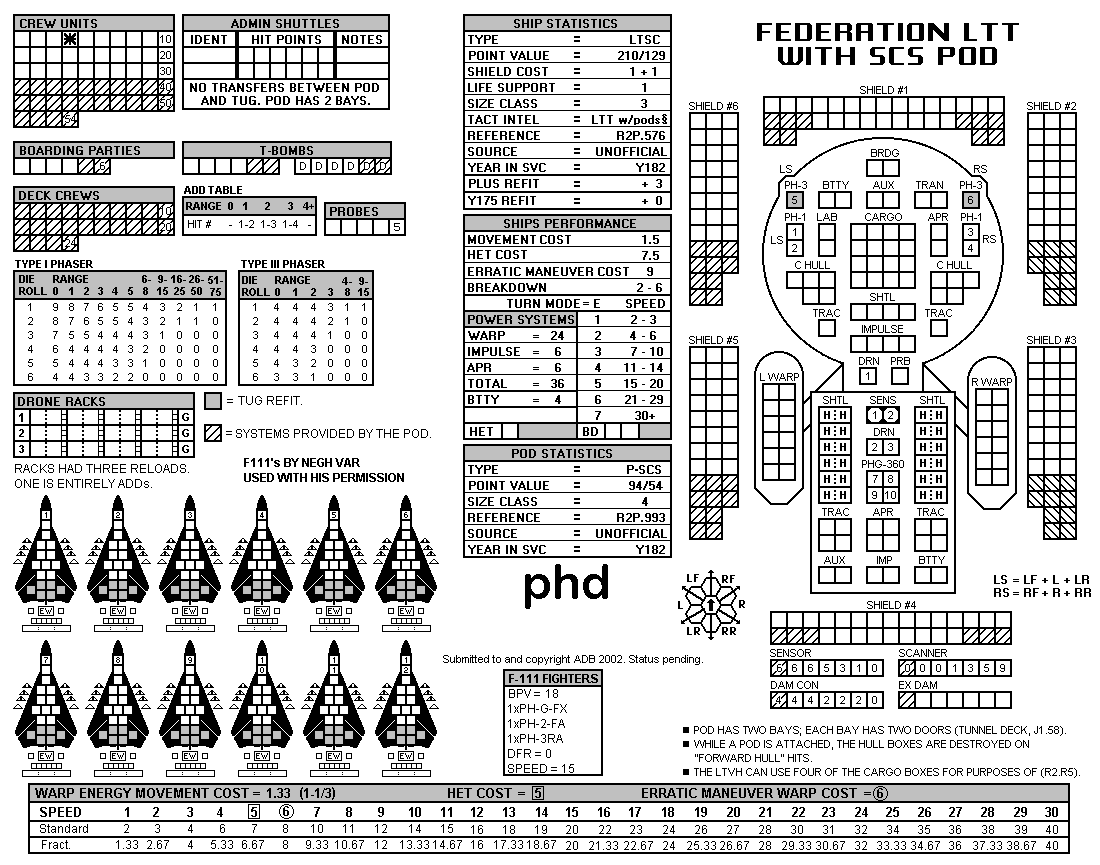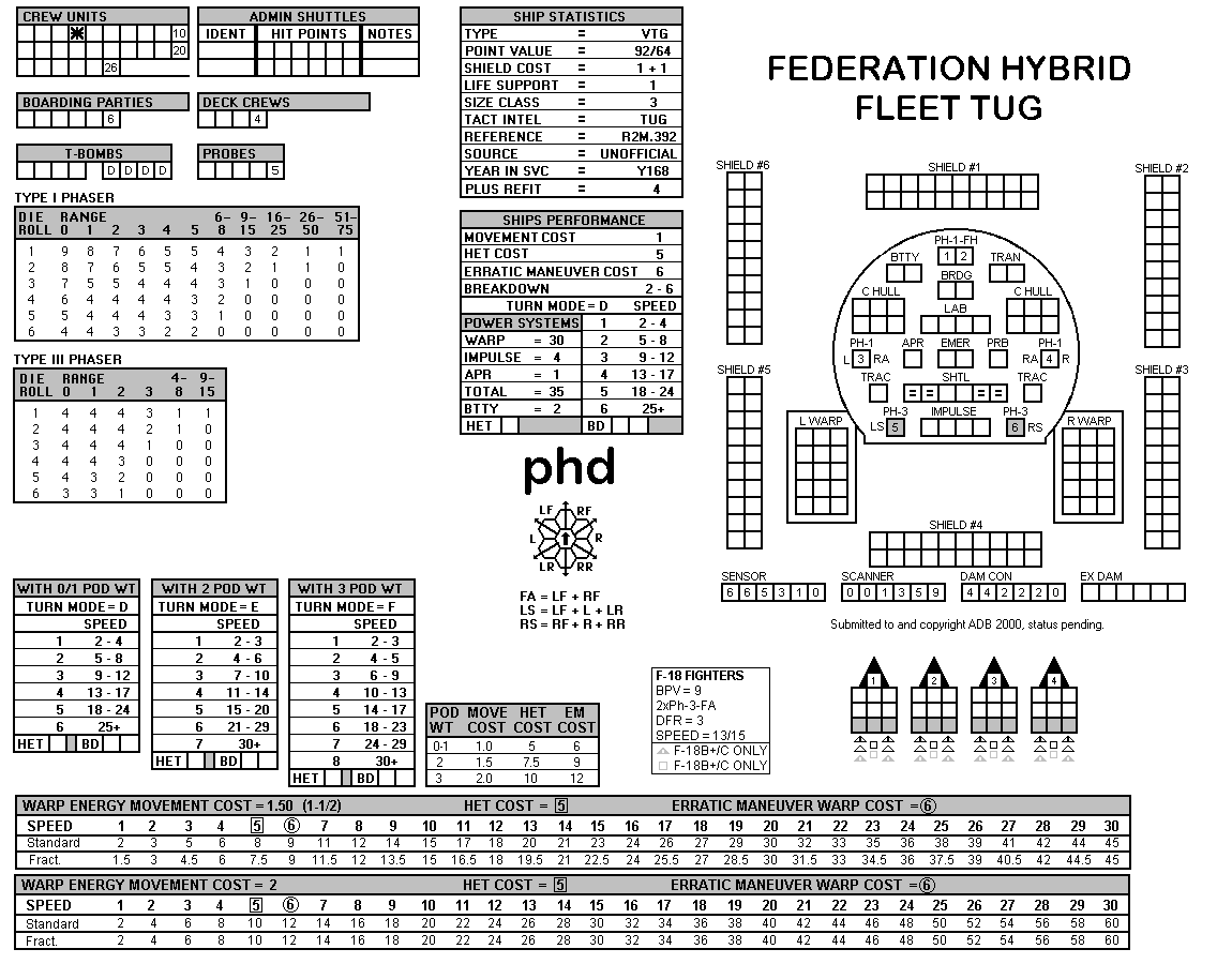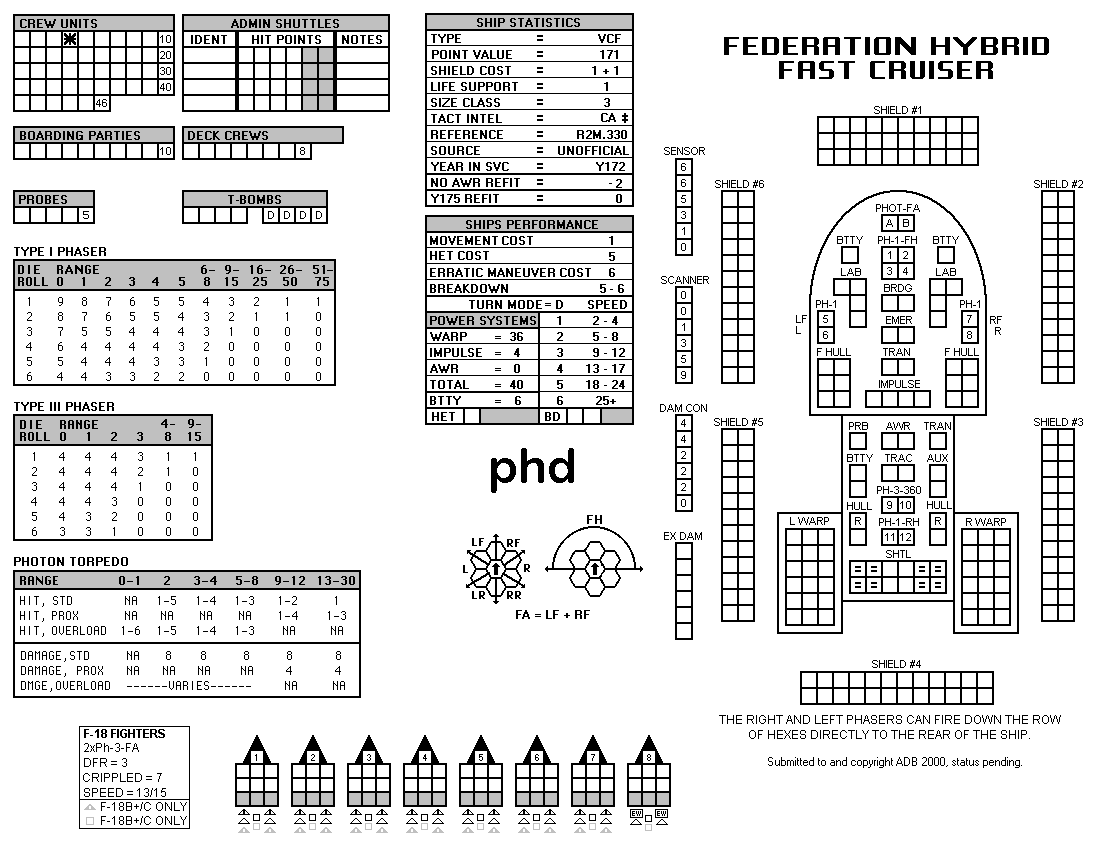 and the ADDs represent the Y175 refit. NOTE: On most SSDs the fighter/shuttles have shaded boxes, these represent the crippled the status of the fighter/shuttle. NOTE: On some SSDs the crew check-off boxes have a 'B' or 'D' in them, these represent the crew units that are Boarding Parties or Deck Crews. |