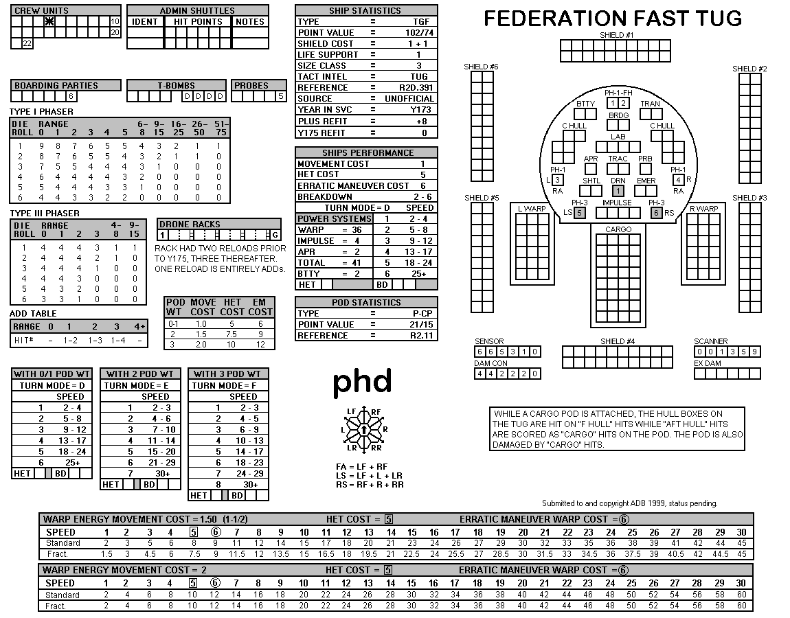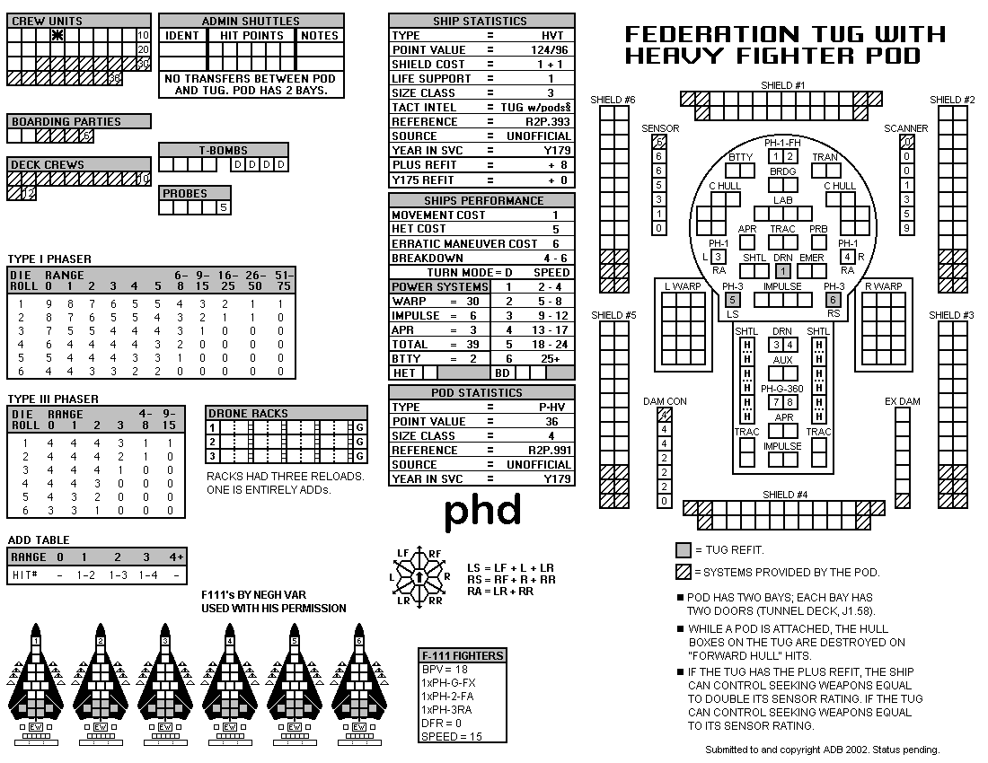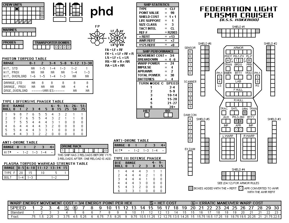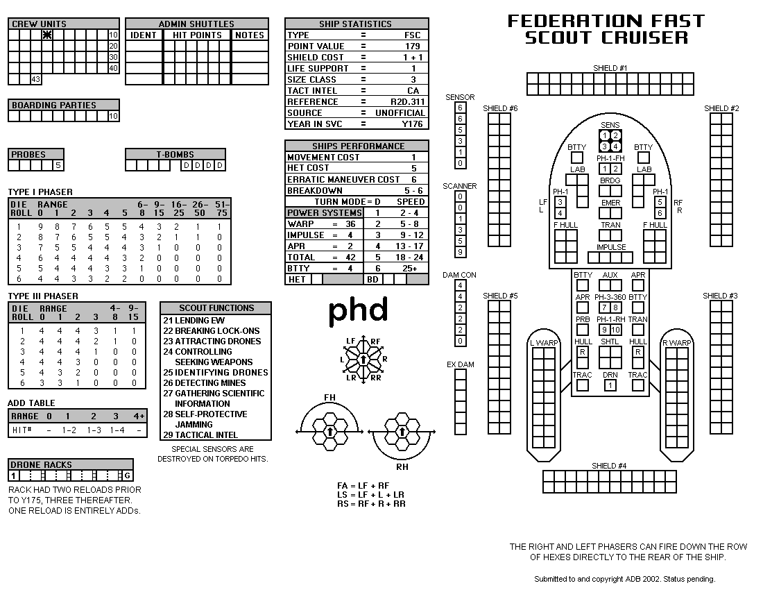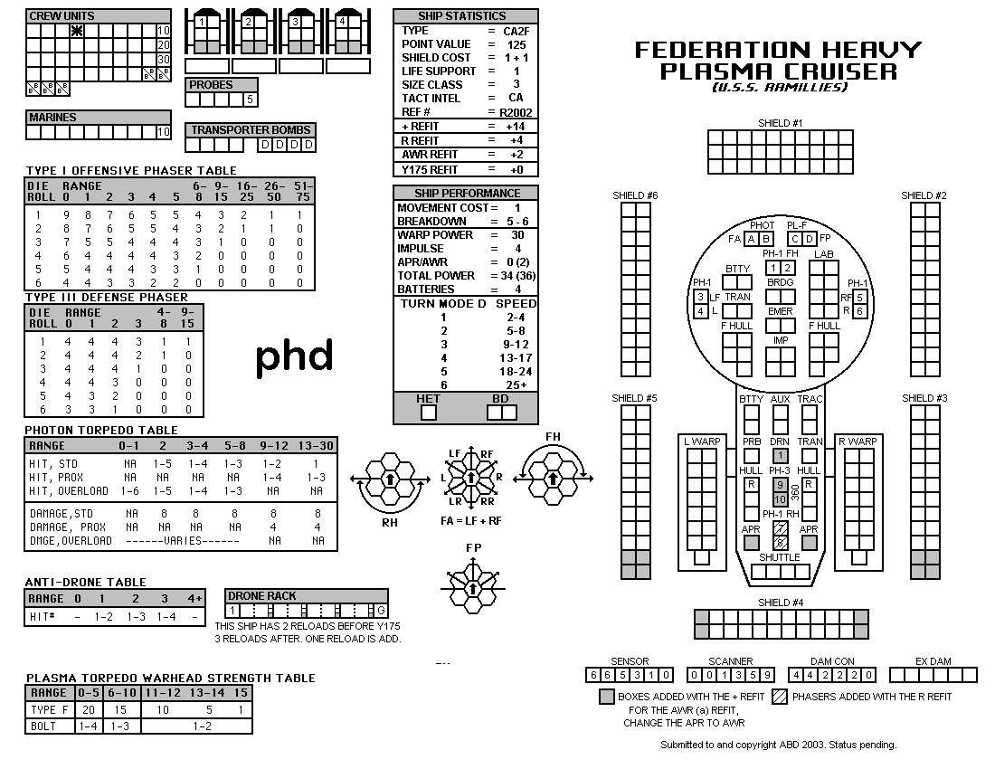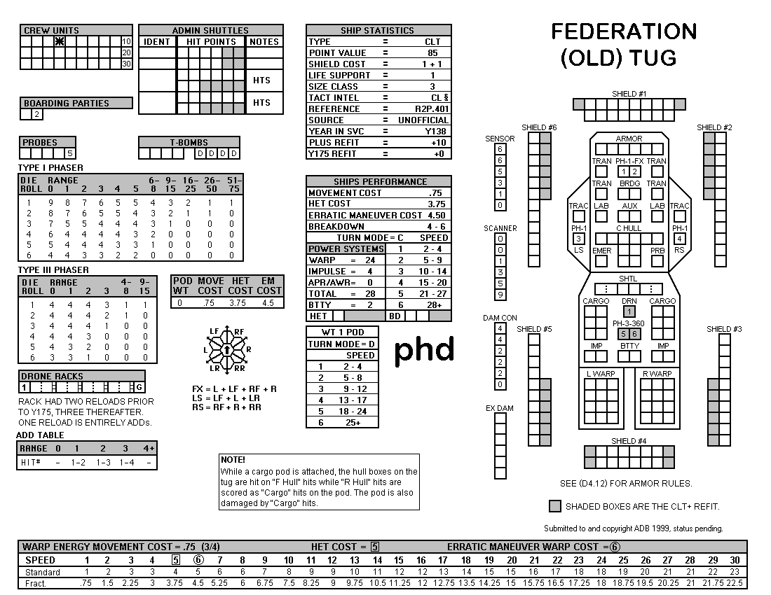 and the ADDs represent the Y175 refit. NOTE: On most SSDs the fighter/shuttles have shaded boxes, these represent the crippled the status of the fighter/shuttle. NOTE: On some SSDs the crew check-off boxes have a 'B' or 'D' in them, these represent the crew units that are Boarding Parties or Deck Crews. |