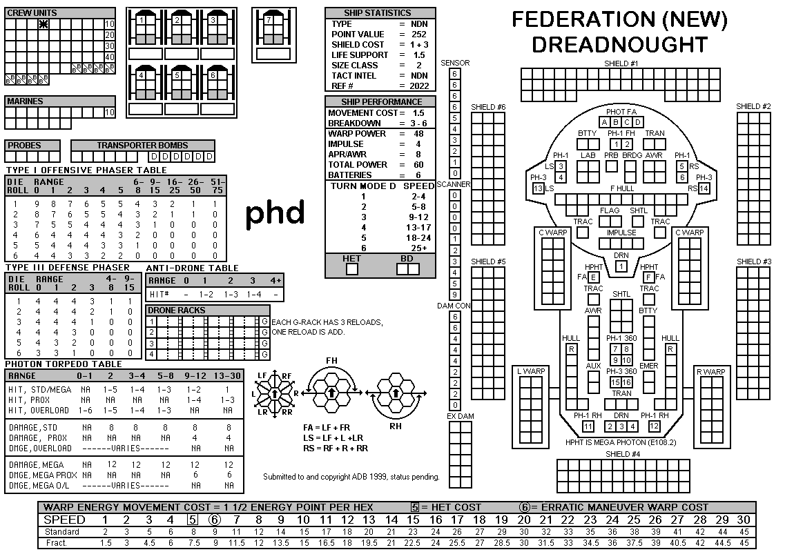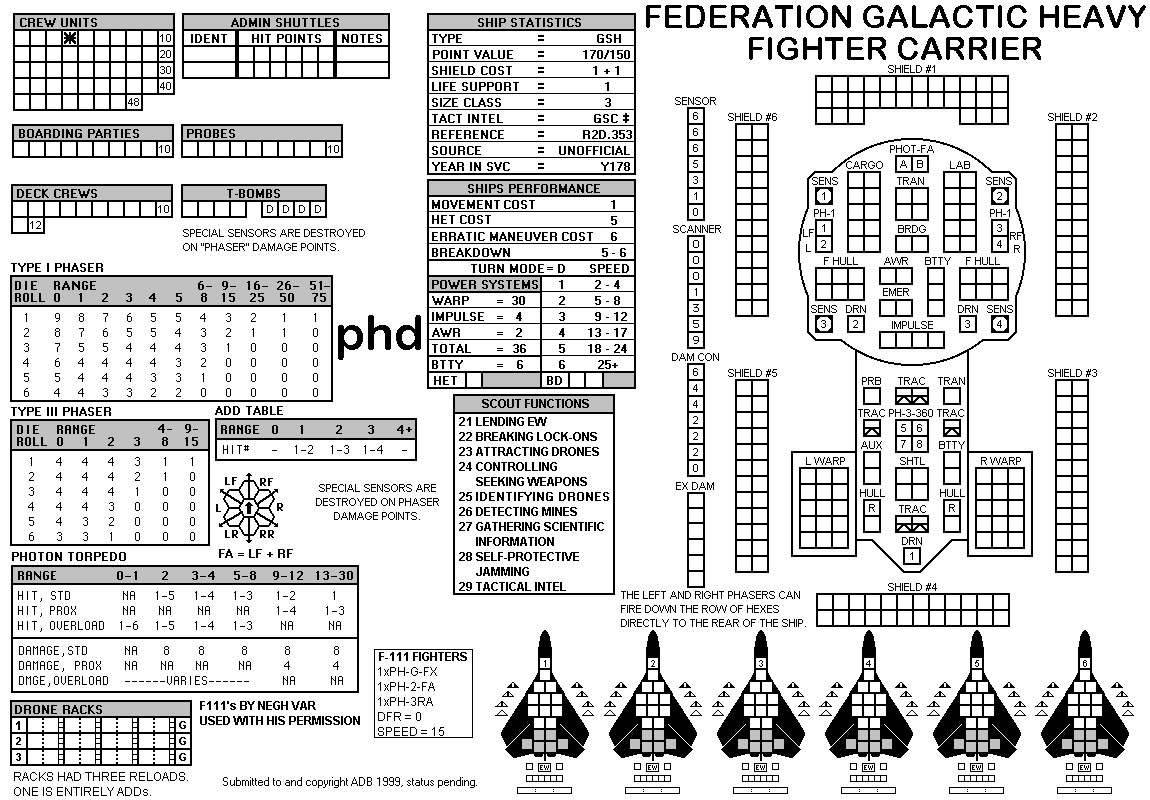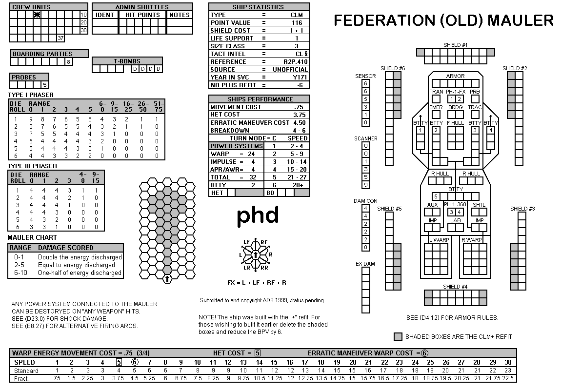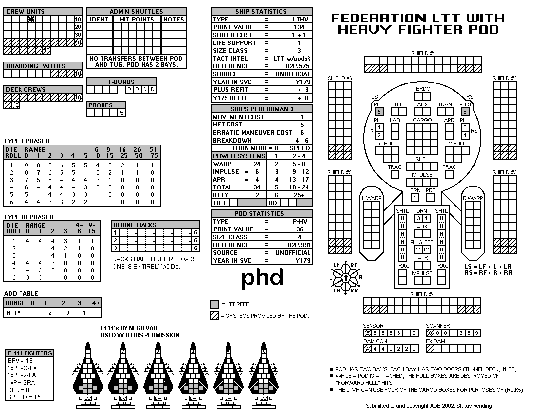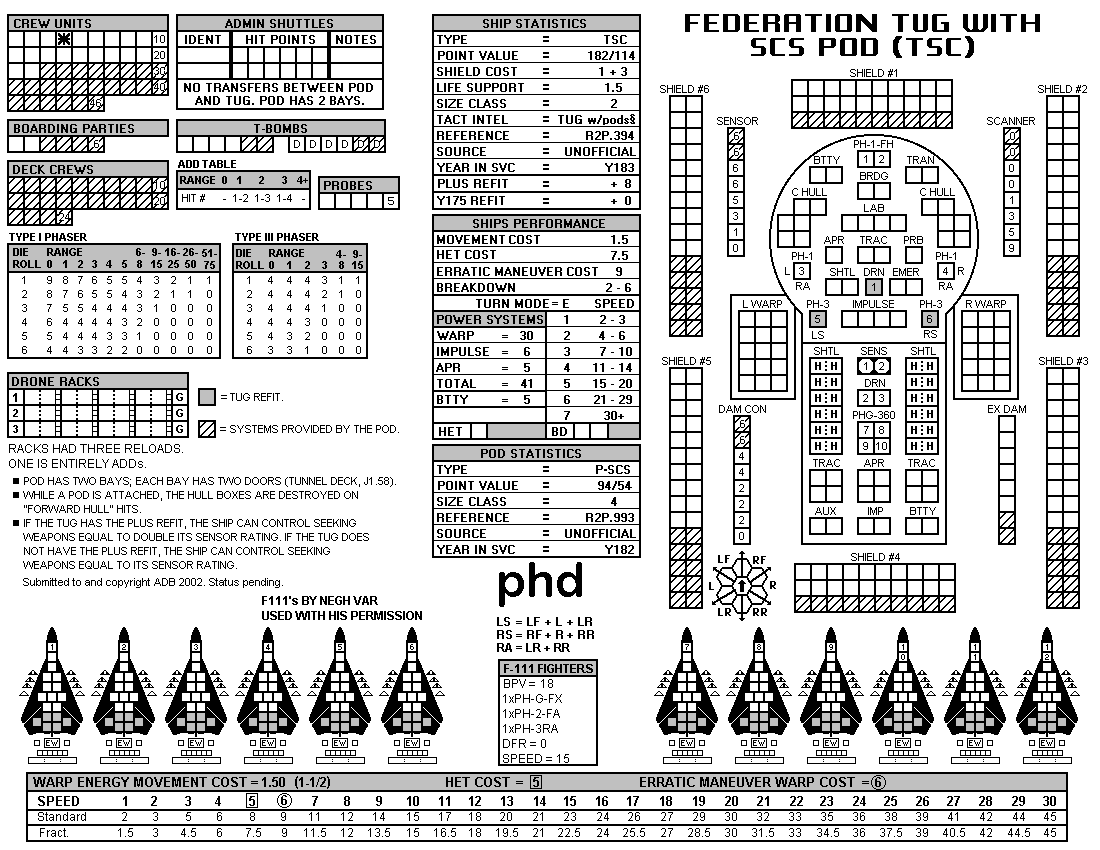 and the ADDs represent the Y175 refit. NOTE: On most SSDs the fighter/shuttles have shaded boxes, these represent the crippled the status of the fighter/shuttle. NOTE: On some SSDs the crew check-off boxes have a 'B' or 'D' in them, these represent the crew units that are Boarding Parties or Deck Crews. |