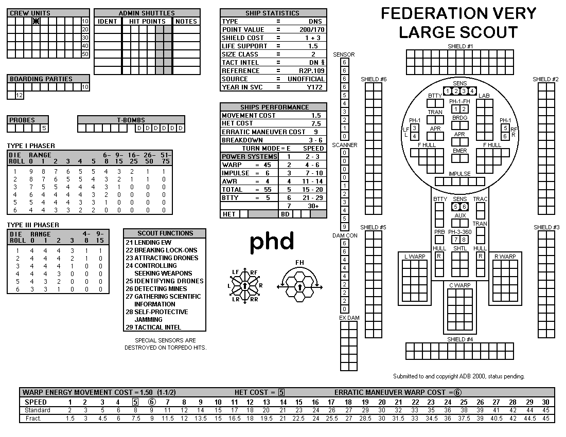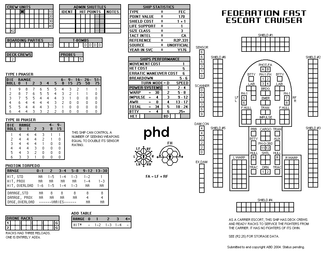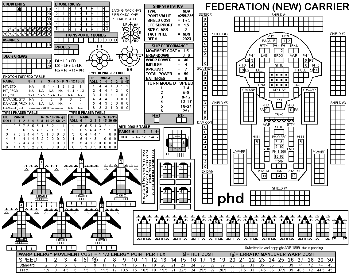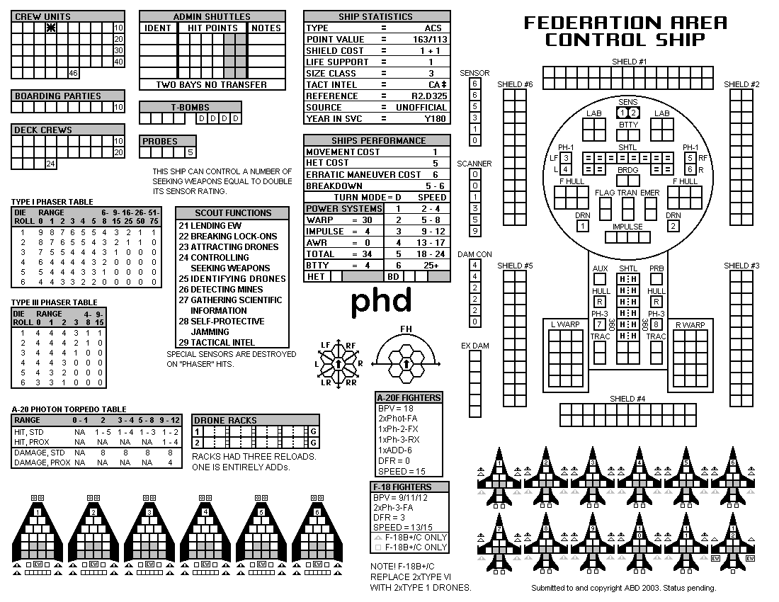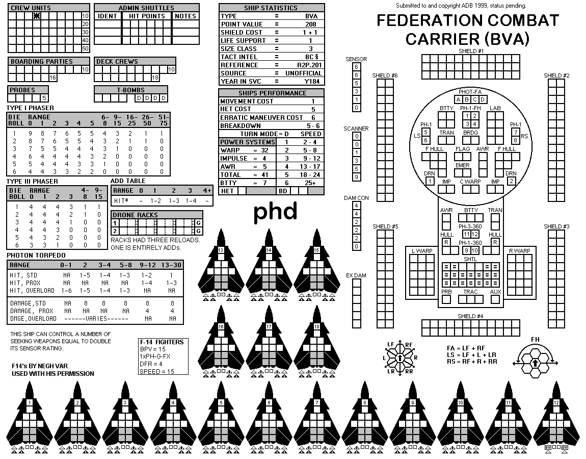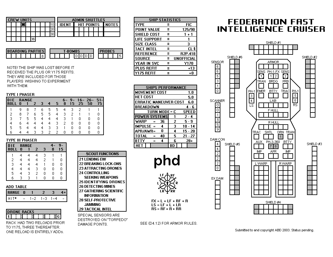and the ADDs represent the Y175 refit. NOTE: On most SSDs the fighter/shuttles have shaded boxes, these represent the crippled the status of the fighter/shuttle. NOTE: On some SSDs the crew check-off boxes have a 'B' or 'D' in them, these represent the crew units that are Boarding Parties or Deck Crews. |