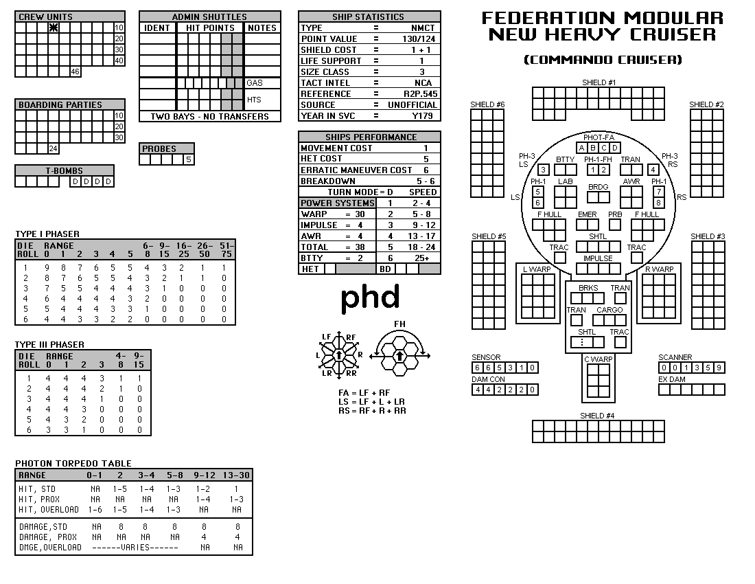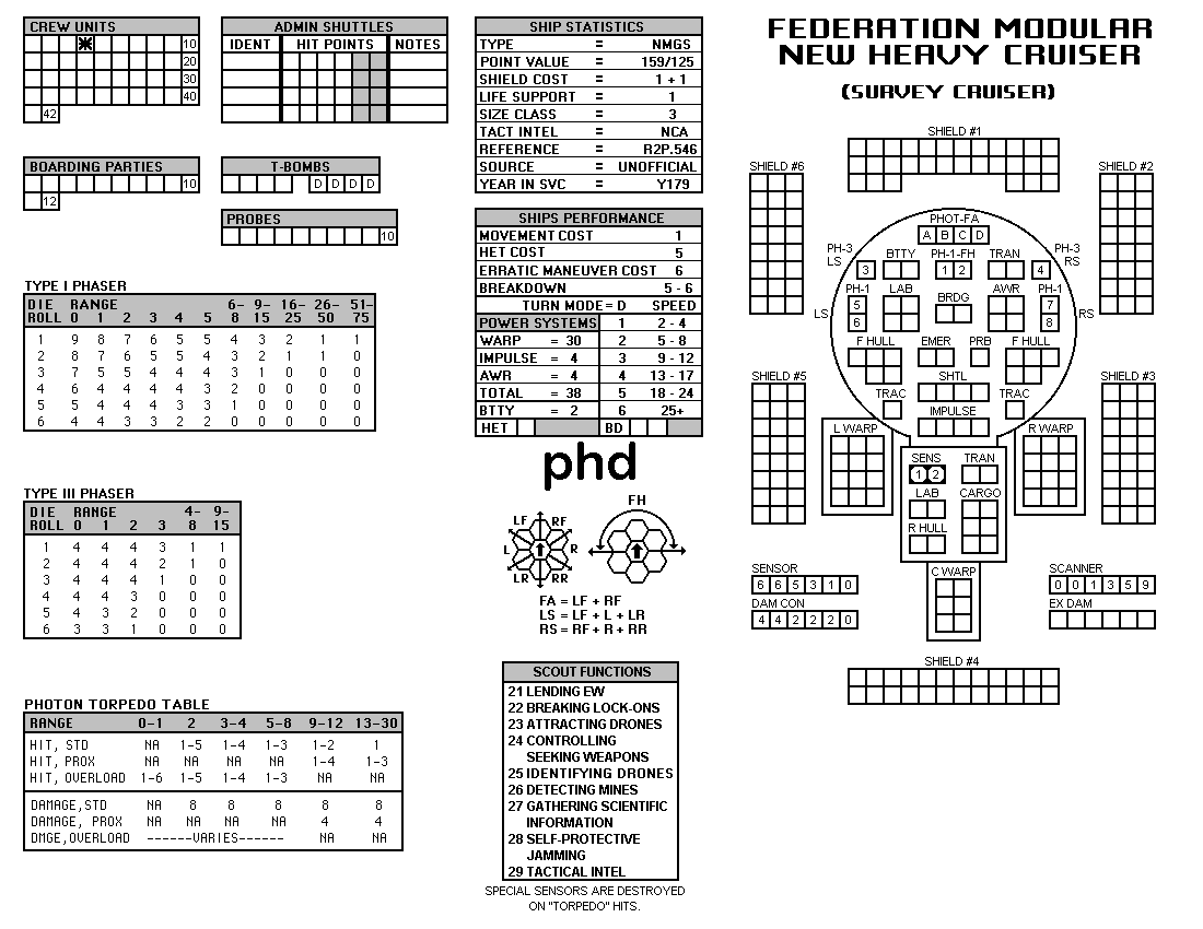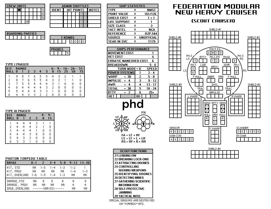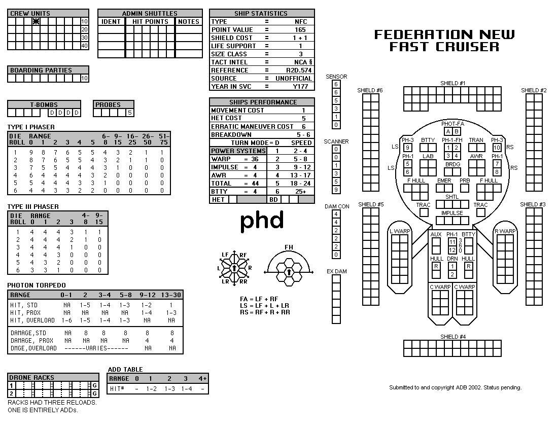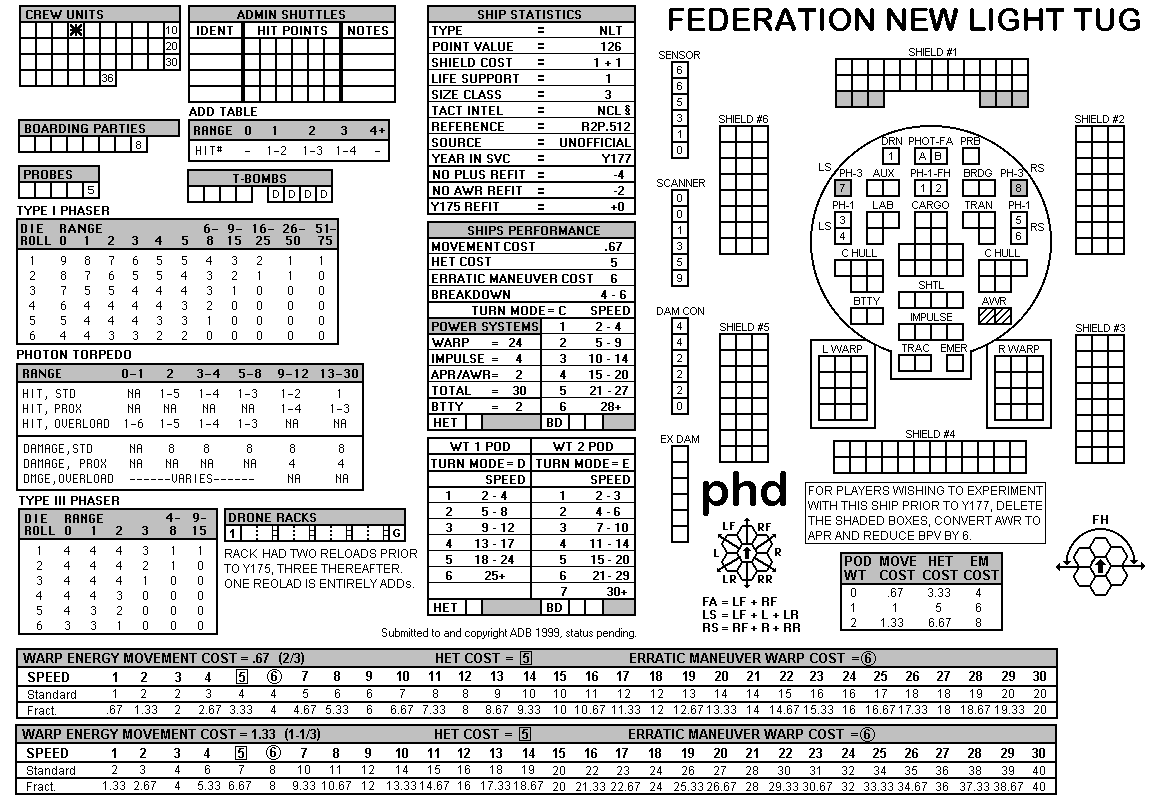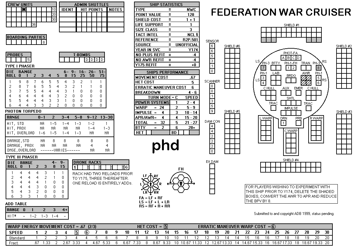and the ADDs represent the Y175 refit. NOTE: On most SSDs the fighter/shuttles have shaded boxes, these represent the crippled the status of the fighter/shuttle. NOTE: On some SSDs the crew check-off boxes have a 'B' or 'D' in them, these represent the crew units that are Boarding Parties or Deck Crews. |