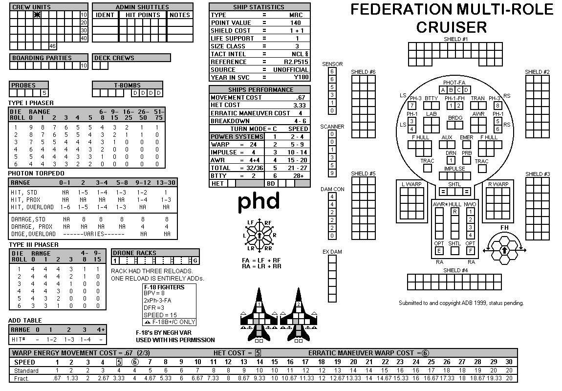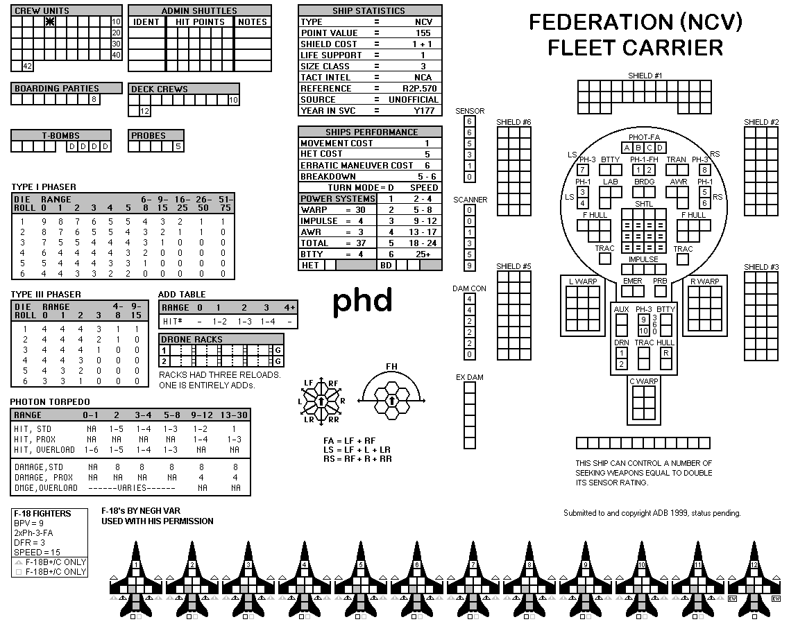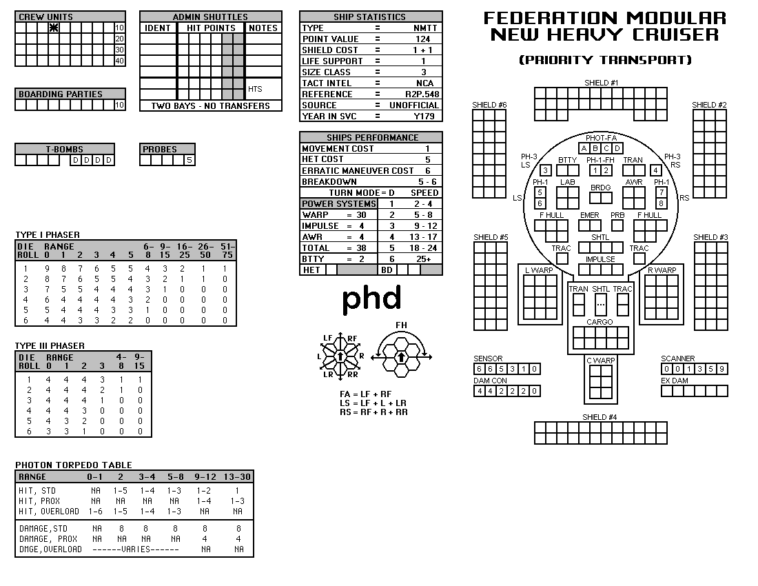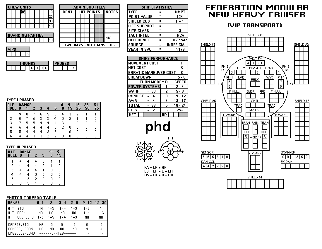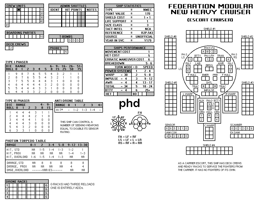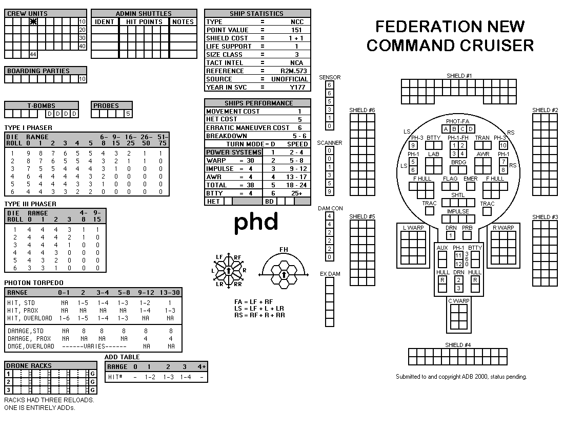 and the ADDs represent the Y175 refit. NOTE: On most SSDs the fighter/shuttles have shaded boxes, these represent the crippled the status of the fighter/shuttle. NOTE: On some SSDs the crew check-off boxes have a 'B' or 'D' in them, these represent the crew units that are Boarding Parties or Deck Crews. |