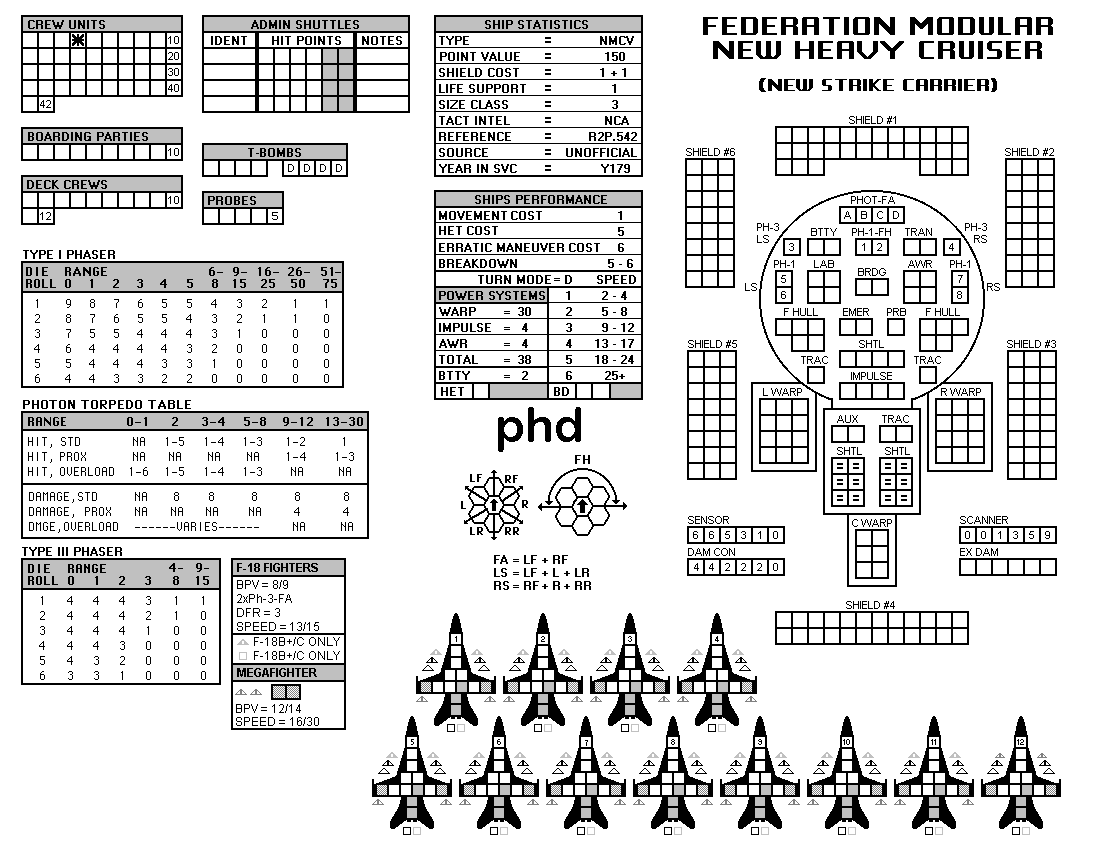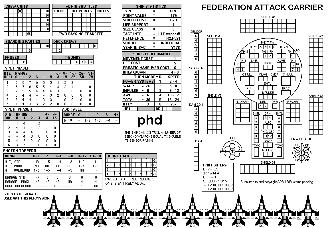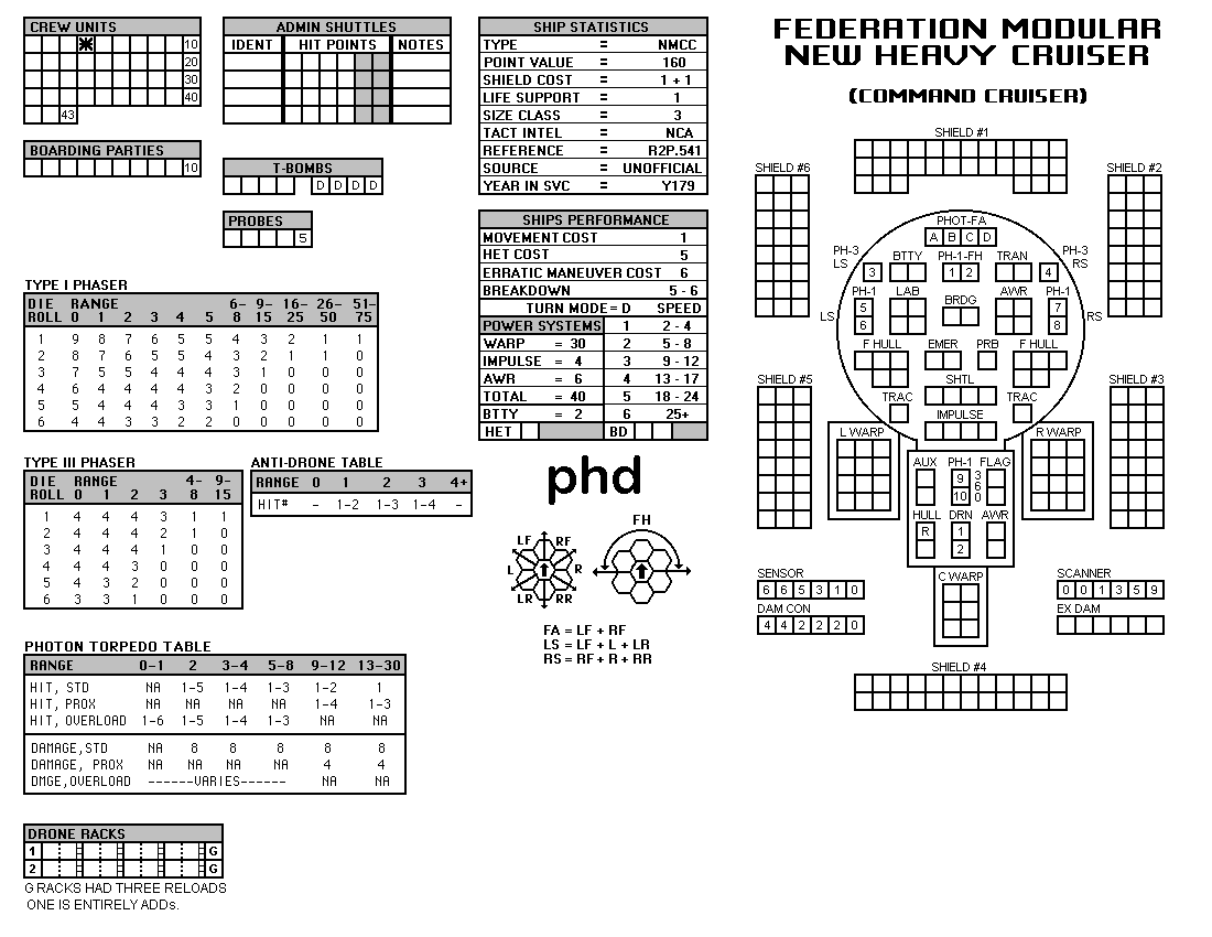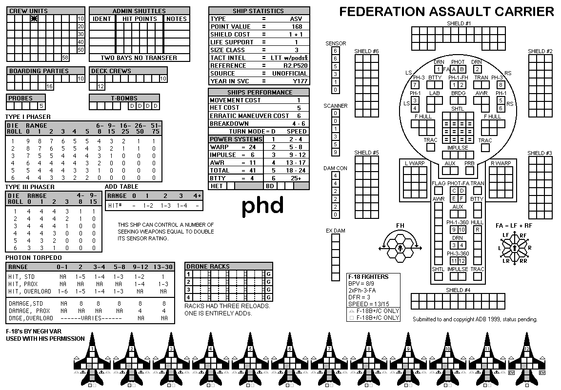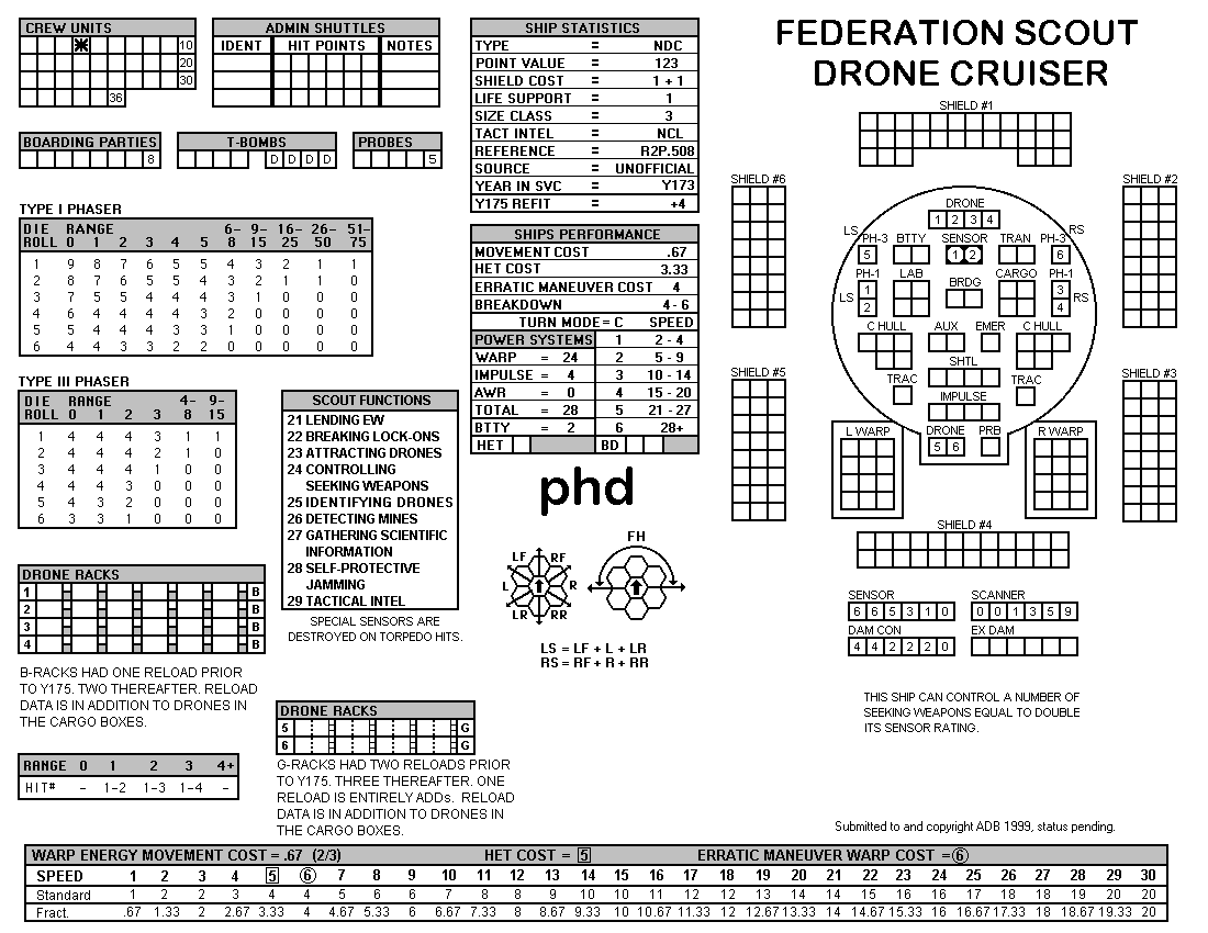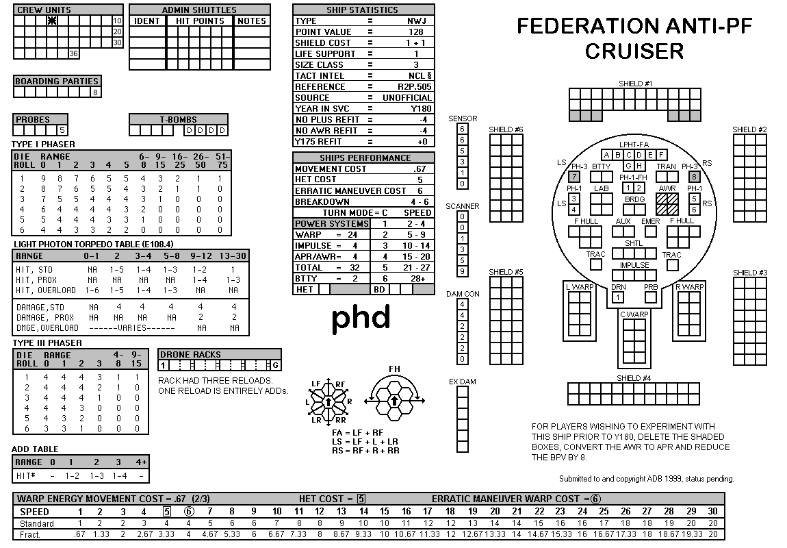 and the ADDs represent the Y175 refit. NOTE: On most SSDs the fighter/shuttles have shaded boxes, these represent the crippled the status of the fighter/shuttle. NOTE: On some SSDs the crew check-off boxes have a 'B' or 'D' in them, these represent the crew units that are Boarding Parties or Deck Crews. |