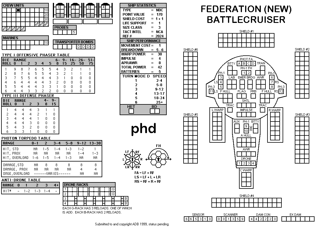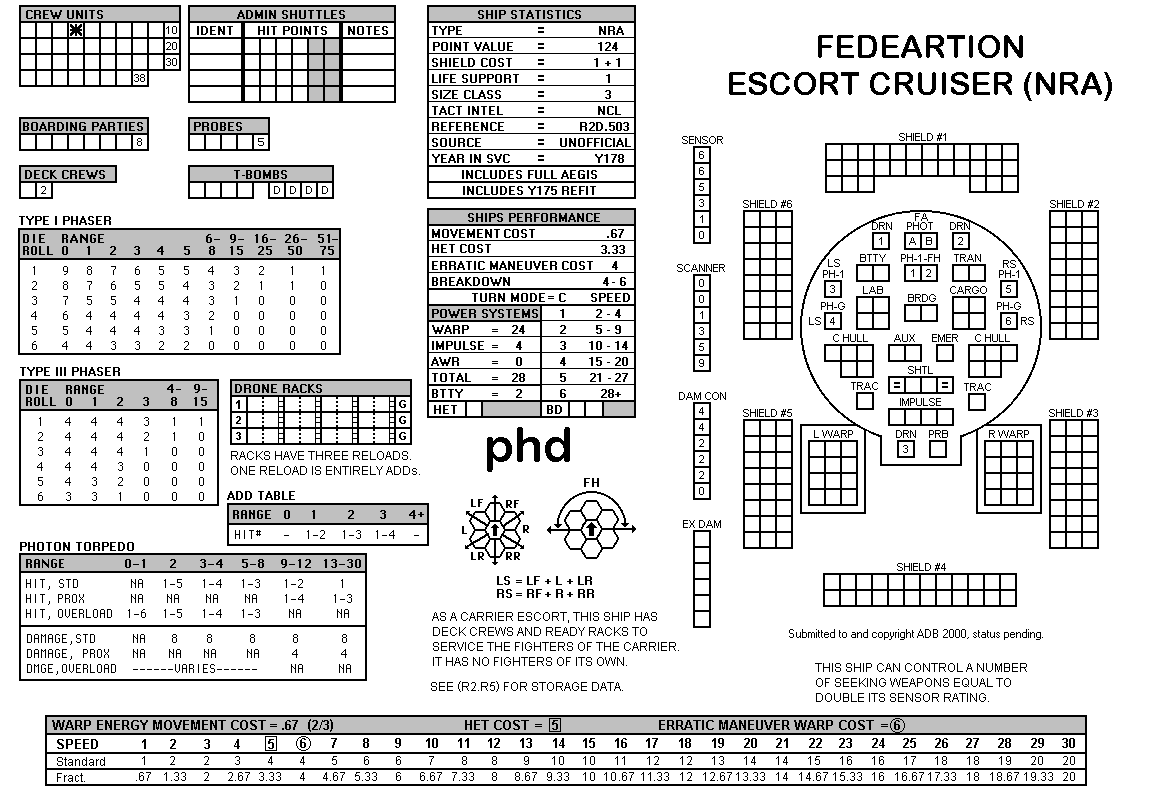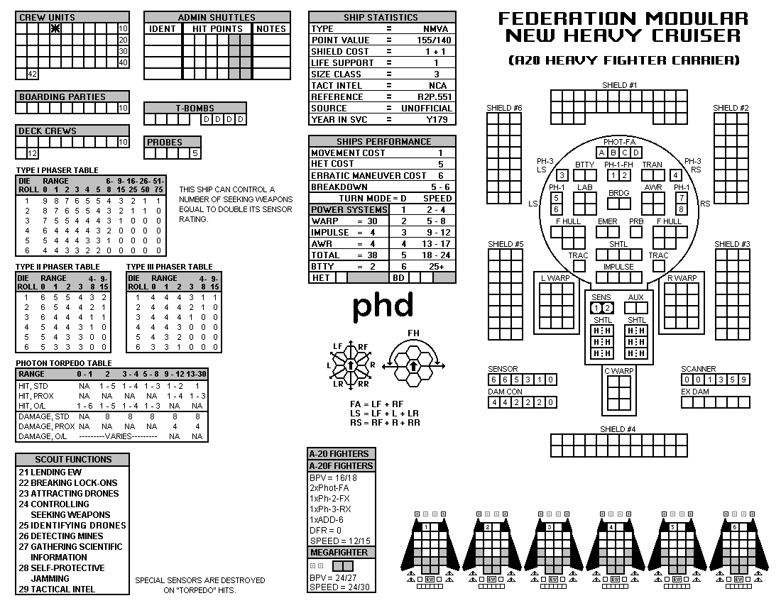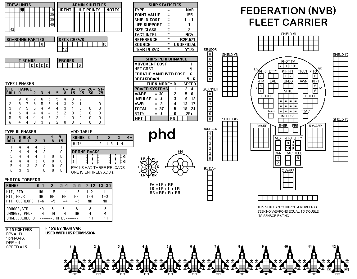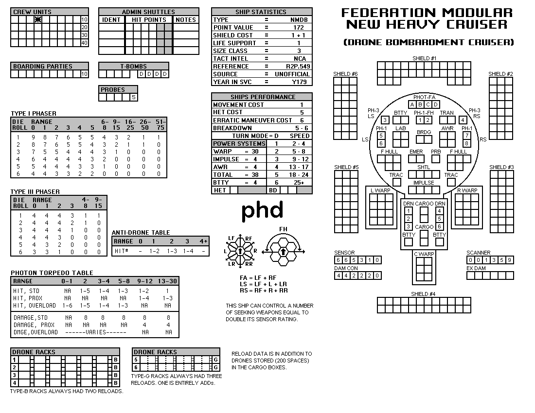 and the ADDs represent the Y175 refit. NOTE: On most SSDs the fighter/shuttles have shaded boxes, these represent the crippled the status of the fighter/shuttle. NOTE: On some SSDs the crew check-off boxes have a 'B' or 'D' in them, these represent the crew units that are Boarding Parties or Deck Crews. |
