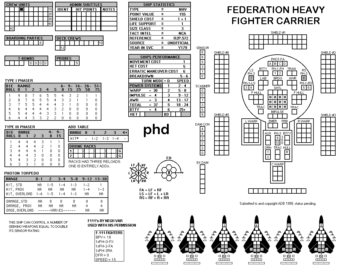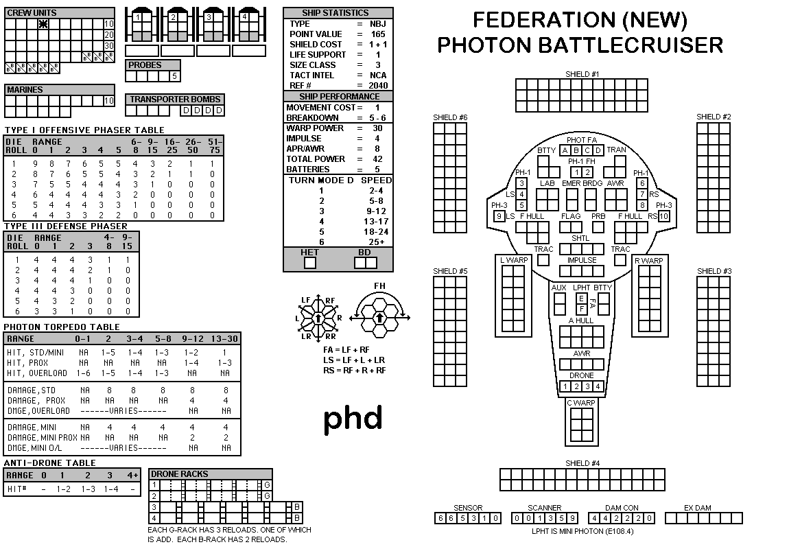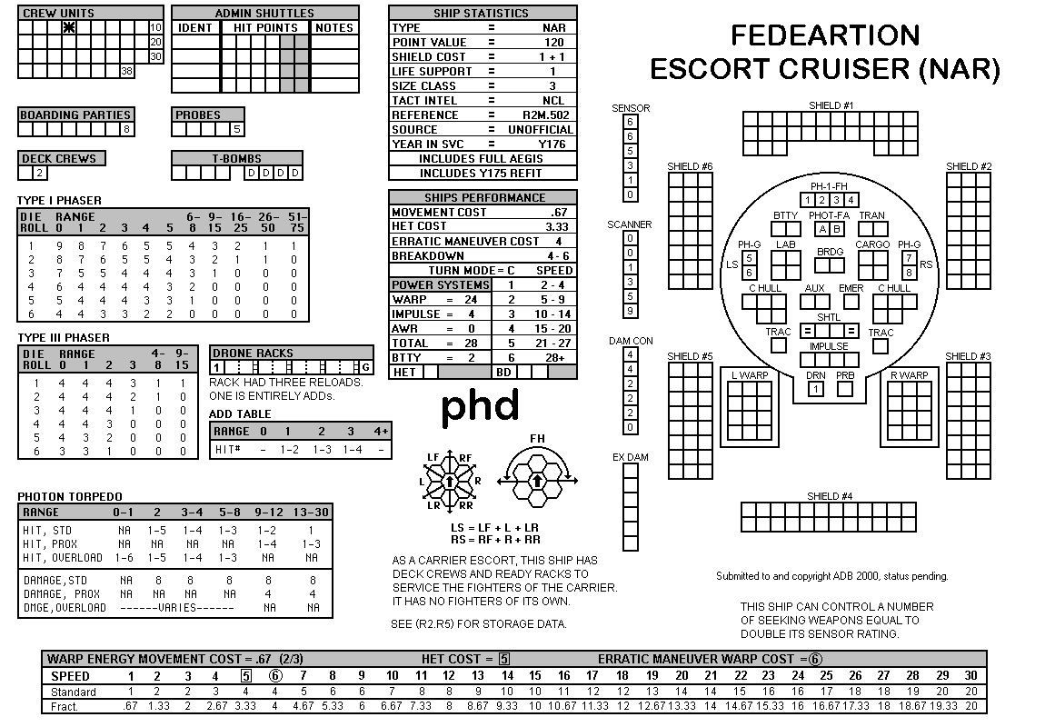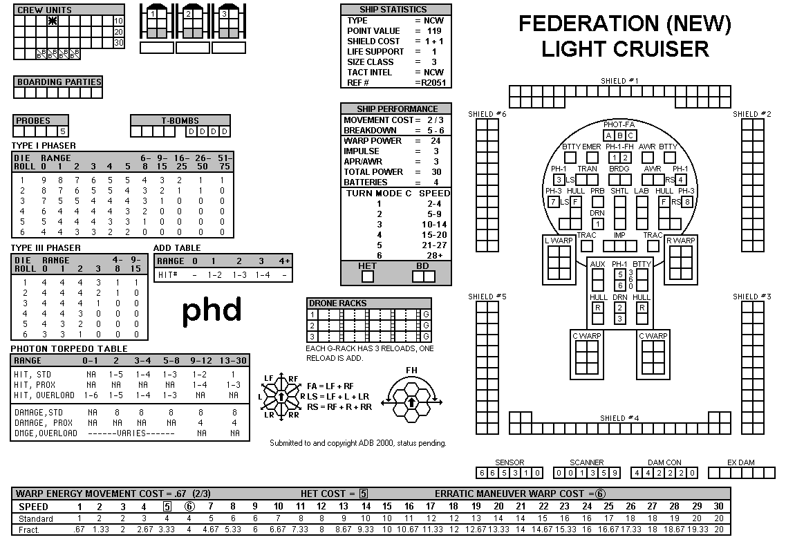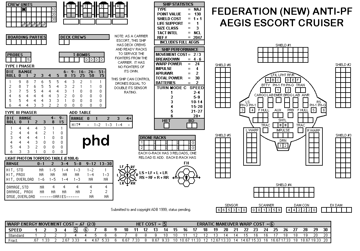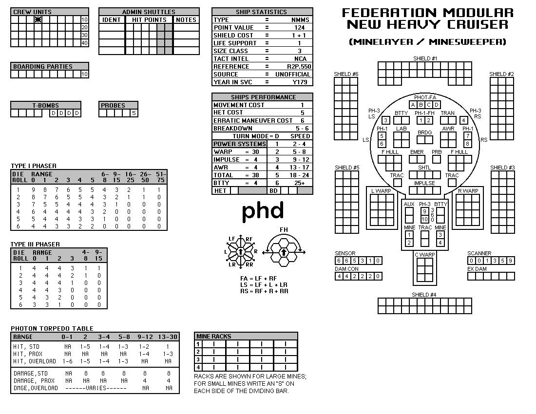 and the ADDs represent the Y175 refit. NOTE: On most SSDs the fighter/shuttles have shaded boxes, these represent the crippled the status of the fighter/shuttle. NOTE: On some SSDs the crew check-off boxes have a 'B' or 'D' in them, these represent the crew units that are Boarding Parties or Deck Crews. |