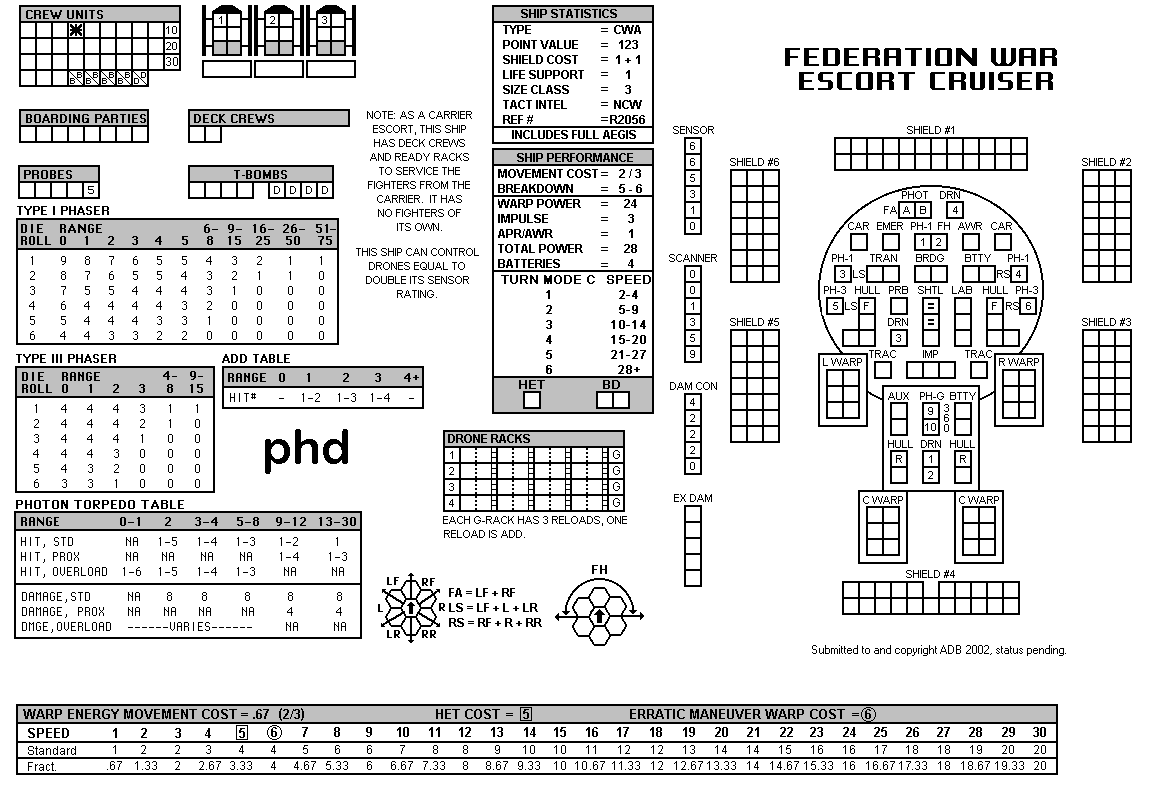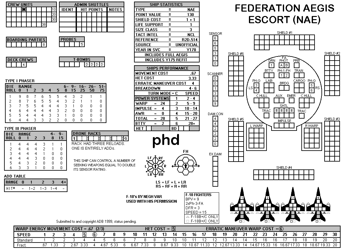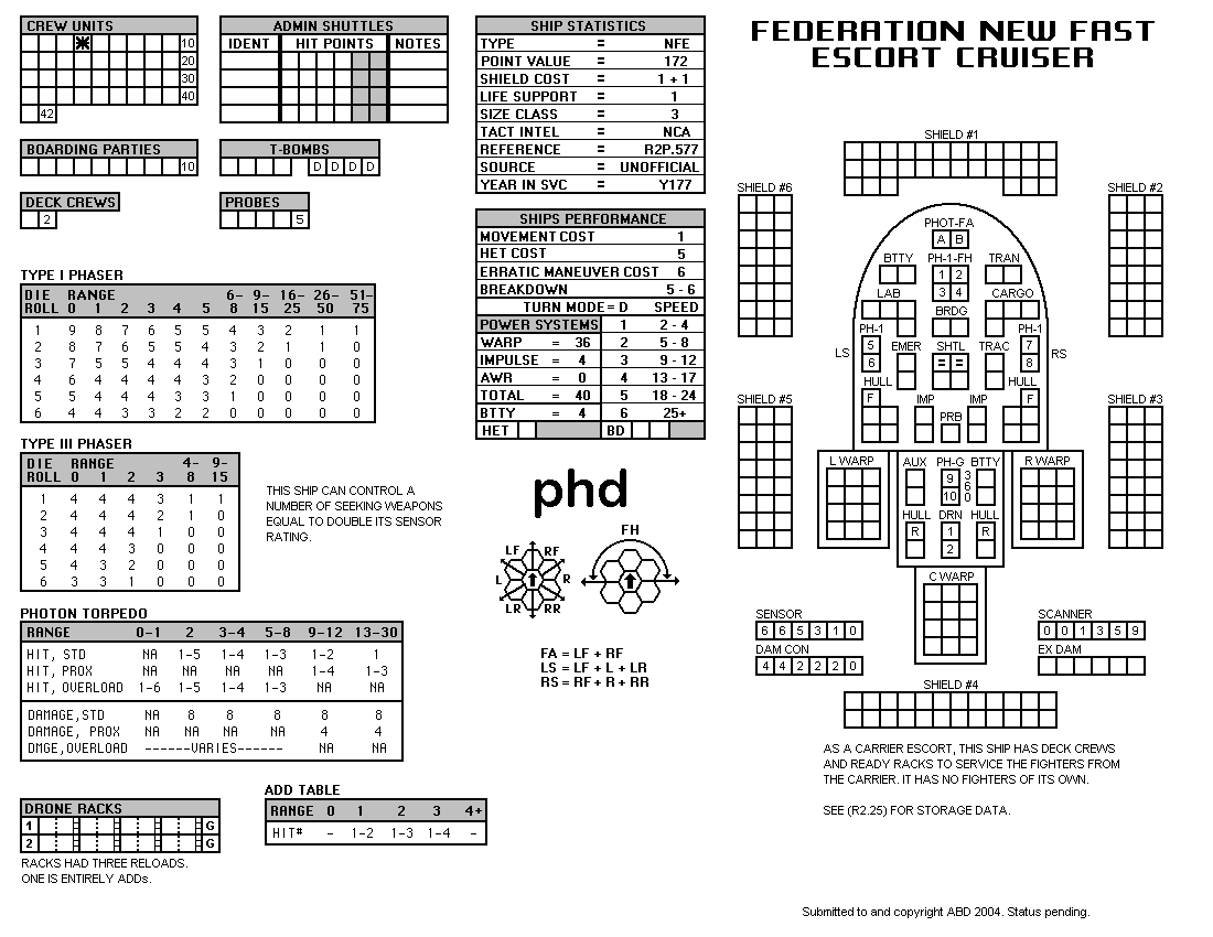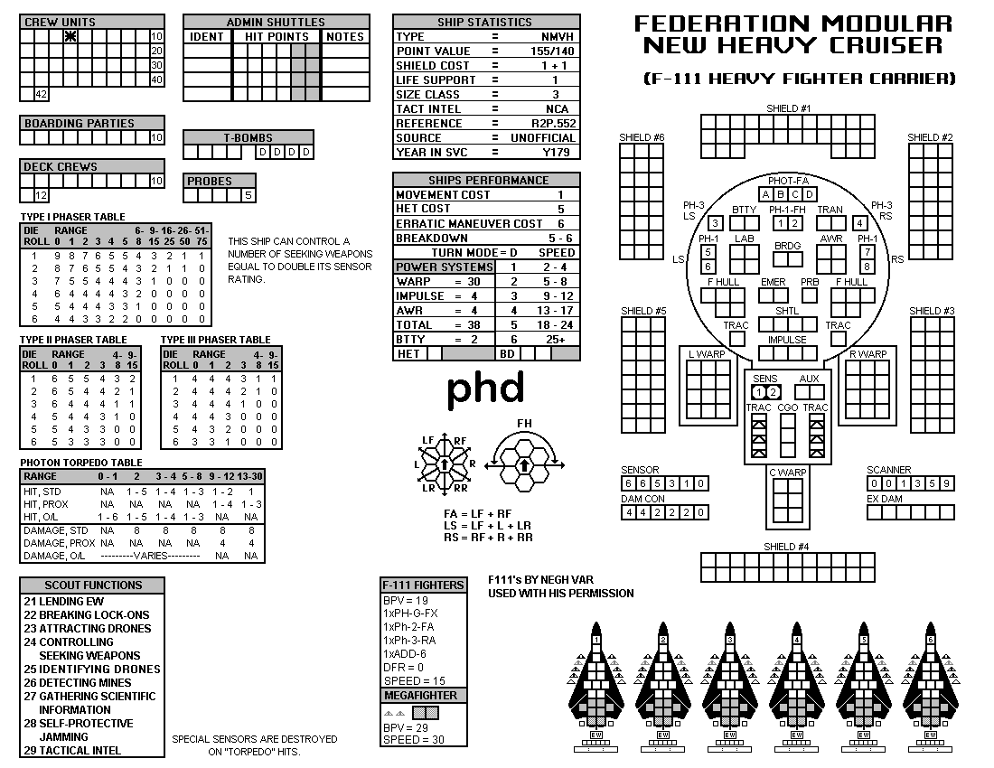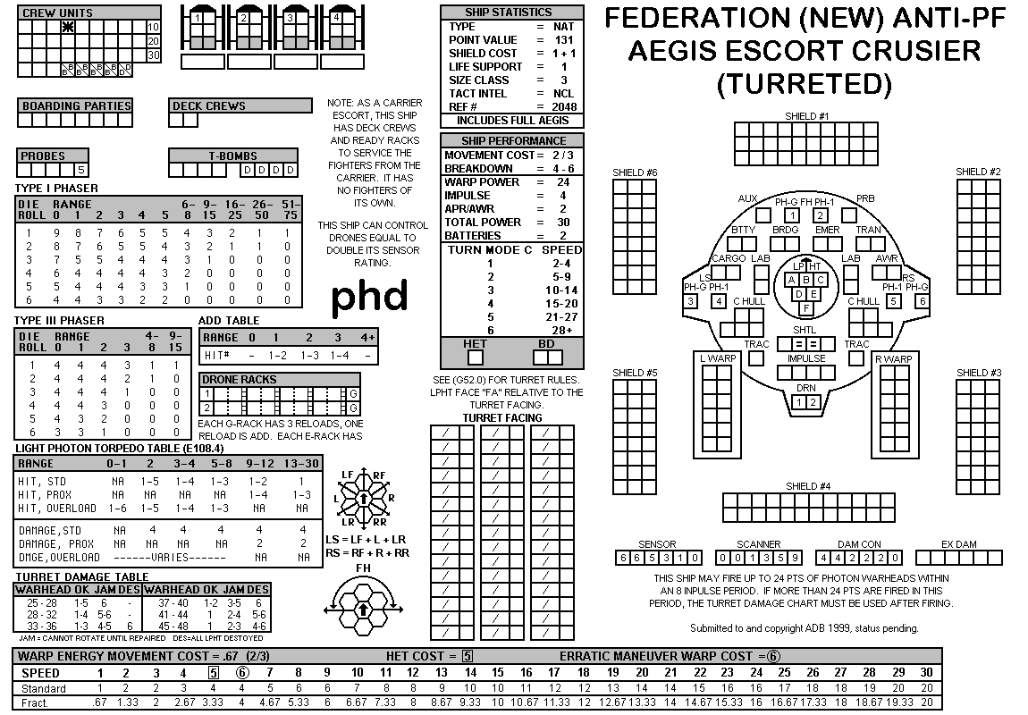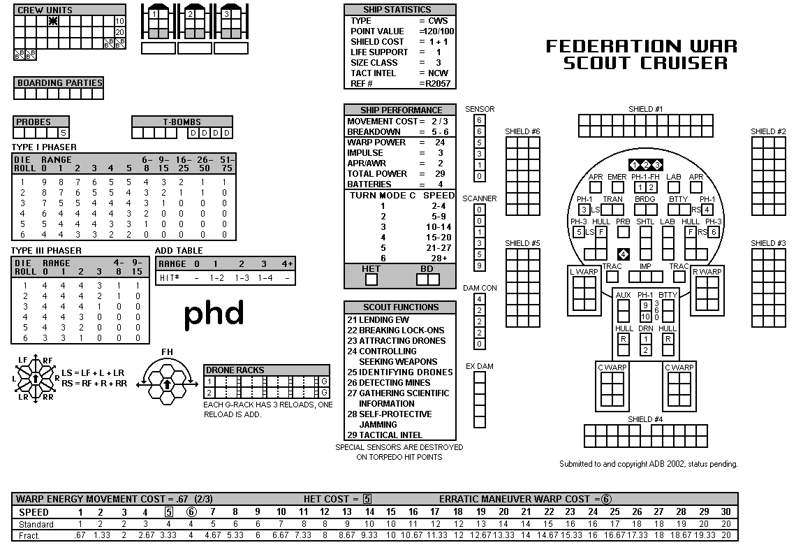 and the ADDs represent the Y175 refit. NOTE: On most SSDs the fighter/shuttles have shaded boxes, these represent the crippled the status of the fighter/shuttle. NOTE: On some SSDs the crew check-off boxes have a 'B' or 'D' in them, these represent the crew units that are Boarding Parties or Deck Crews. |