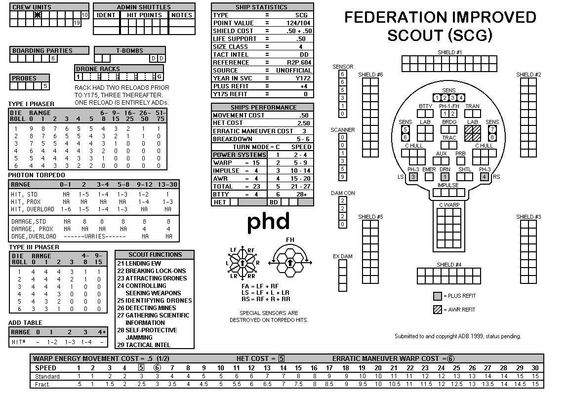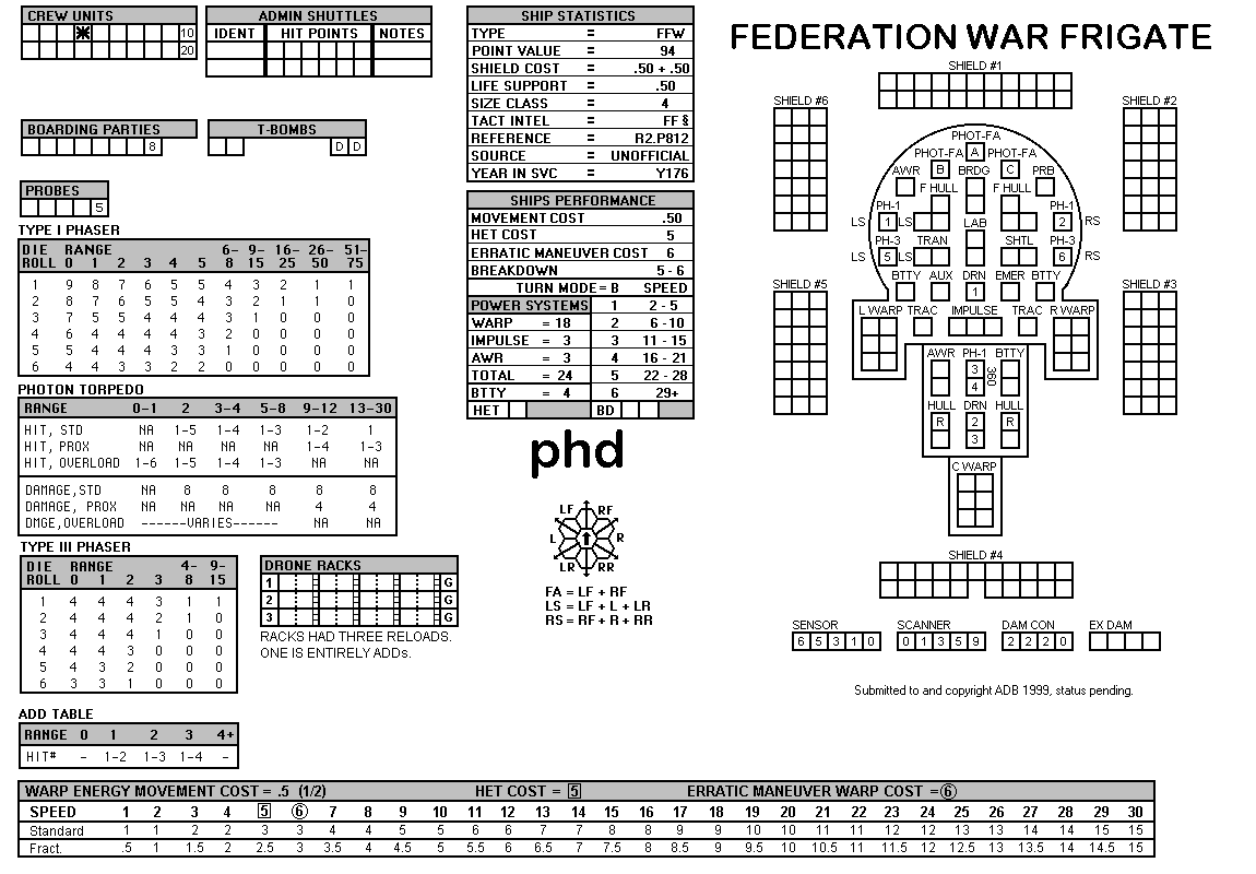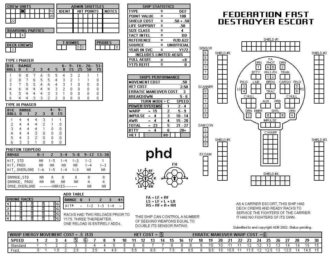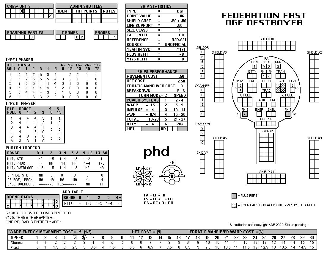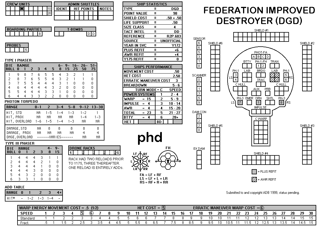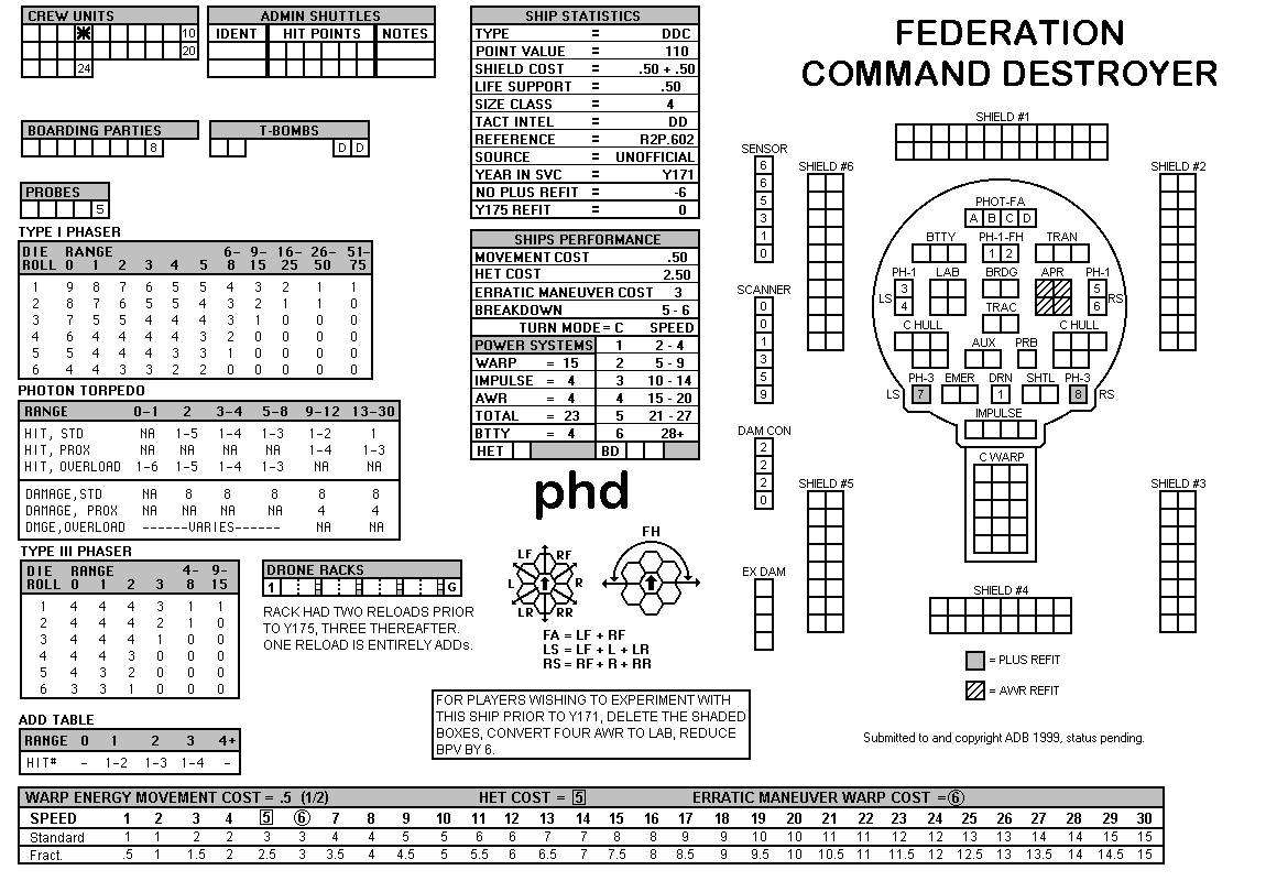 and the ADDs represent the Y175 refit. NOTE: On most SSDs the fighter/shuttles have shaded boxes, these represent the crippled the status of the fighter/shuttle. NOTE: On some SSDs the crew check-off boxes have a 'B' or 'D' in them, these represent the crew units that are Boarding Parties or Deck Crews. |