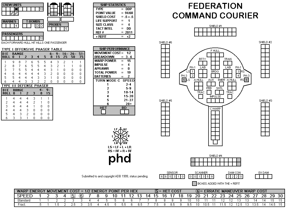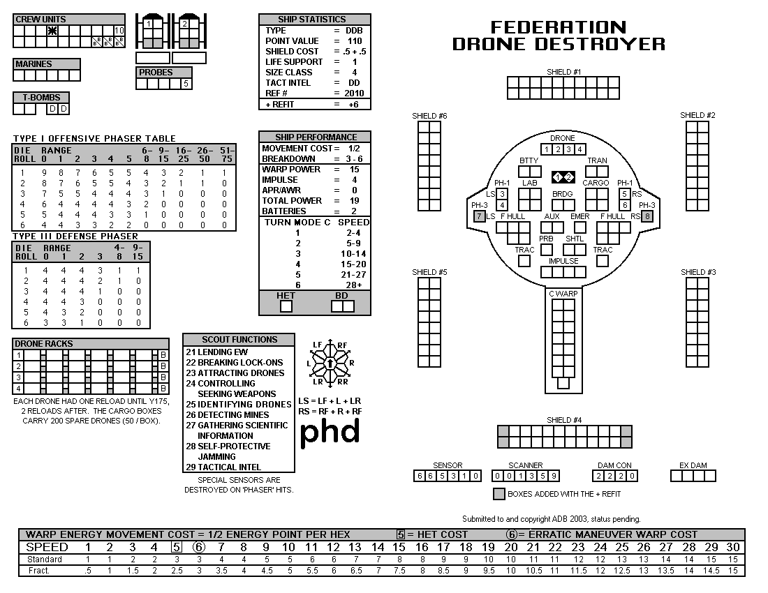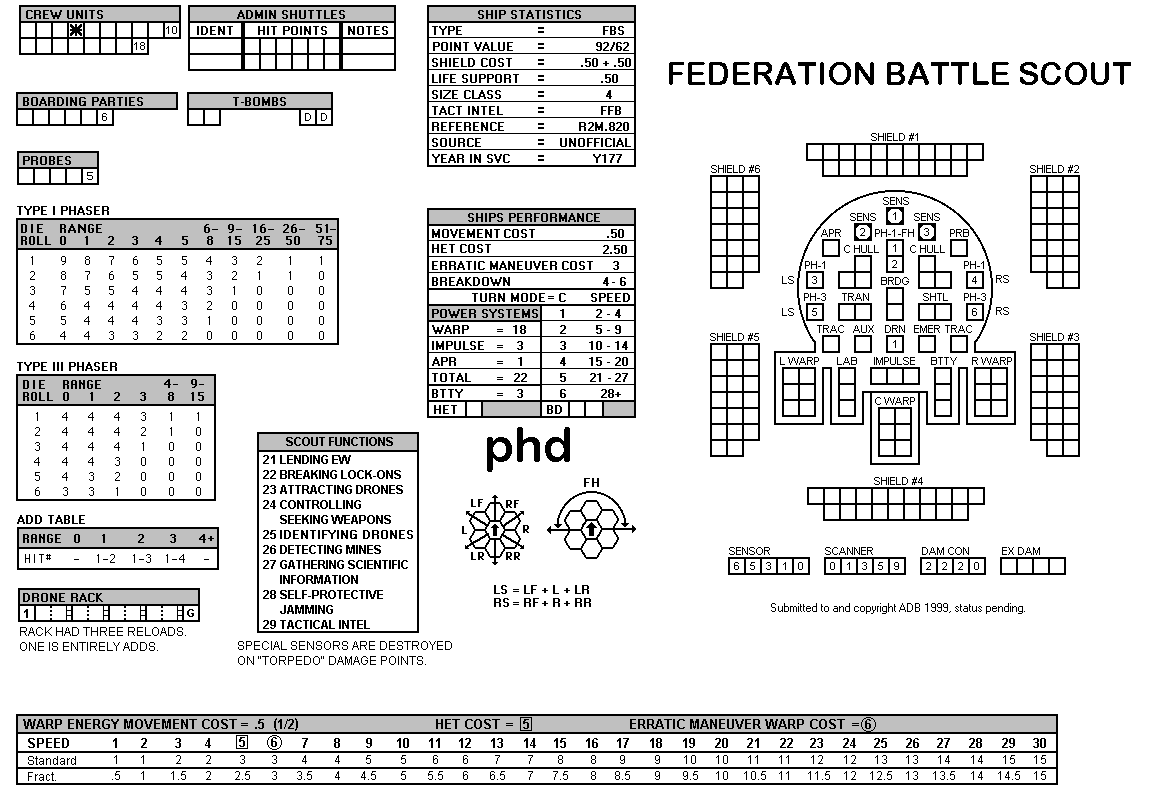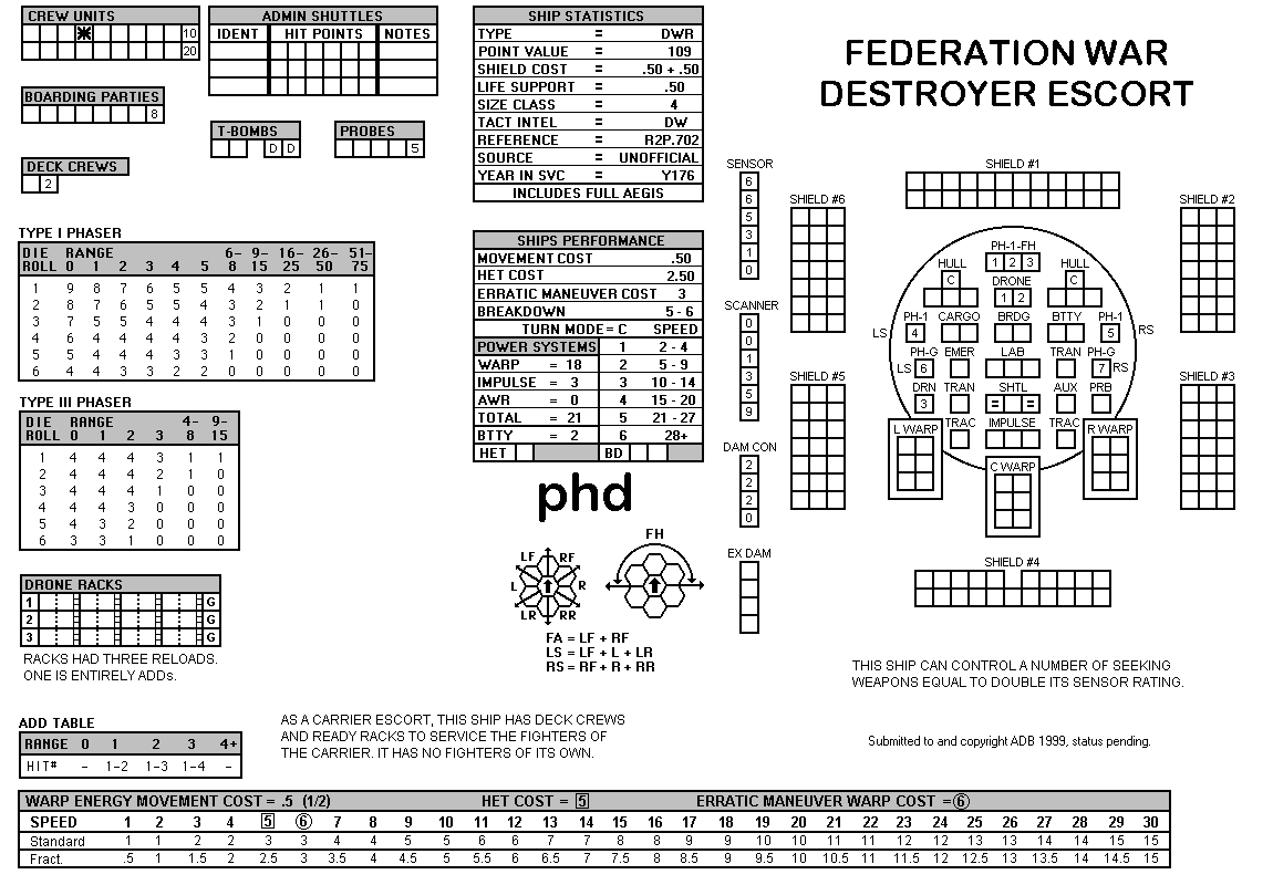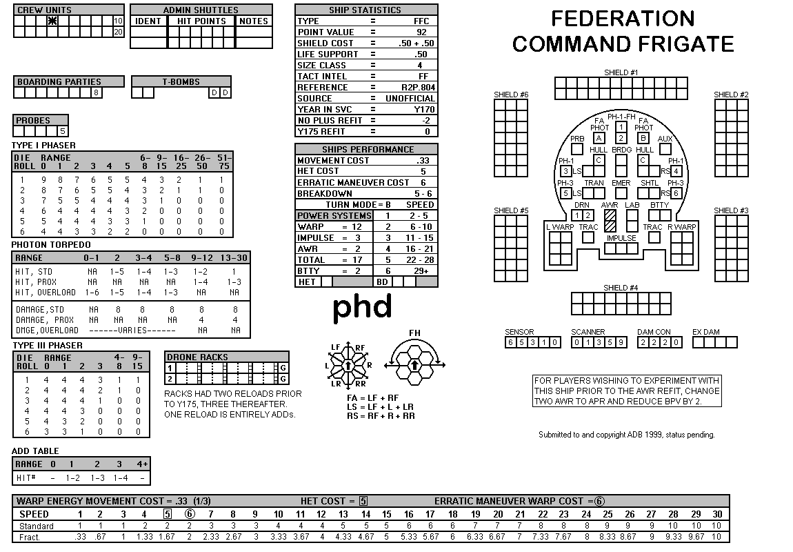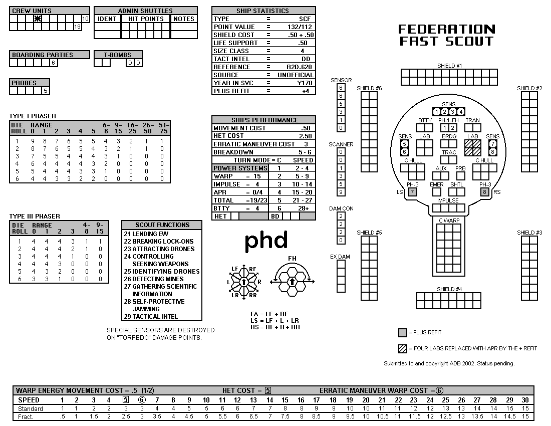 and the ADDs represent the Y175 refit. NOTE: On most SSDs the fighter/shuttles have shaded boxes, these represent the crippled the status of the fighter/shuttle. NOTE: On some SSDs the crew check-off boxes have a 'B' or 'D' in them, these represent the crew units that are Boarding Parties or Deck Crews. |