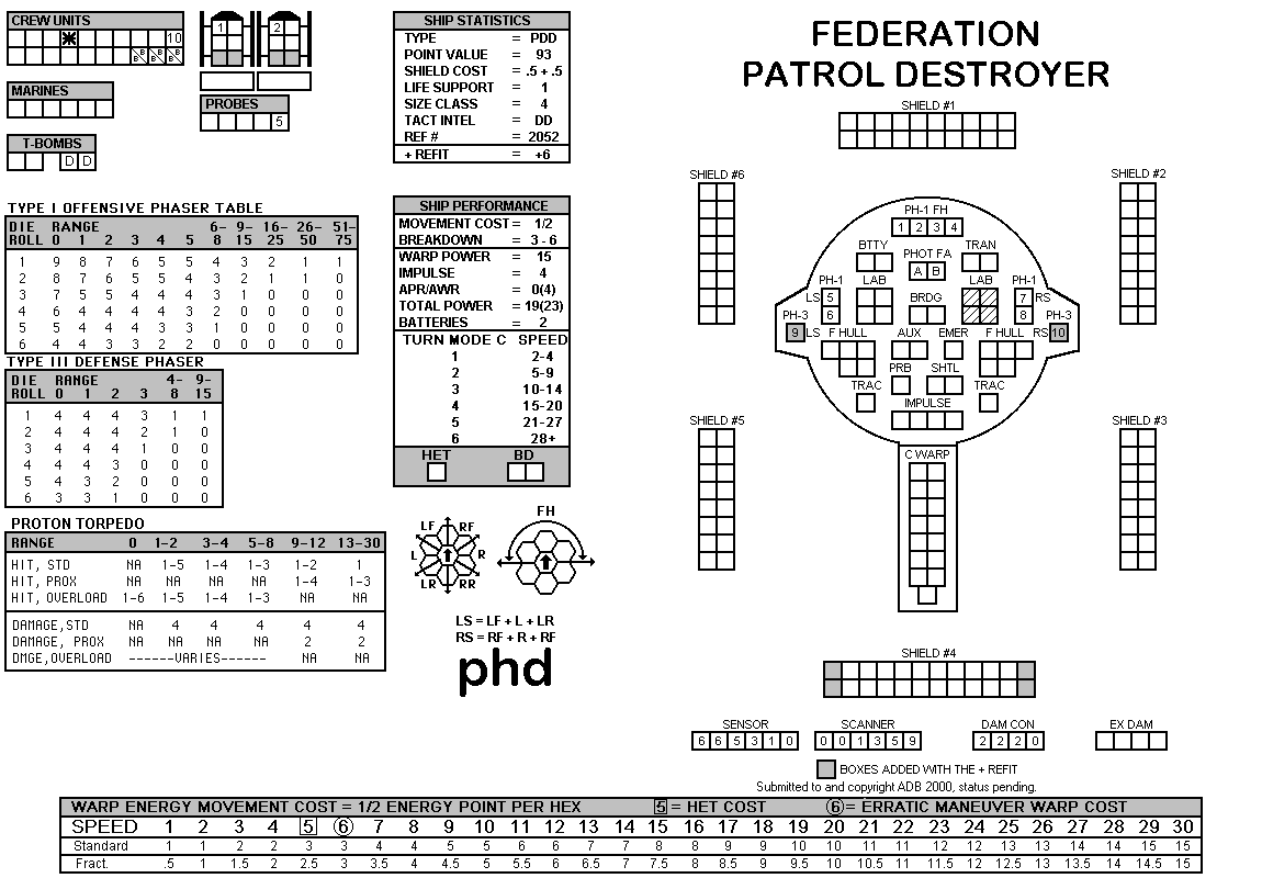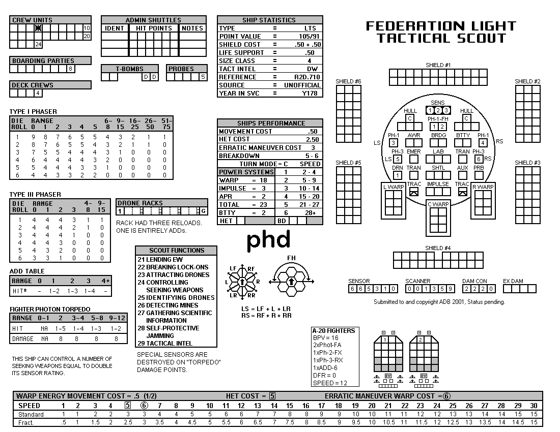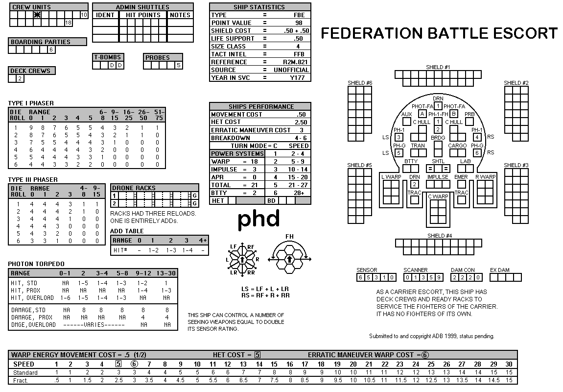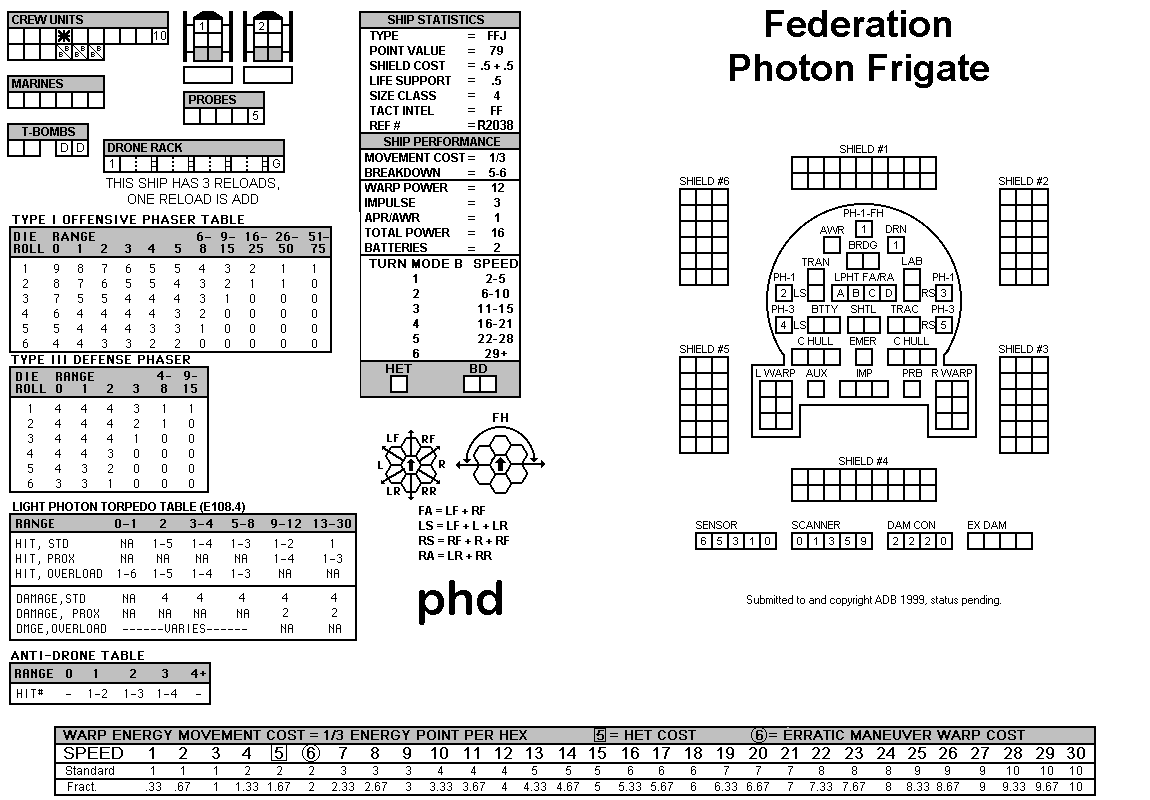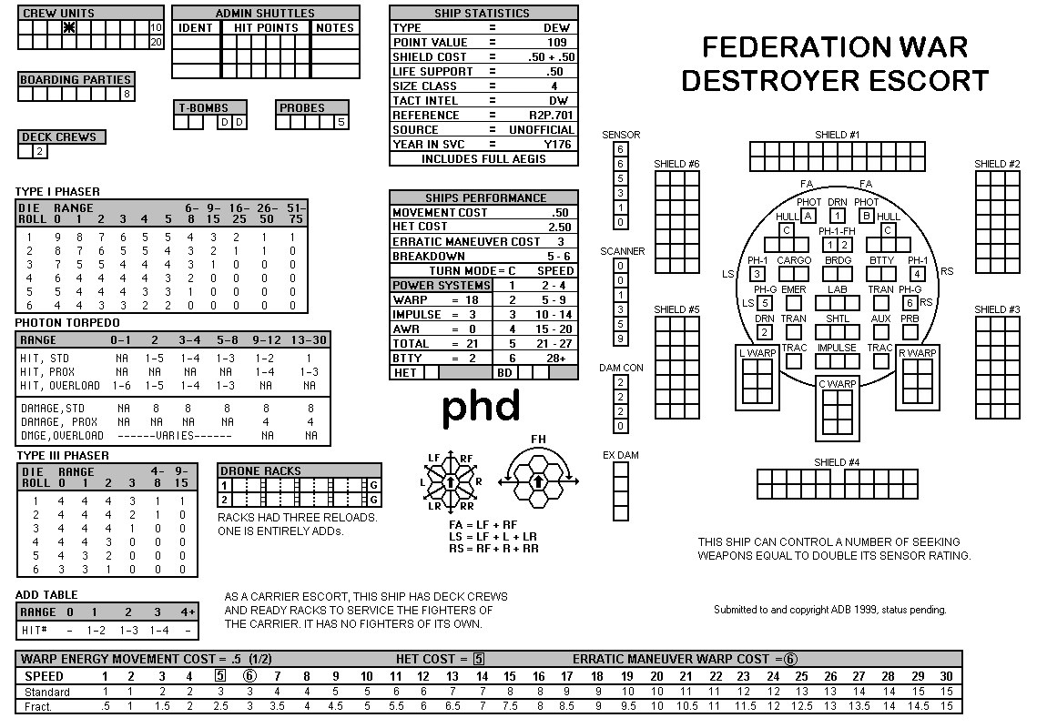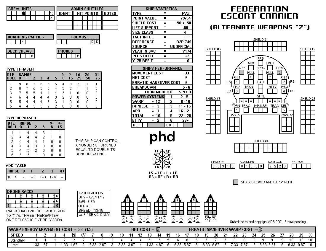 and the ADDs represent the Y175 refit. NOTE: On most SSDs the fighter/shuttles have shaded boxes, these represent the crippled the status of the fighter/shuttle. NOTE: On some SSDs the crew check-off boxes have a 'B' or 'D' in them, these represent the crew units that are Boarding Parties or Deck Crews. |
