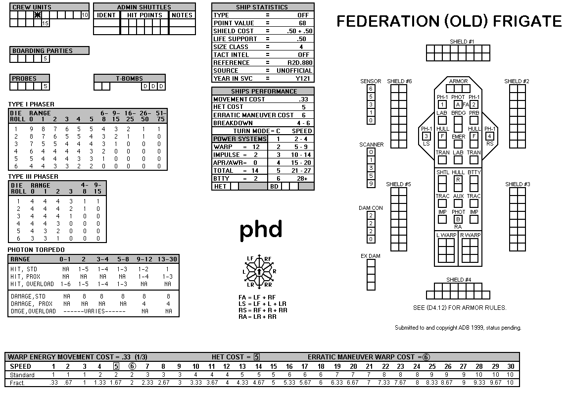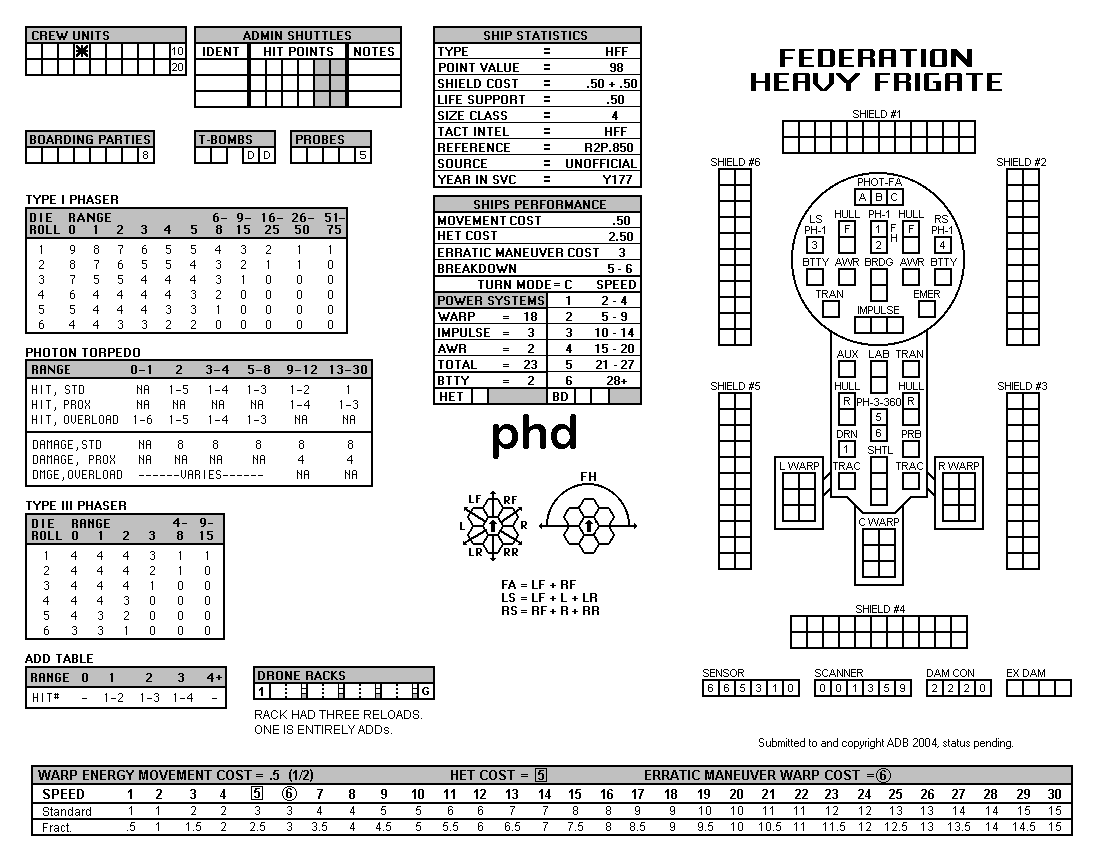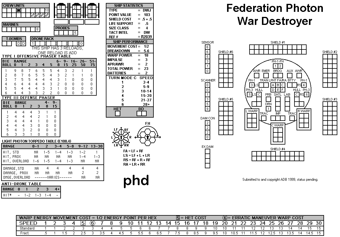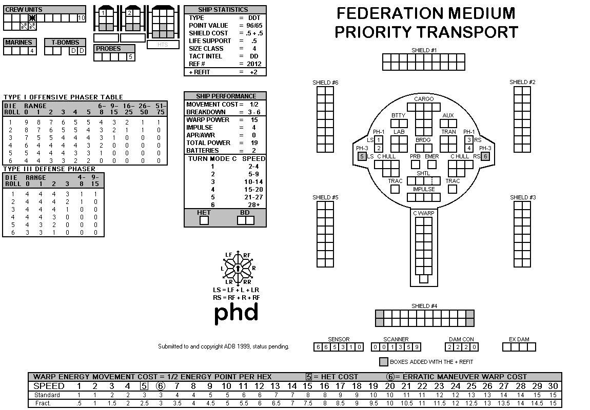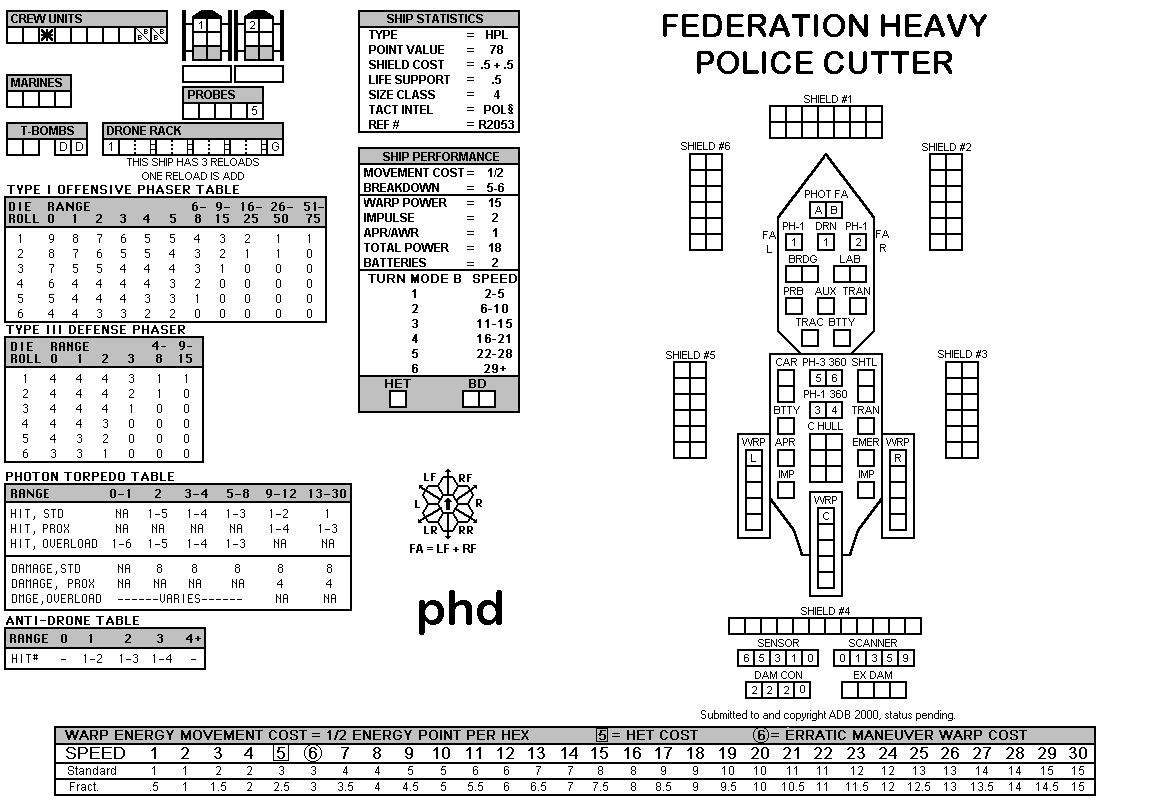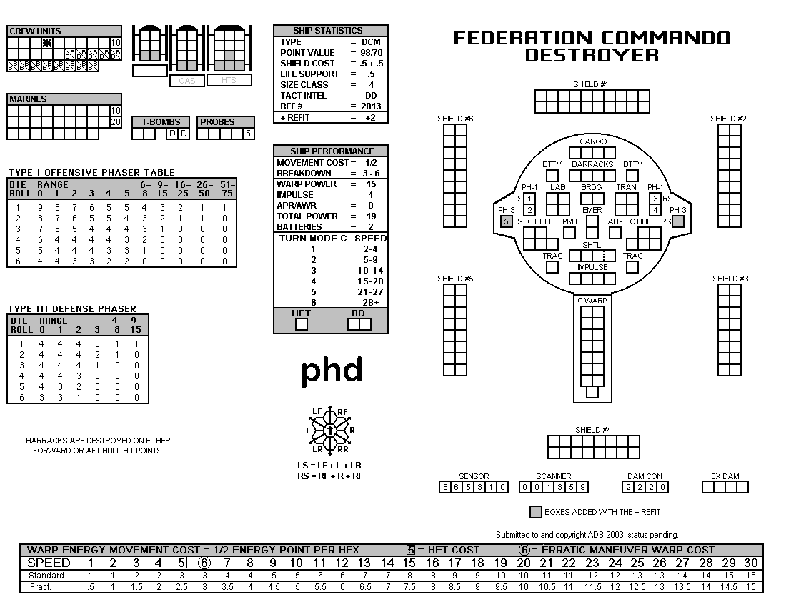 and the ADDs represent the Y175 refit. NOTE: On most SSDs the fighter/shuttles have shaded boxes, these represent the crippled the status of the fighter/shuttle. NOTE: On some SSDs the crew check-off boxes have a 'B' or 'D' in them, these represent the crew units that are Boarding Parties or Deck Crews. |