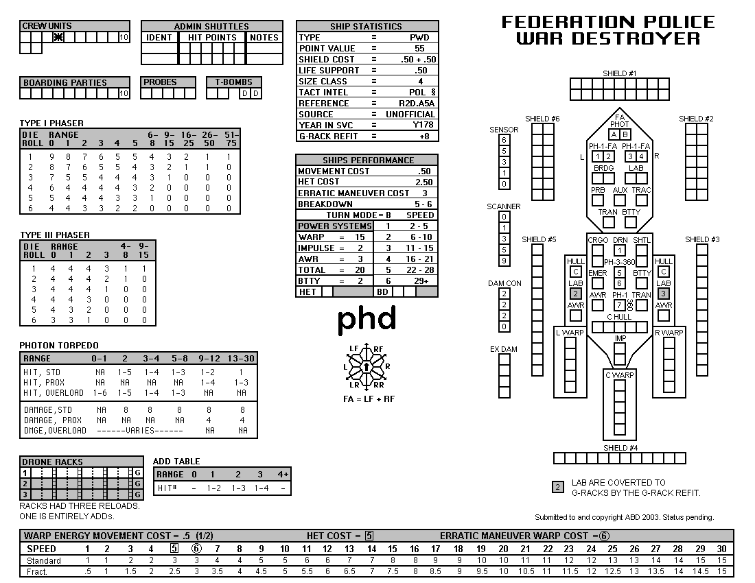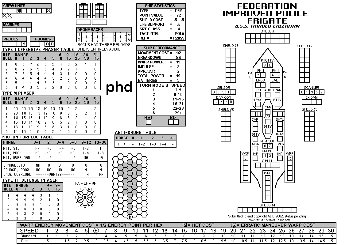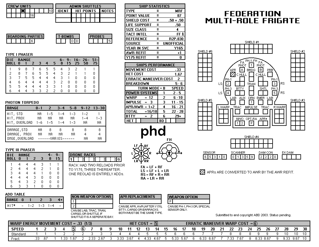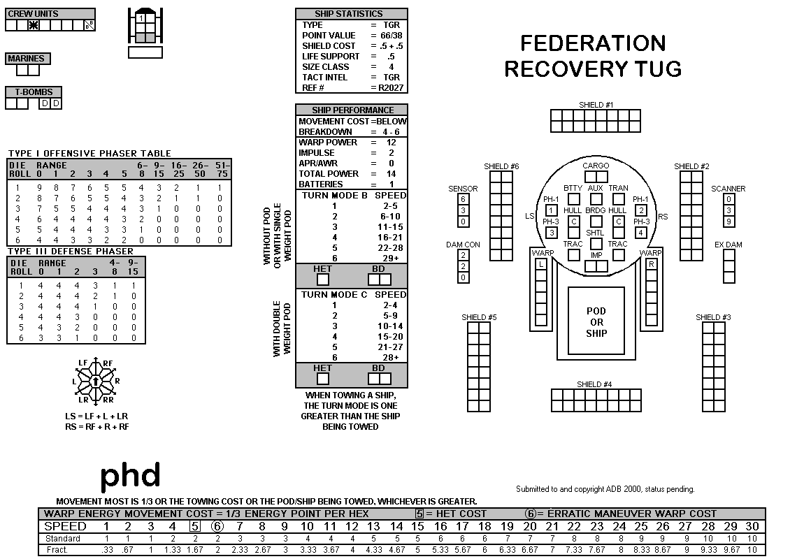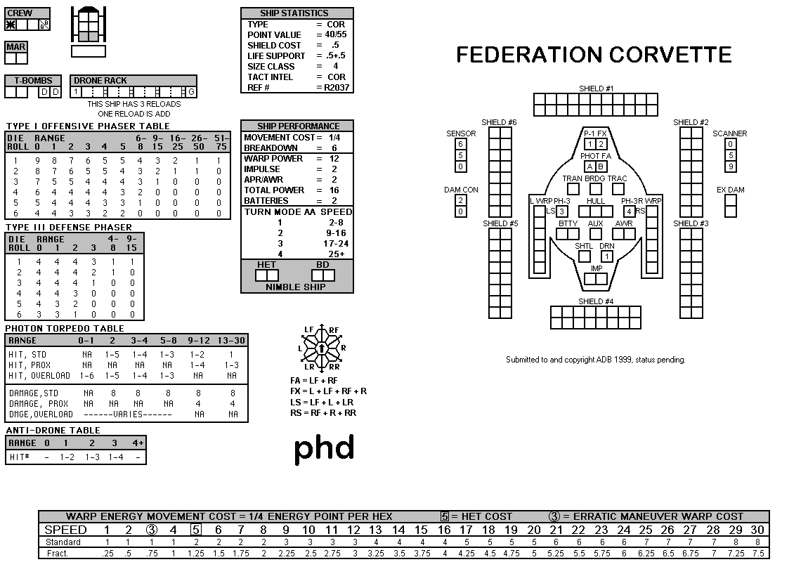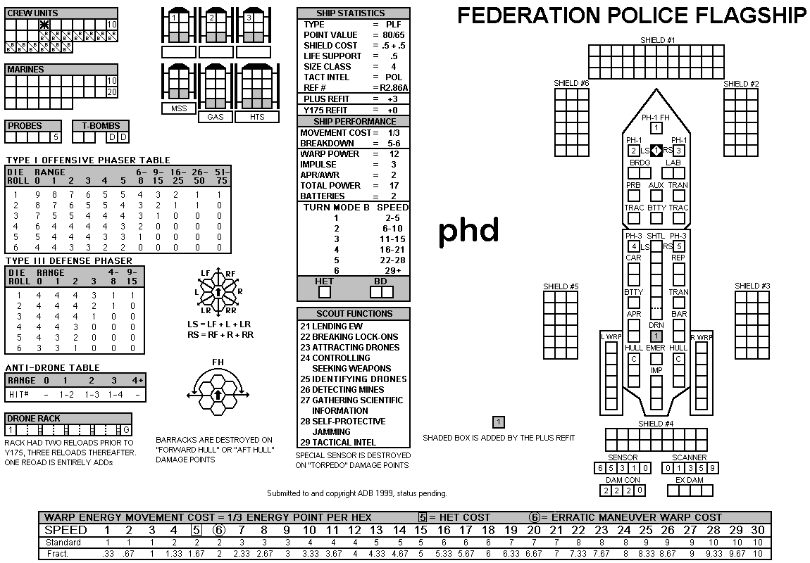 and the ADDs represent the Y175 refit. NOTE: On most SSDs the fighter/shuttles have shaded boxes, these represent the crippled the status of the fighter/shuttle. NOTE: On some SSDs the crew check-off boxes have a 'B' or 'D' in them, these represent the crew units that are Boarding Parties or Deck Crews. |