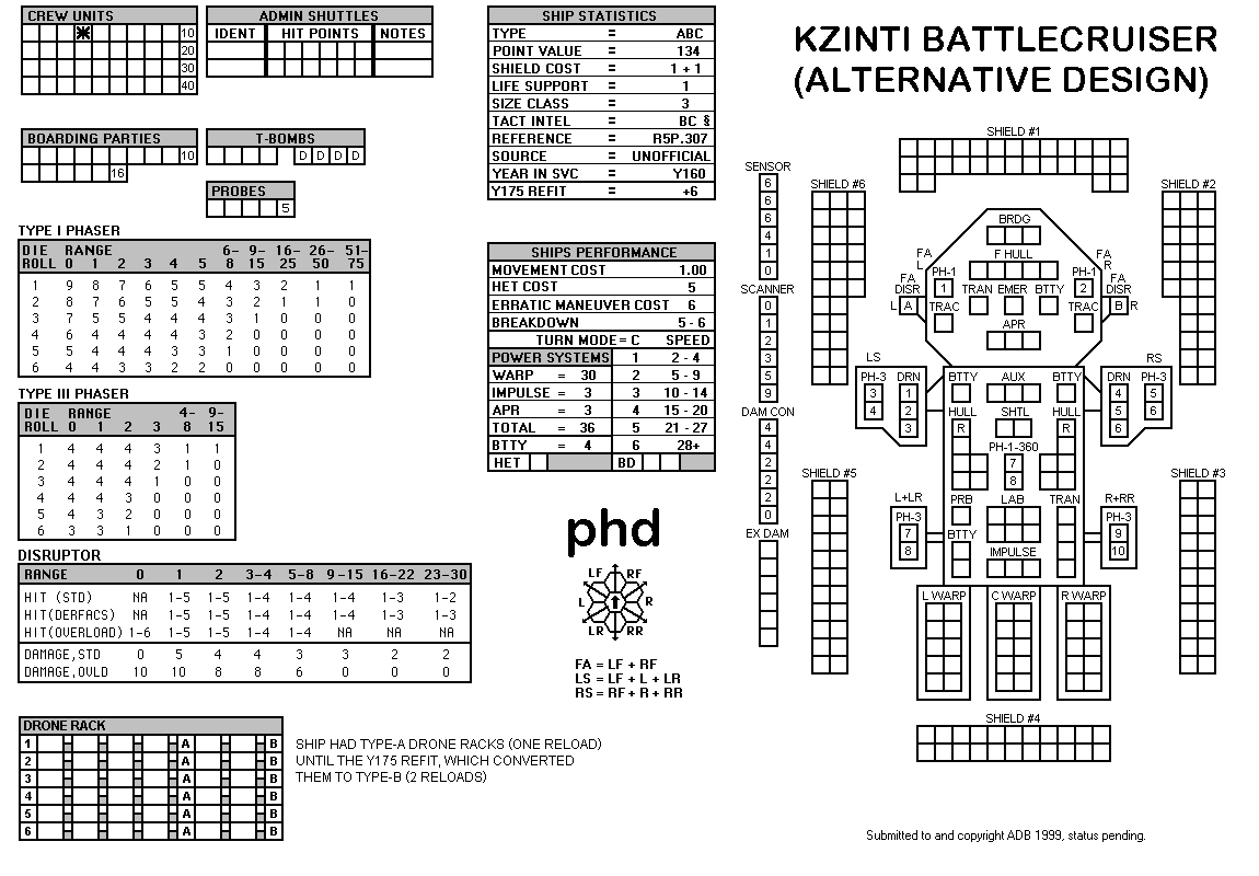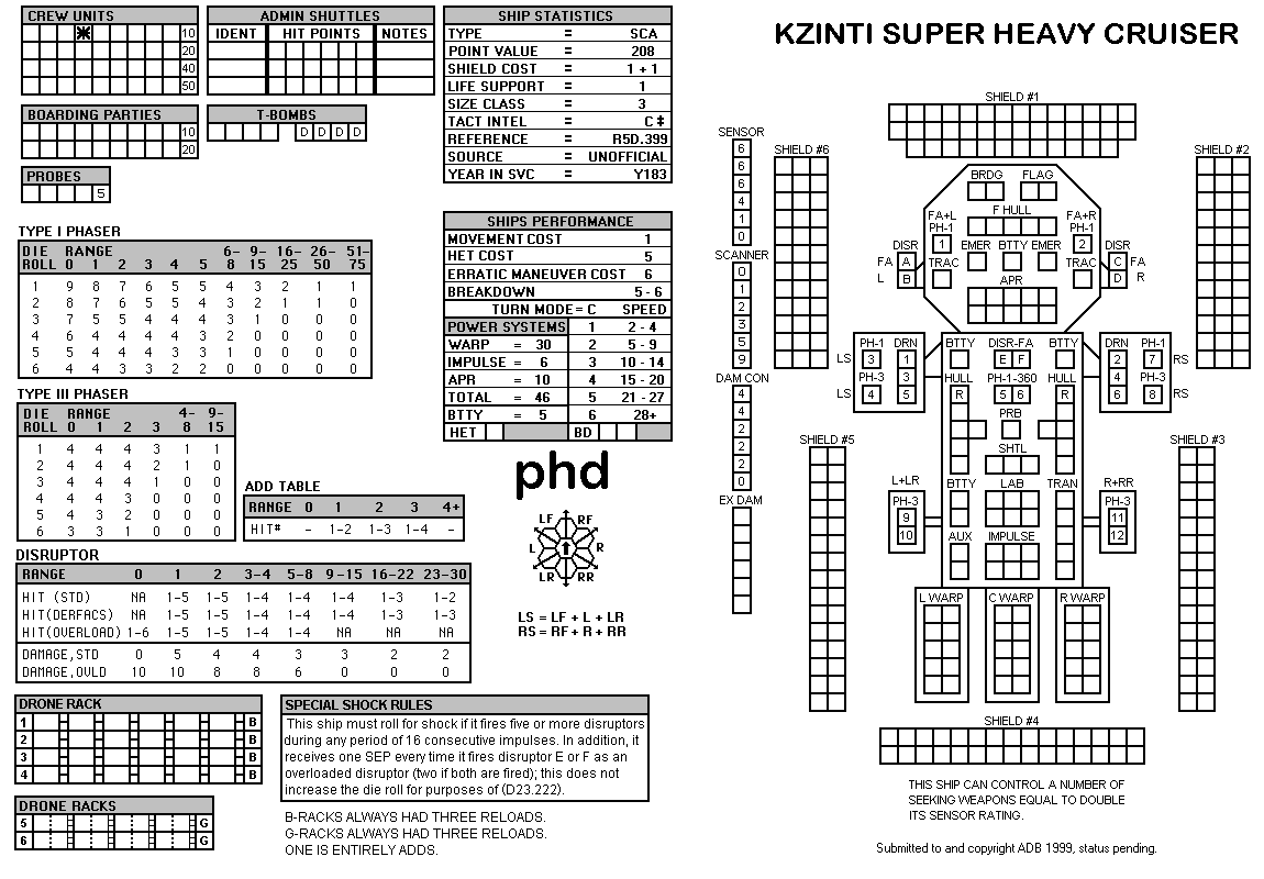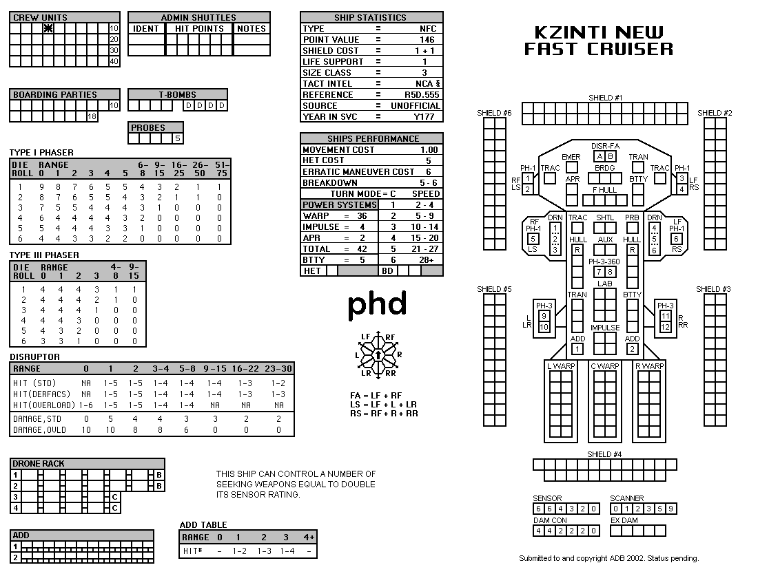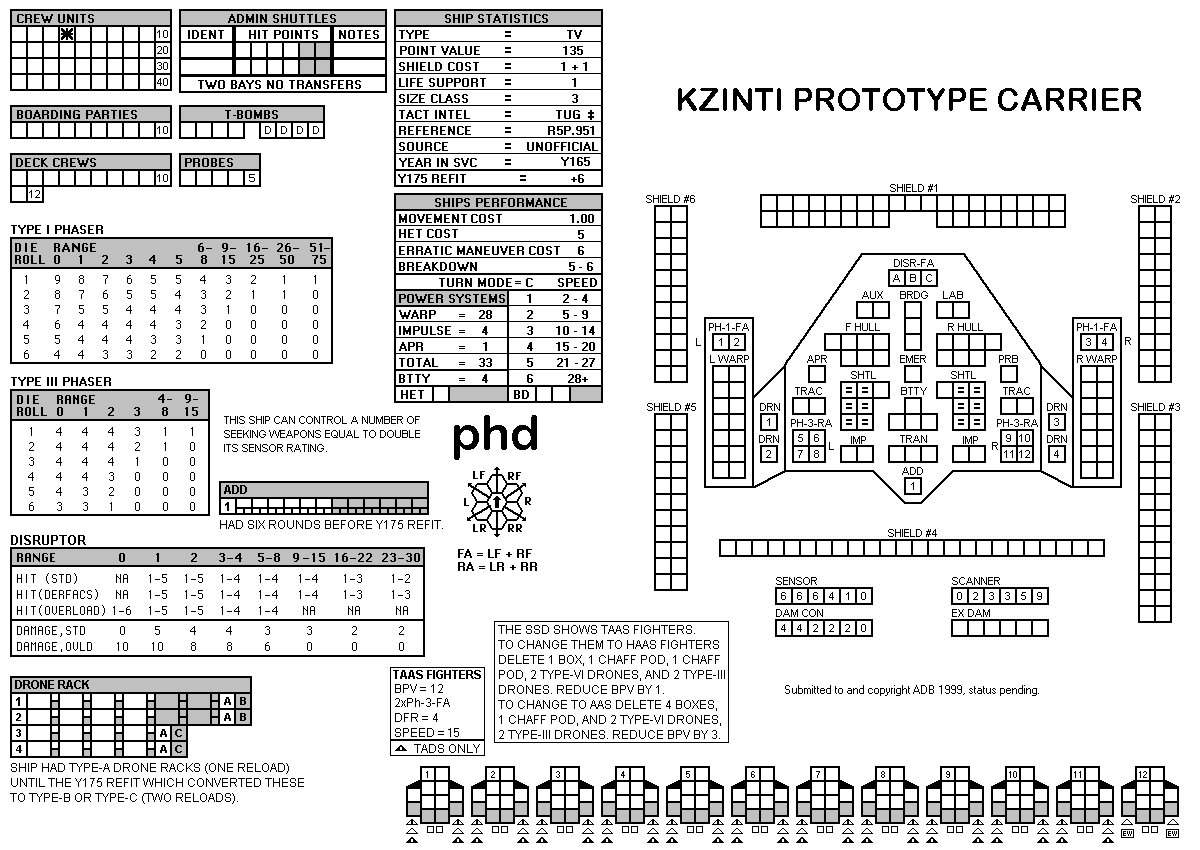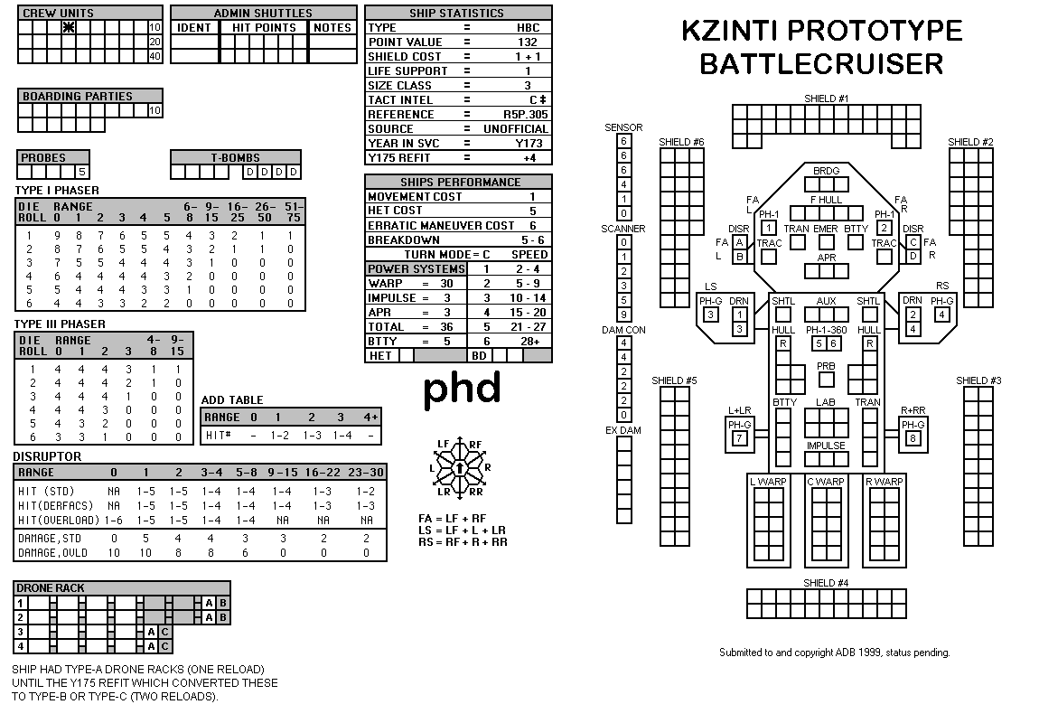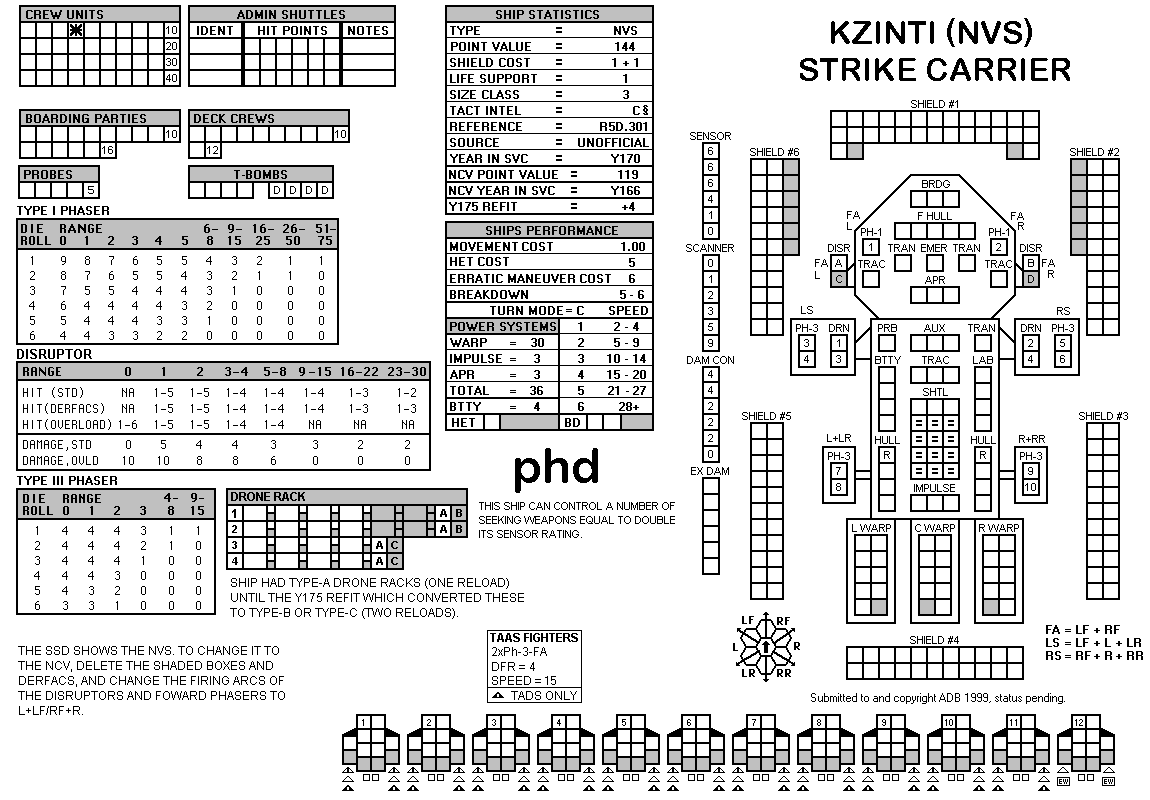 Y175 refit. NOTE: On some SSDs the fighter/shuttles have shaded boxes, these represent the crippled the status of the fighter/shuttle. NOTE: On some SSDs the crew check-off boxes have a 'B' or 'D' in them, these represent the crew units that are Boarding Parties or Deck Crews. |