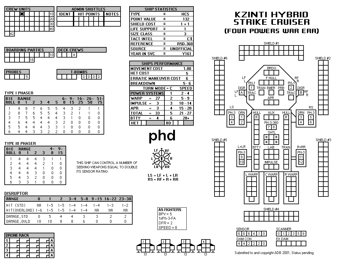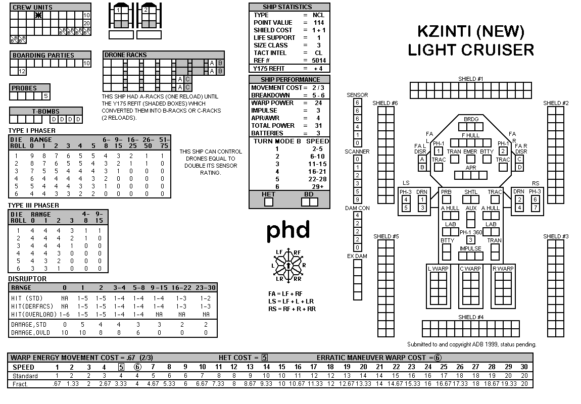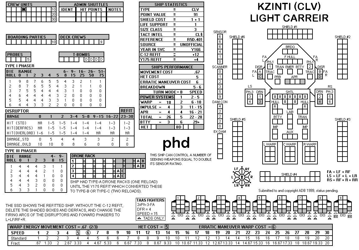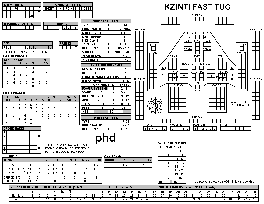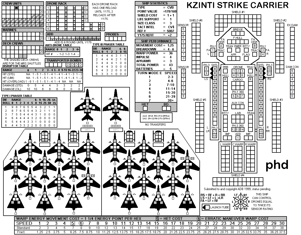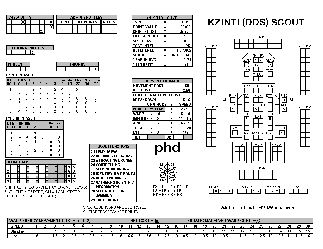Y175 refit. NOTE: On some SSDs the fighter/shuttles have shaded boxes, these represent the crippled the status of the fighter/shuttle. NOTE: On some SSDs the crew check-off boxes have a 'B' or 'D' in them, these represent the crew units that are Boarding Parties or Deck Crews. |