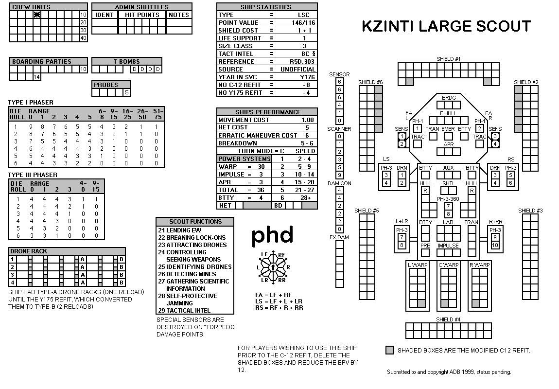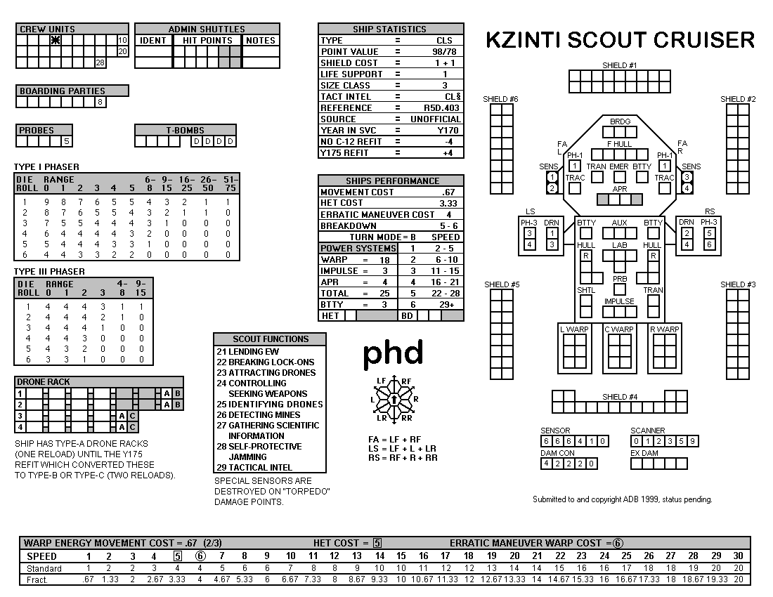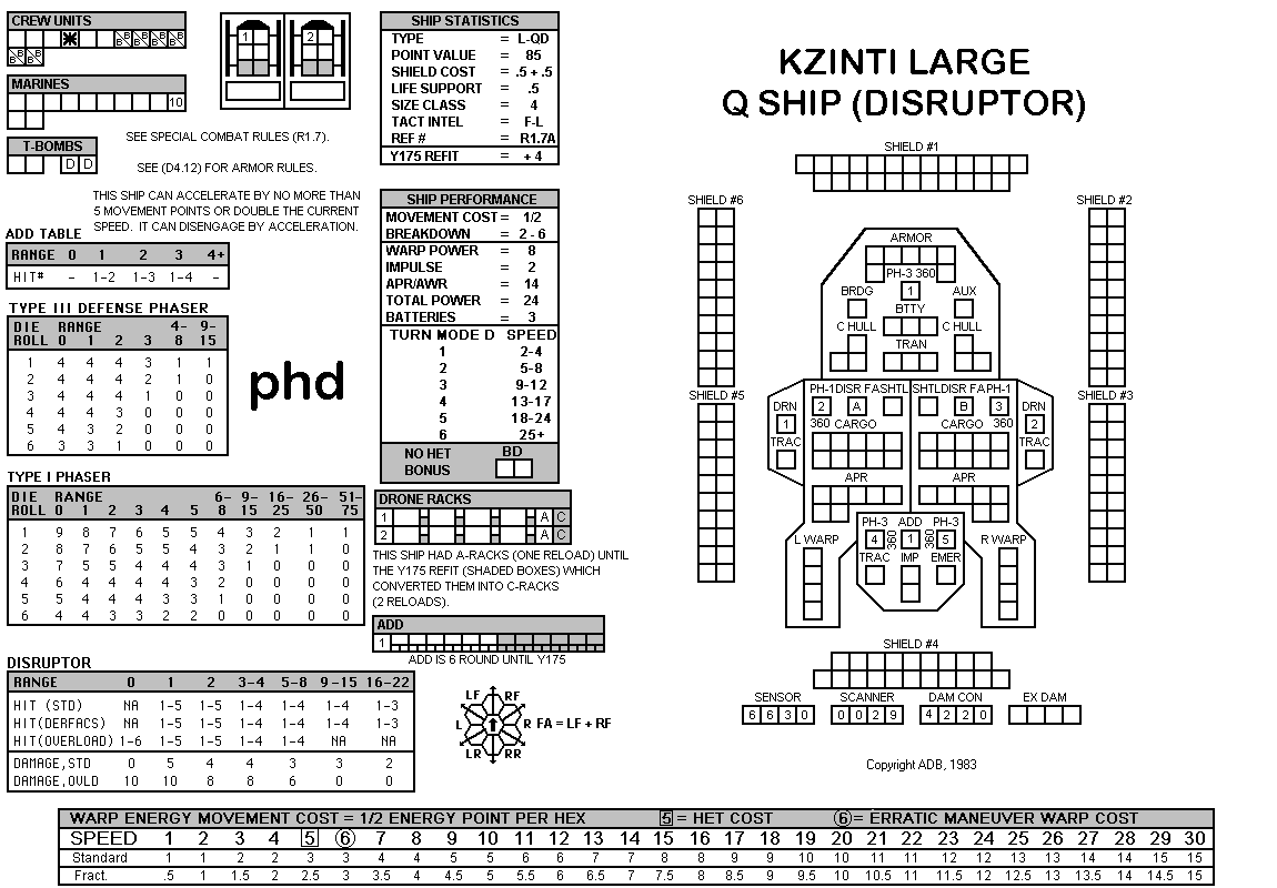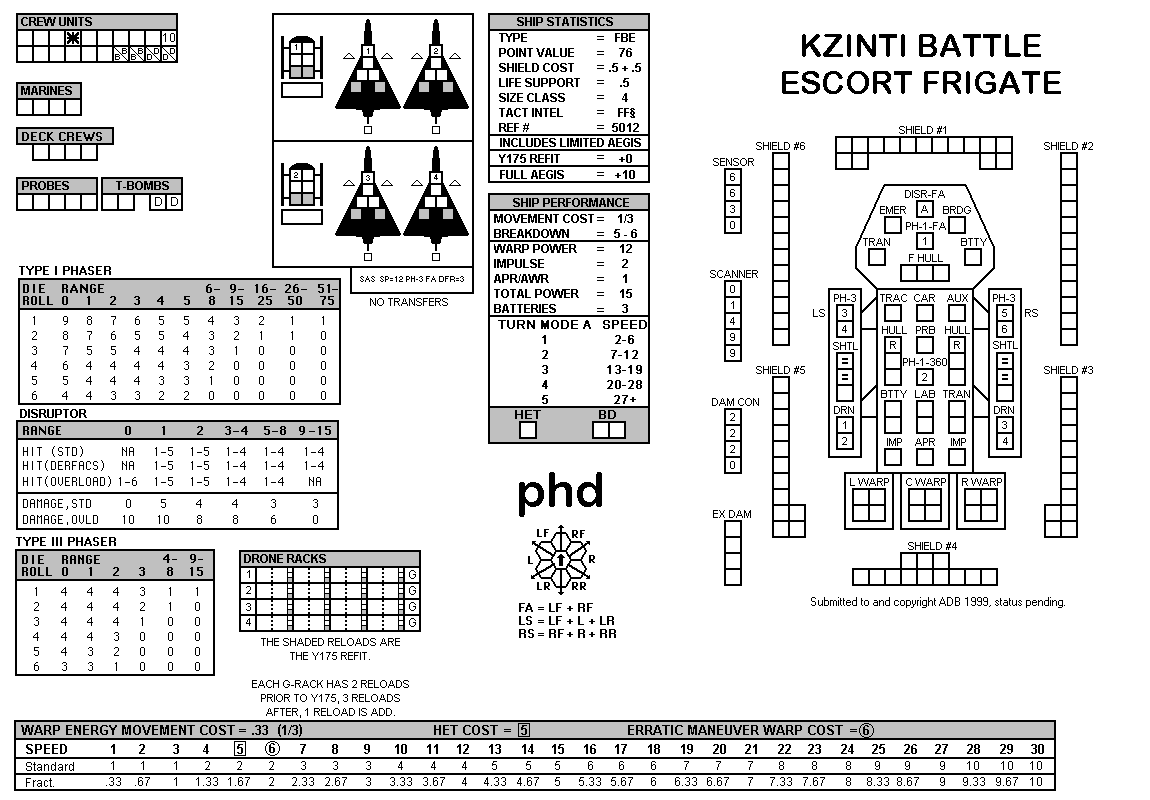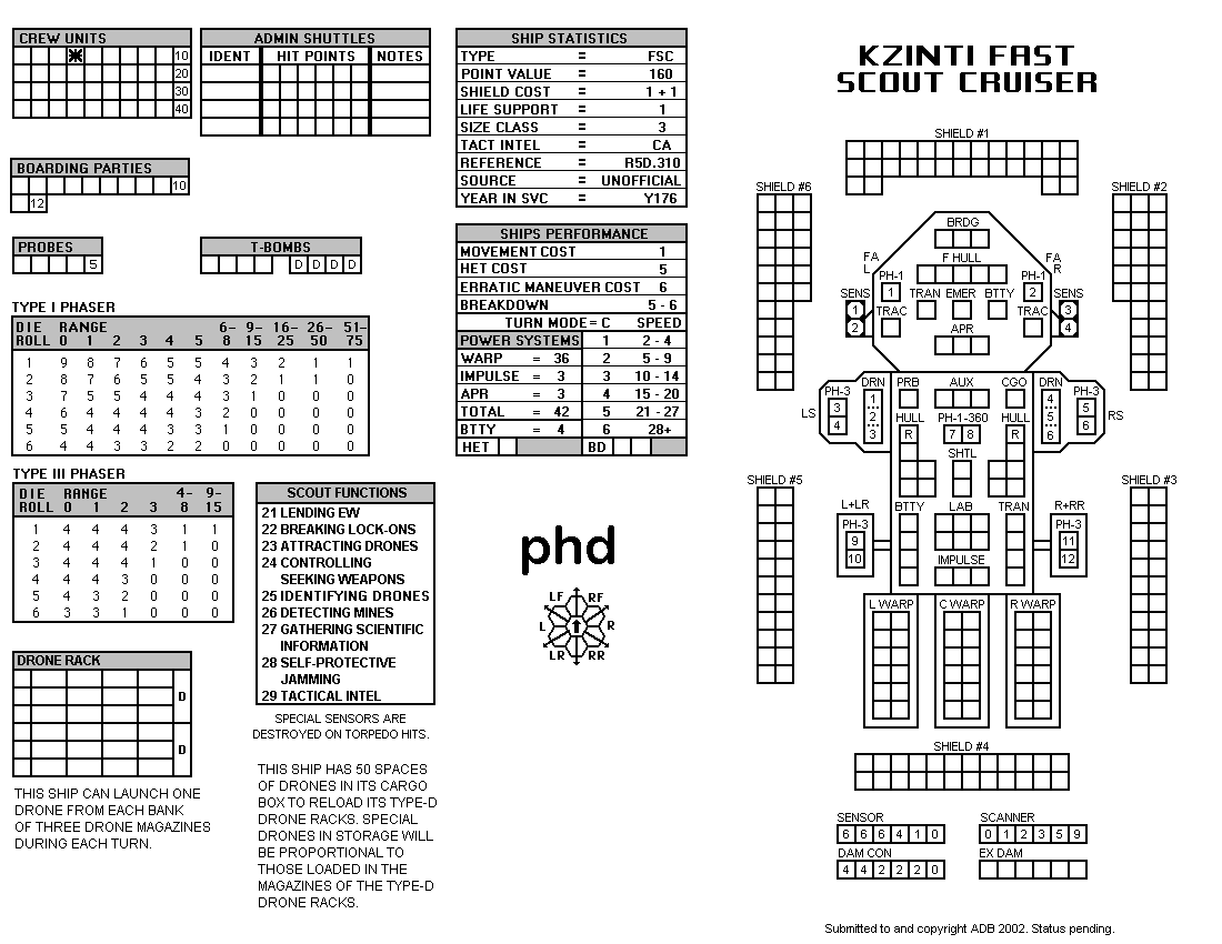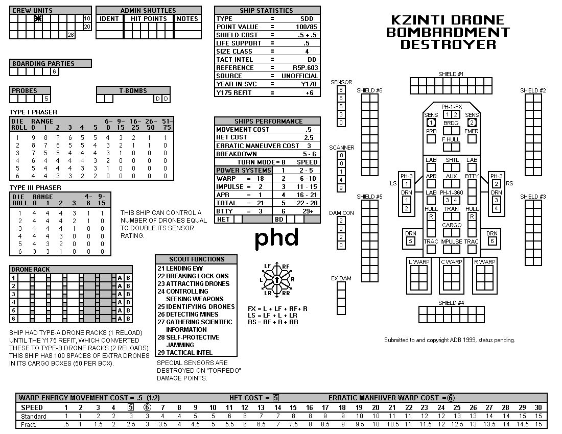 Y175 refit. NOTE: On some SSDs the fighter/shuttles have shaded boxes, these represent the crippled the status of the fighter/shuttle. NOTE: On some SSDs the crew check-off boxes have a 'B' or 'D' in them, these represent the crew units that are Boarding Parties or Deck Crews. |