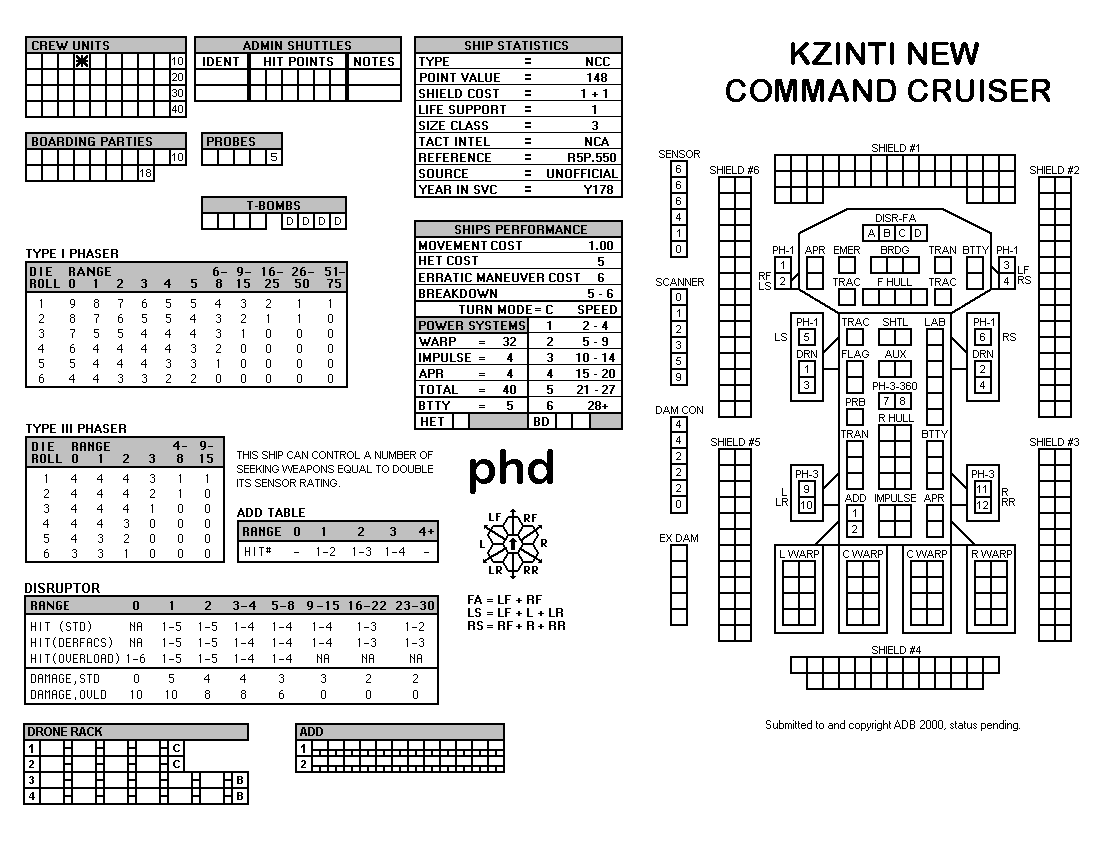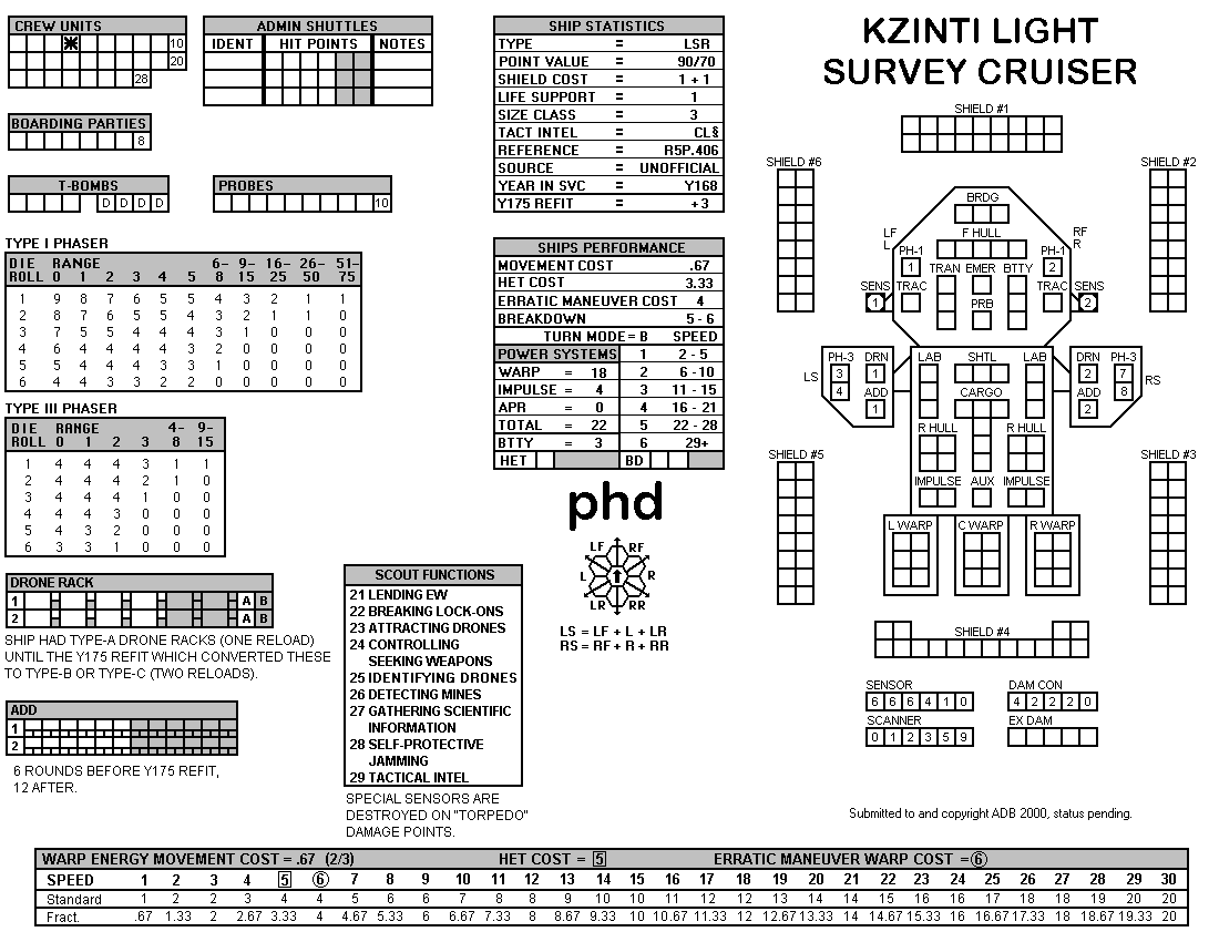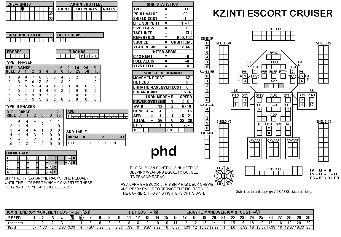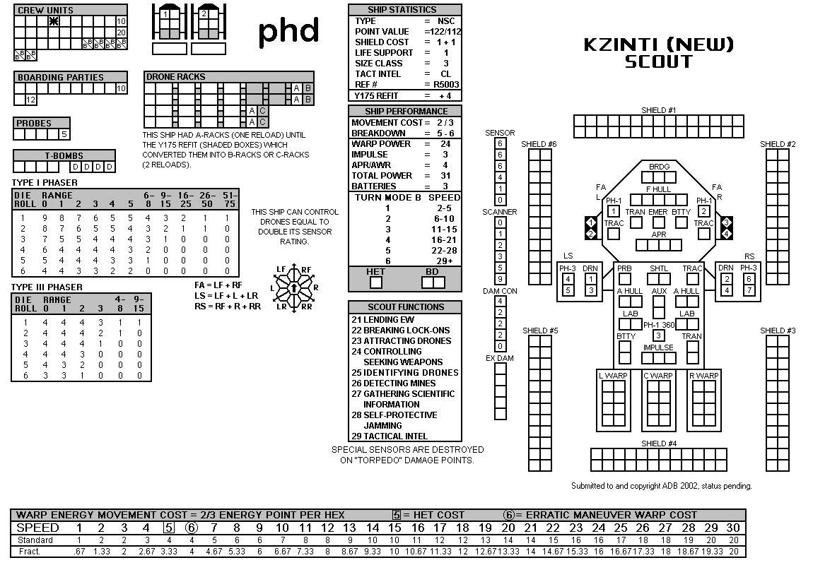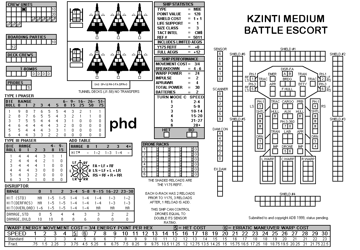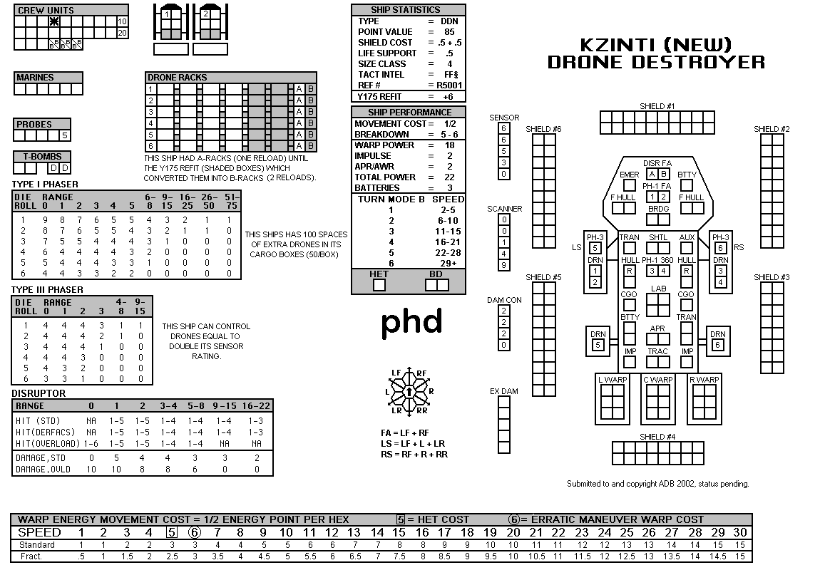 Y175 refit. NOTE: On some SSDs the fighter/shuttles have shaded boxes, these represent the crippled the status of the fighter/shuttle. NOTE: On some SSDs the crew check-off boxes have a 'B' or 'D' in them, these represent the crew units that are Boarding Parties or Deck Crews. |