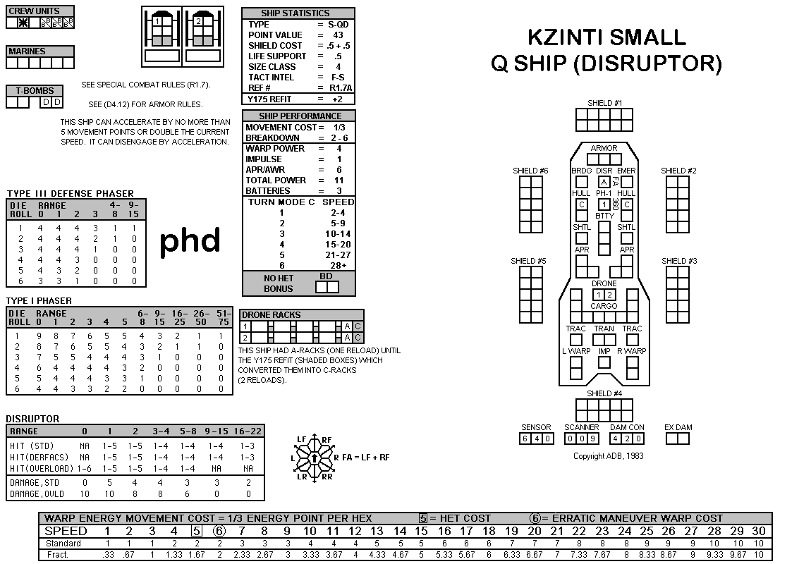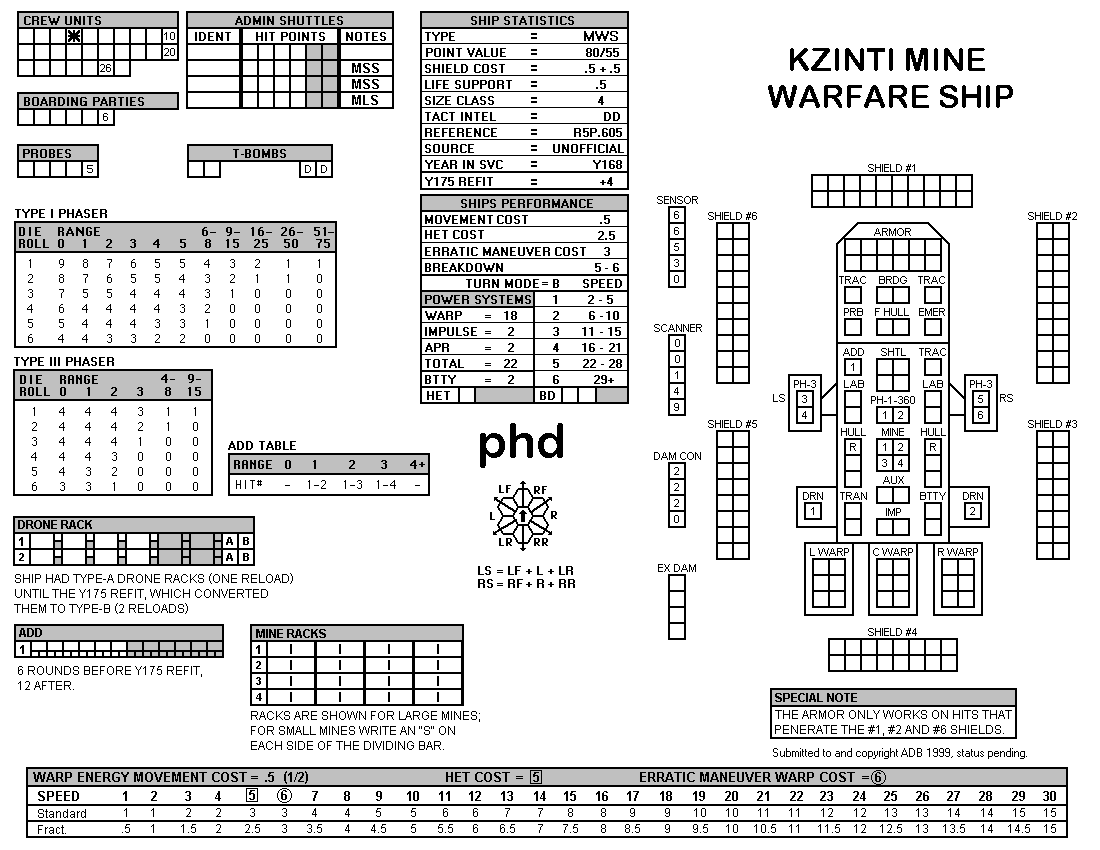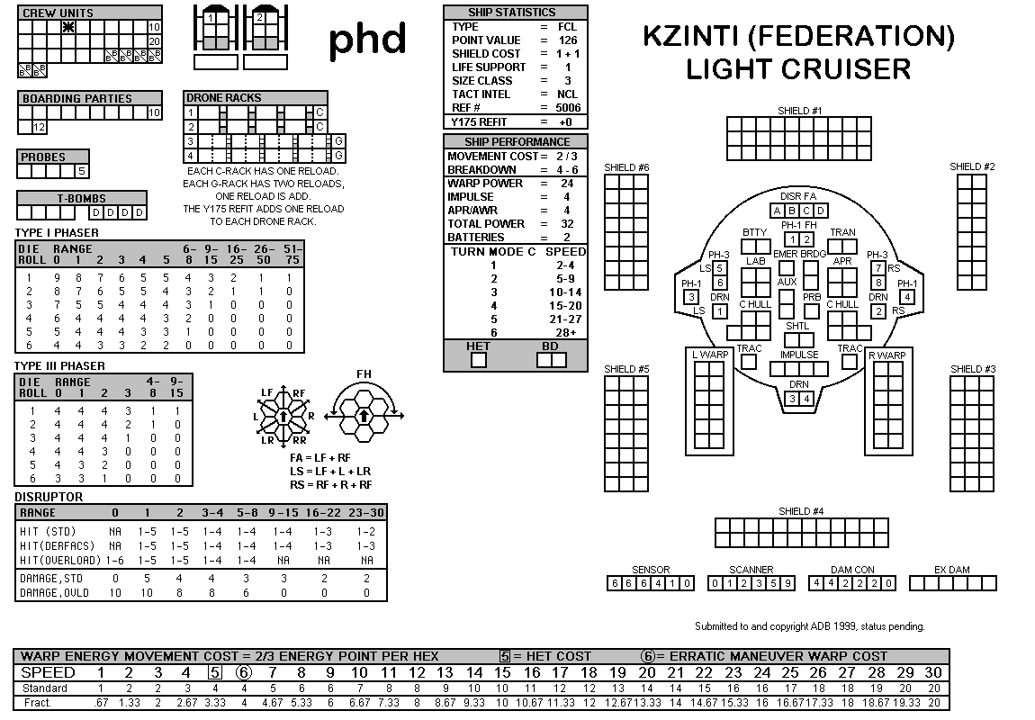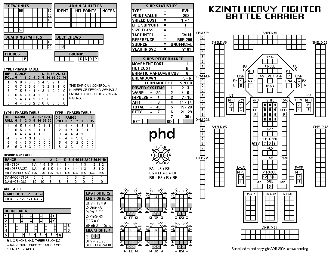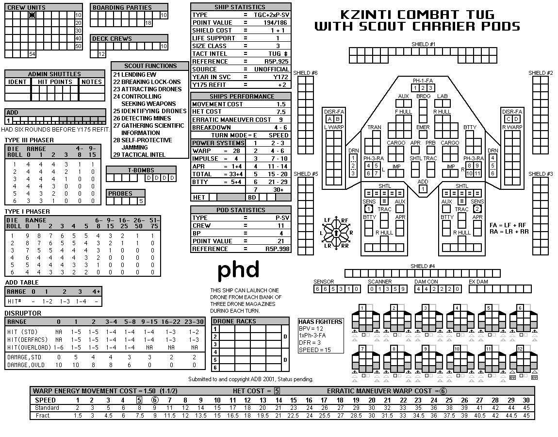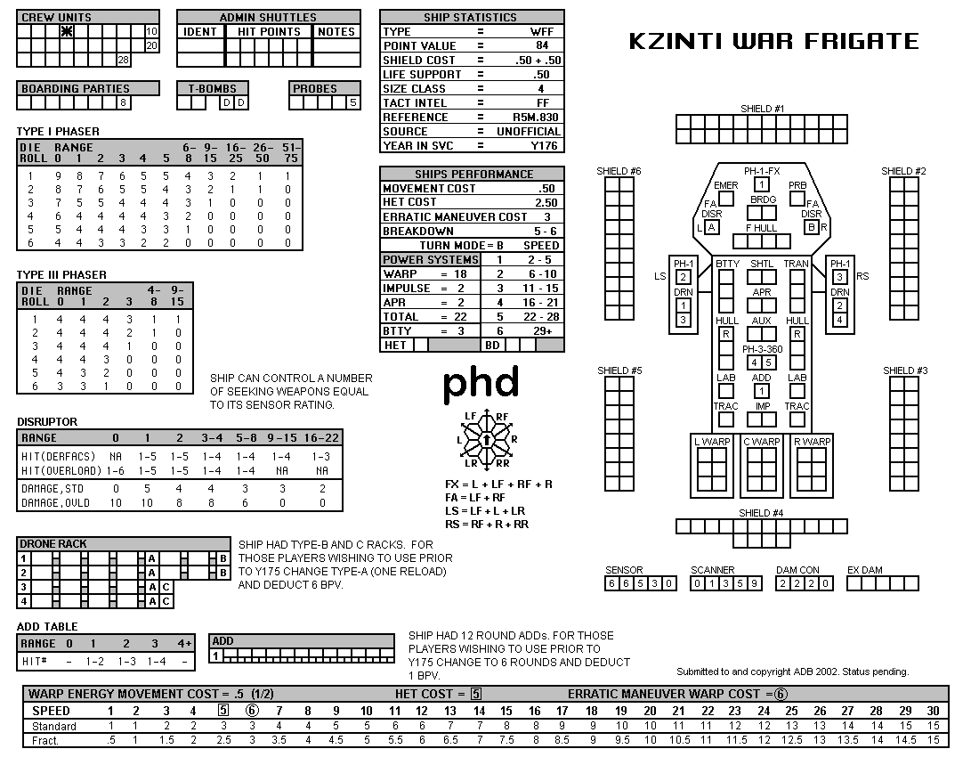 Y175 refit. NOTE: On some SSDs the fighter/shuttles have shaded boxes, these represent the crippled the status of the fighter/shuttle. NOTE: On some SSDs the crew check-off boxes have a 'B' or 'D' in them, these represent the crew units that are Boarding Parties or Deck Crews. |