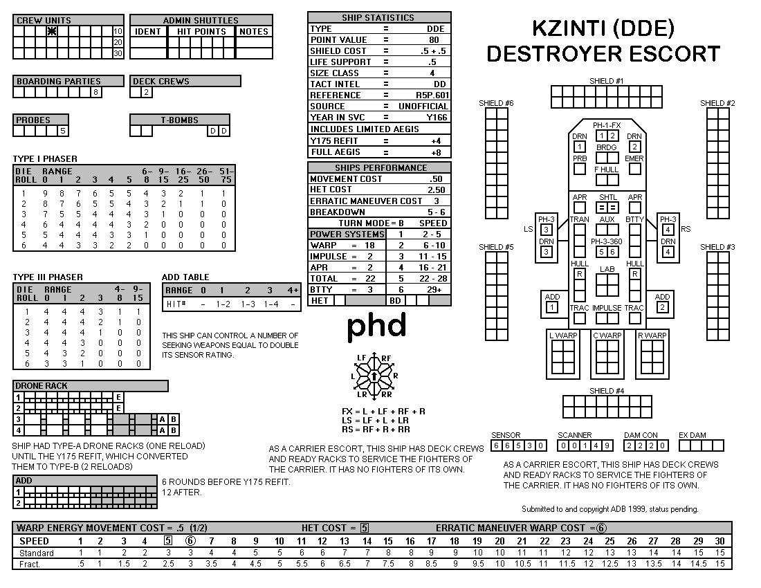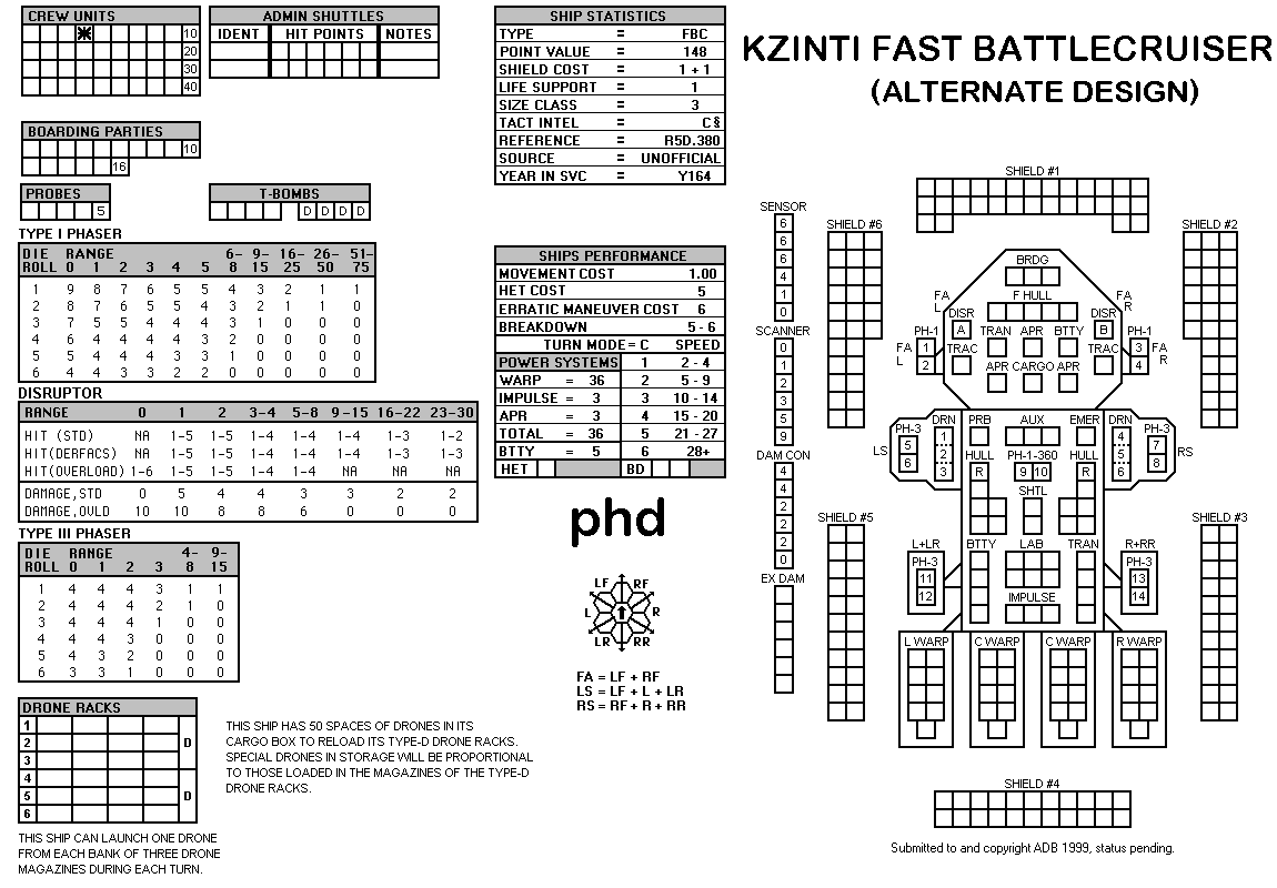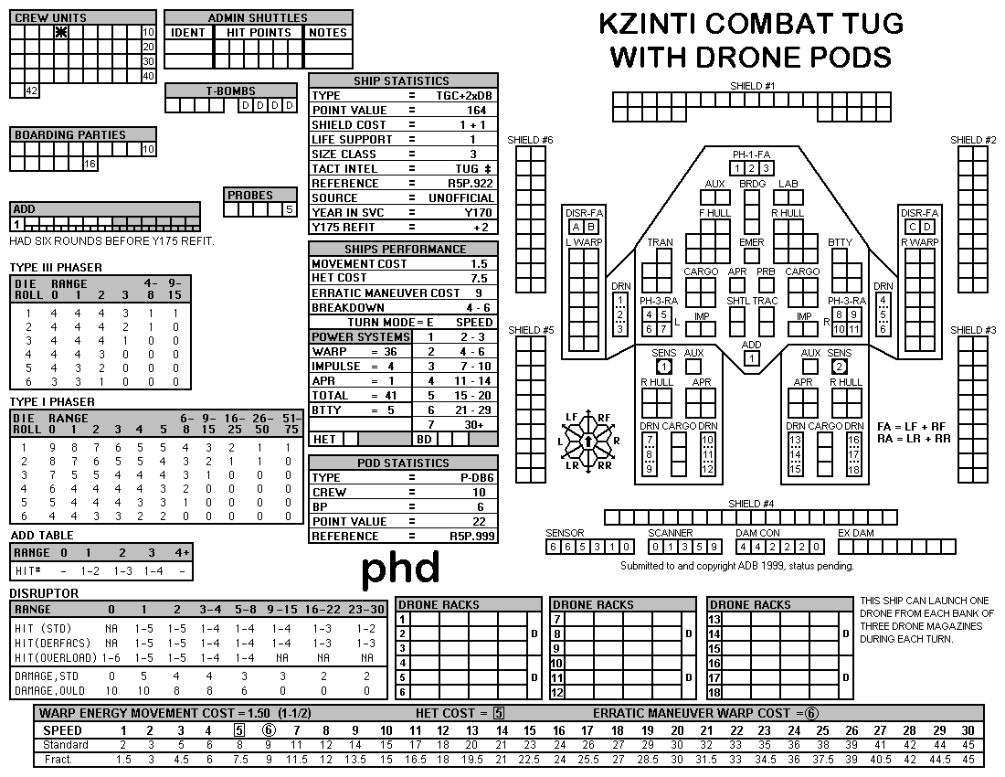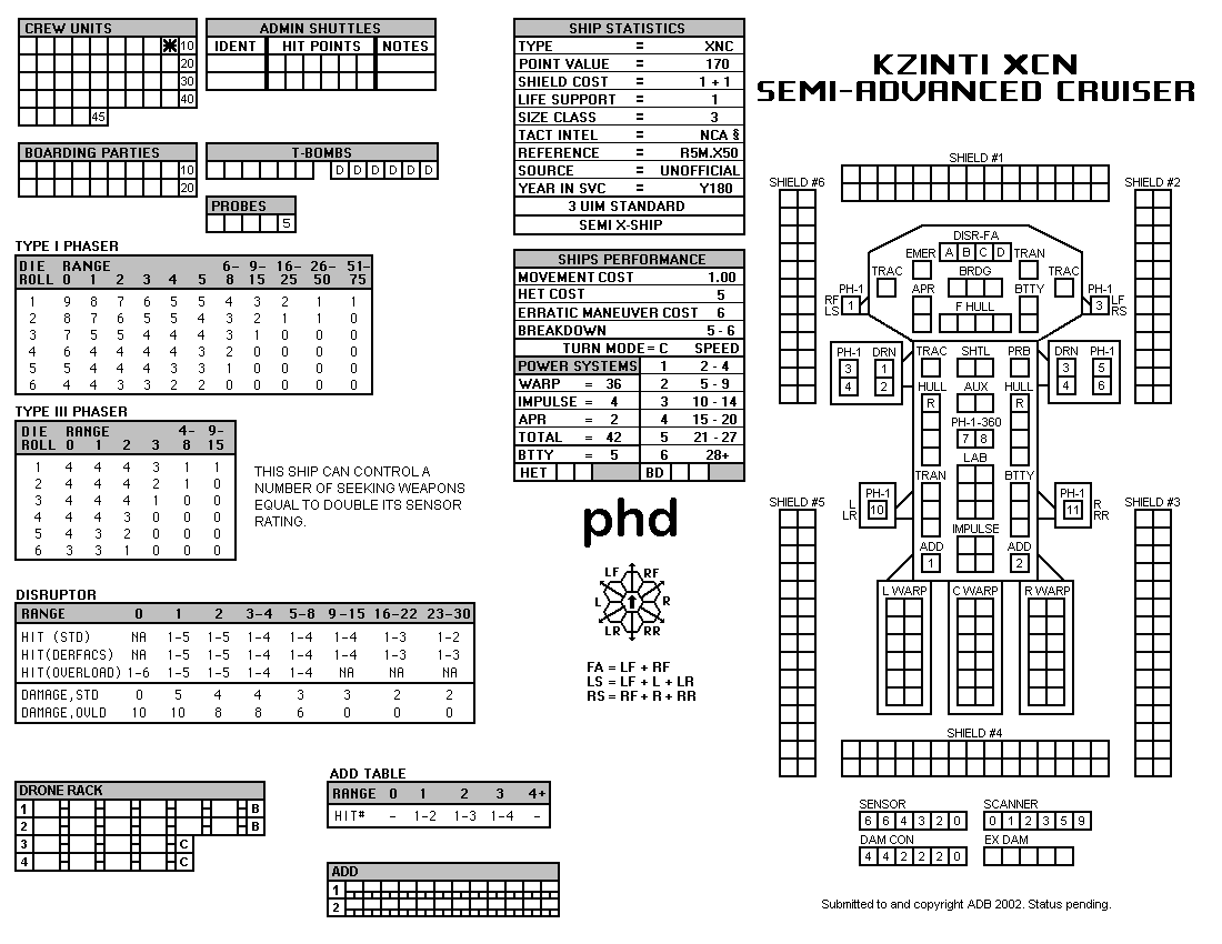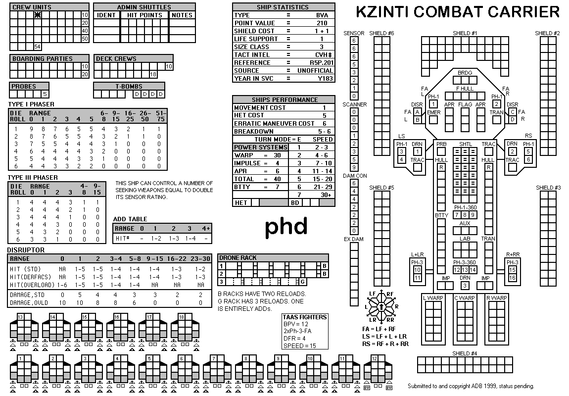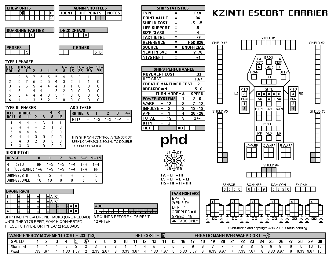 Y175 refit. NOTE: On some SSDs the fighter/shuttles have shaded boxes, these represent the crippled the status of the fighter/shuttle. NOTE: On some SSDs the crew check-off boxes have a 'B' or 'D' in them, these represent the crew units that are Boarding Parties or Deck Crews. |