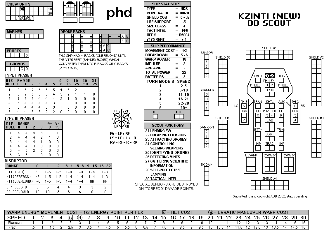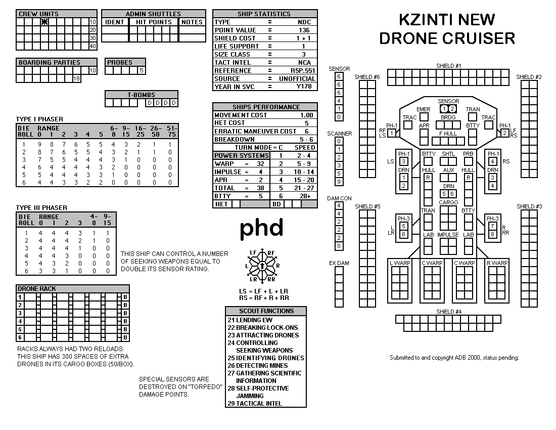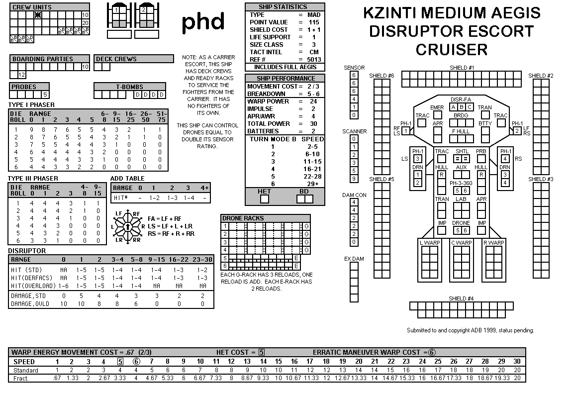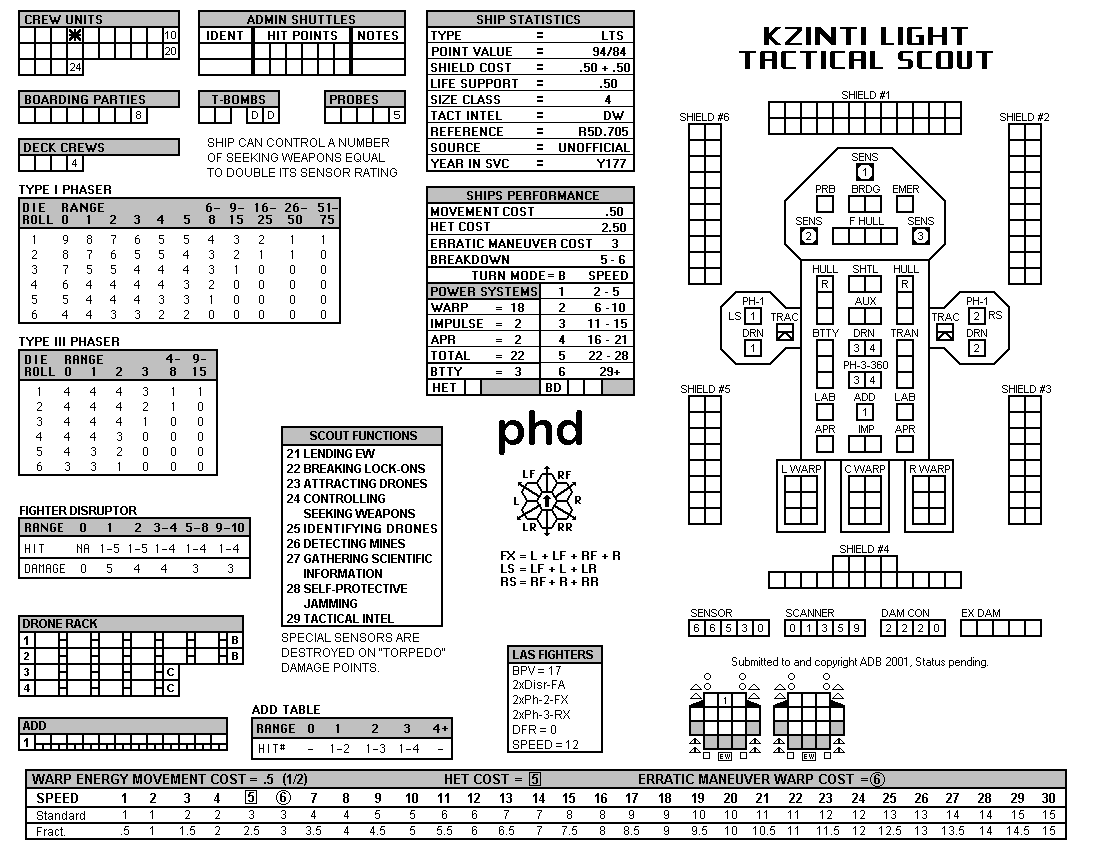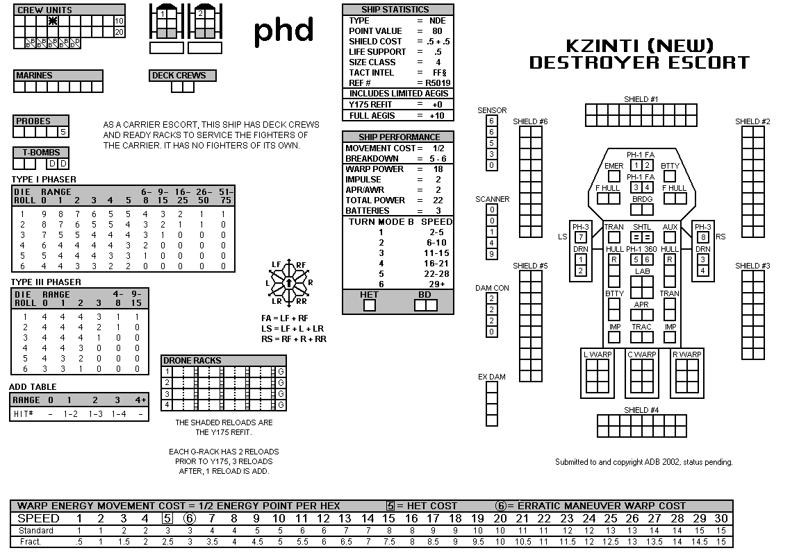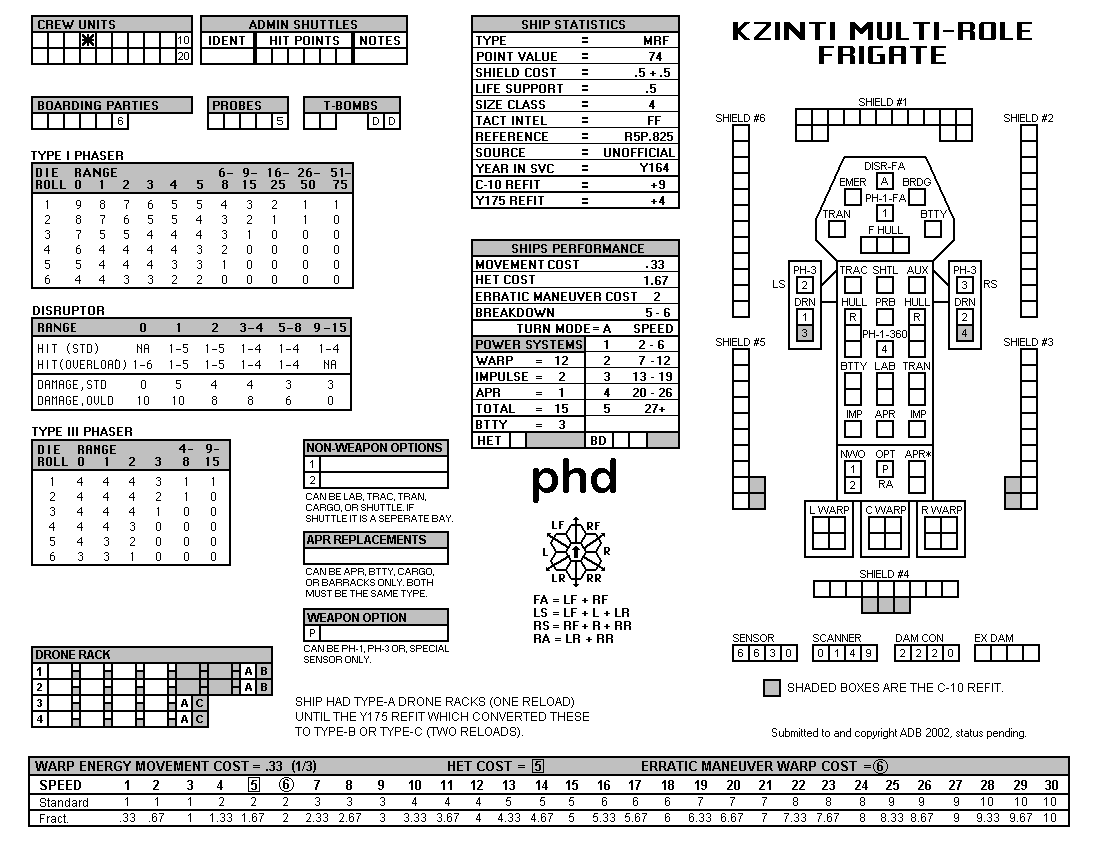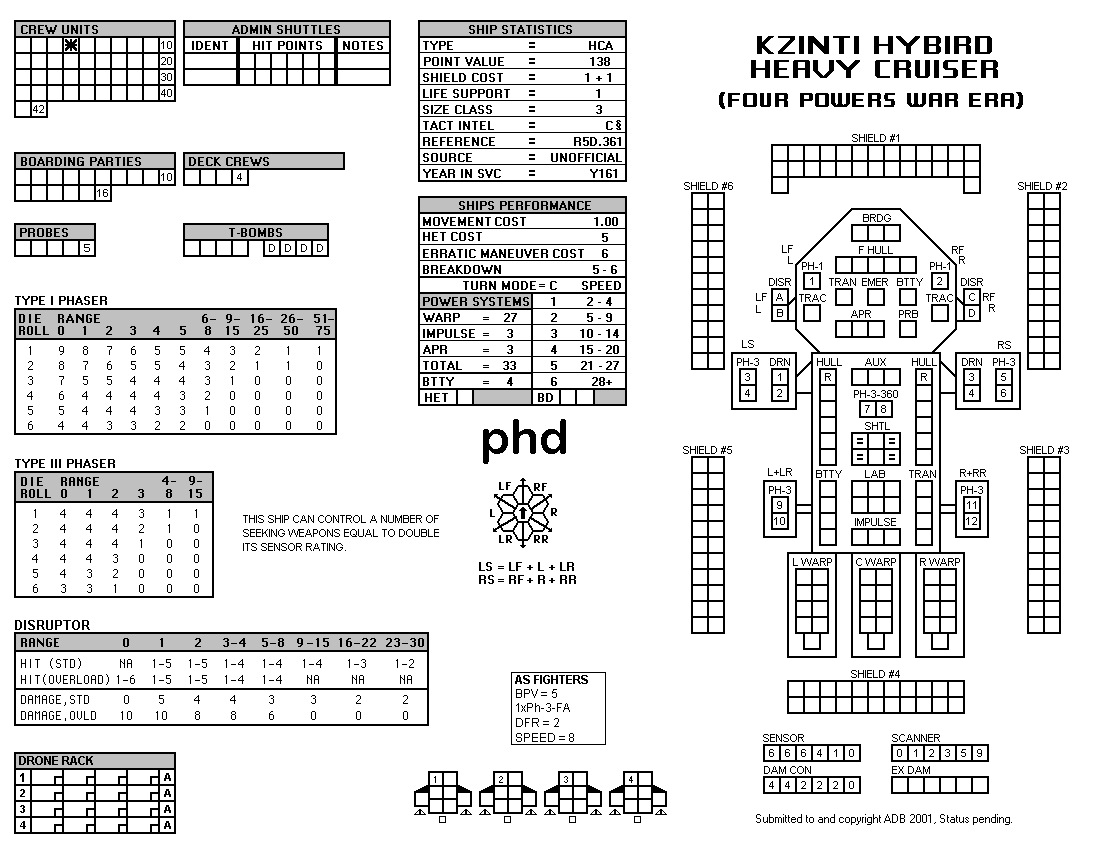 Y175 refit. NOTE: On some SSDs the fighter/shuttles have shaded boxes, these represent the crippled the status of the fighter/shuttle. NOTE: On some SSDs the crew check-off boxes have a 'B' or 'D' in them, these represent the crew units that are Boarding Parties or Deck Crews. |