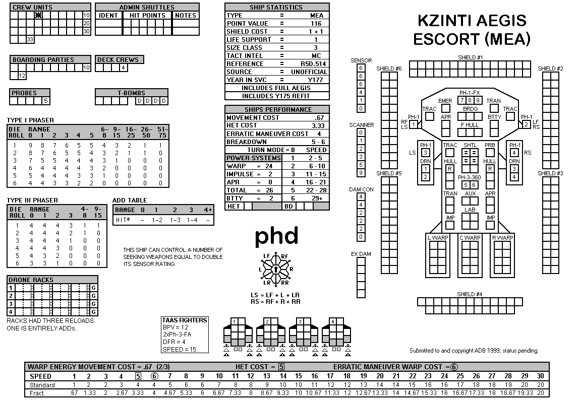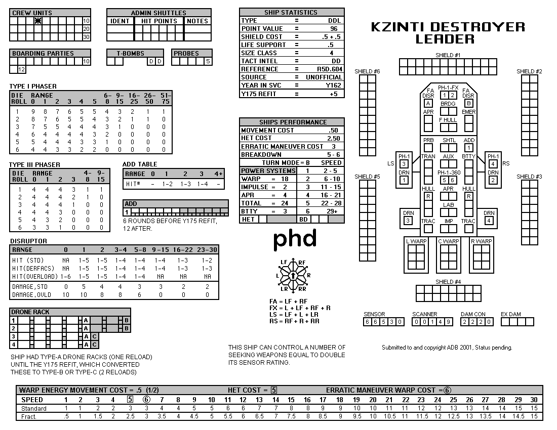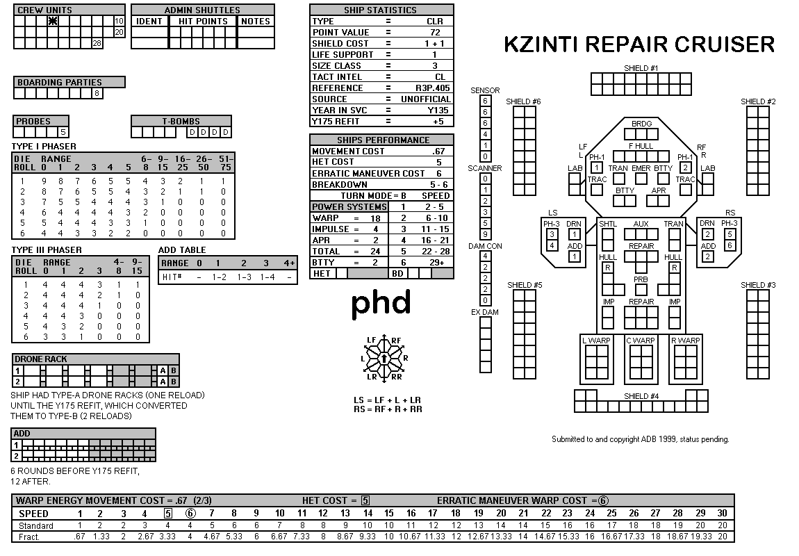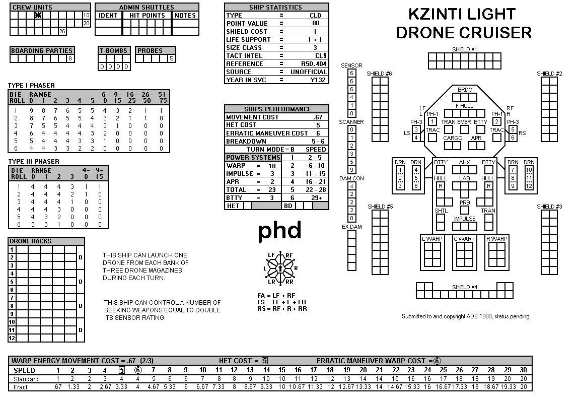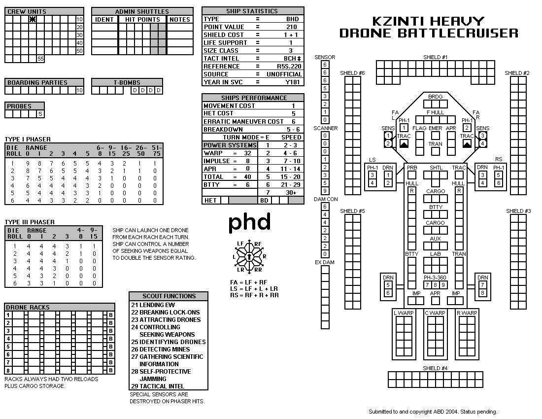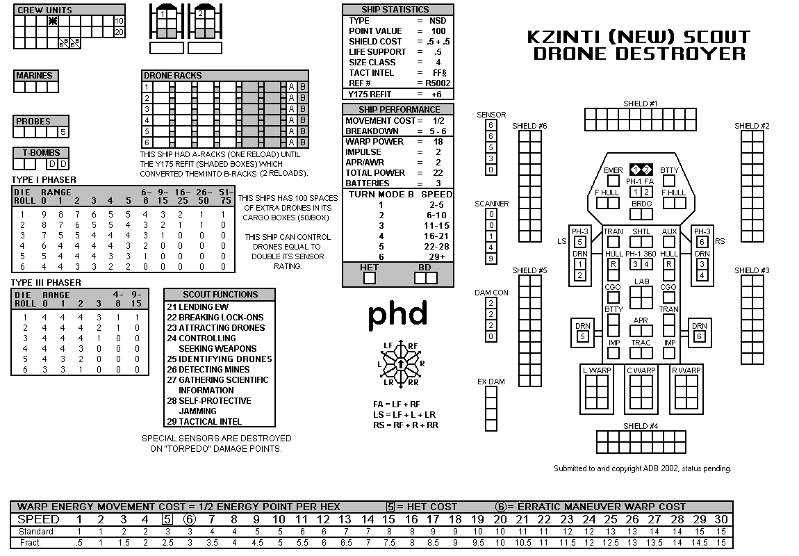 Y175 refit. NOTE: On some SSDs the fighter/shuttles have shaded boxes, these represent the crippled the status of the fighter/shuttle. NOTE: On some SSDs the crew check-off boxes have a 'B' or 'D' in them, these represent the crew units that are Boarding Parties or Deck Crews. |