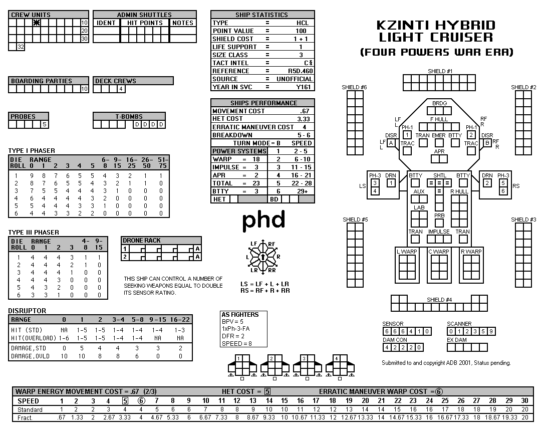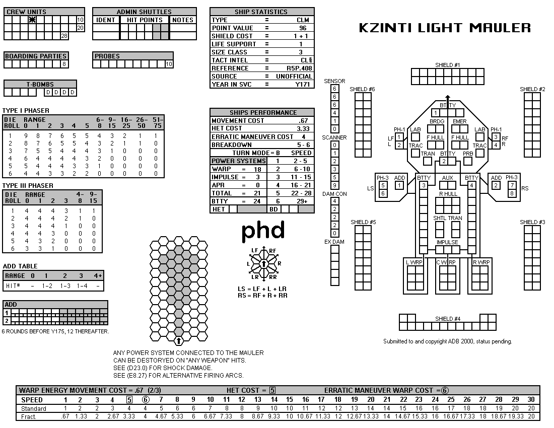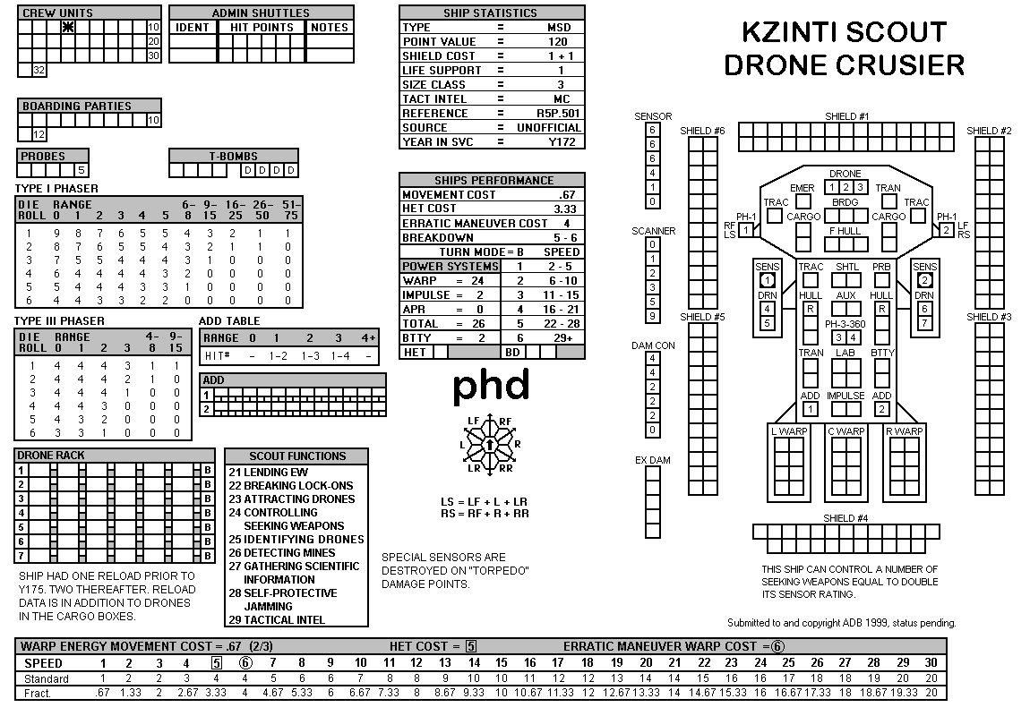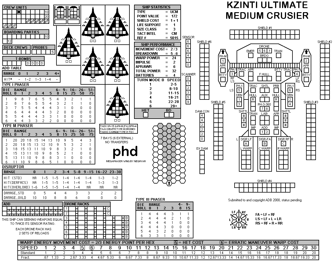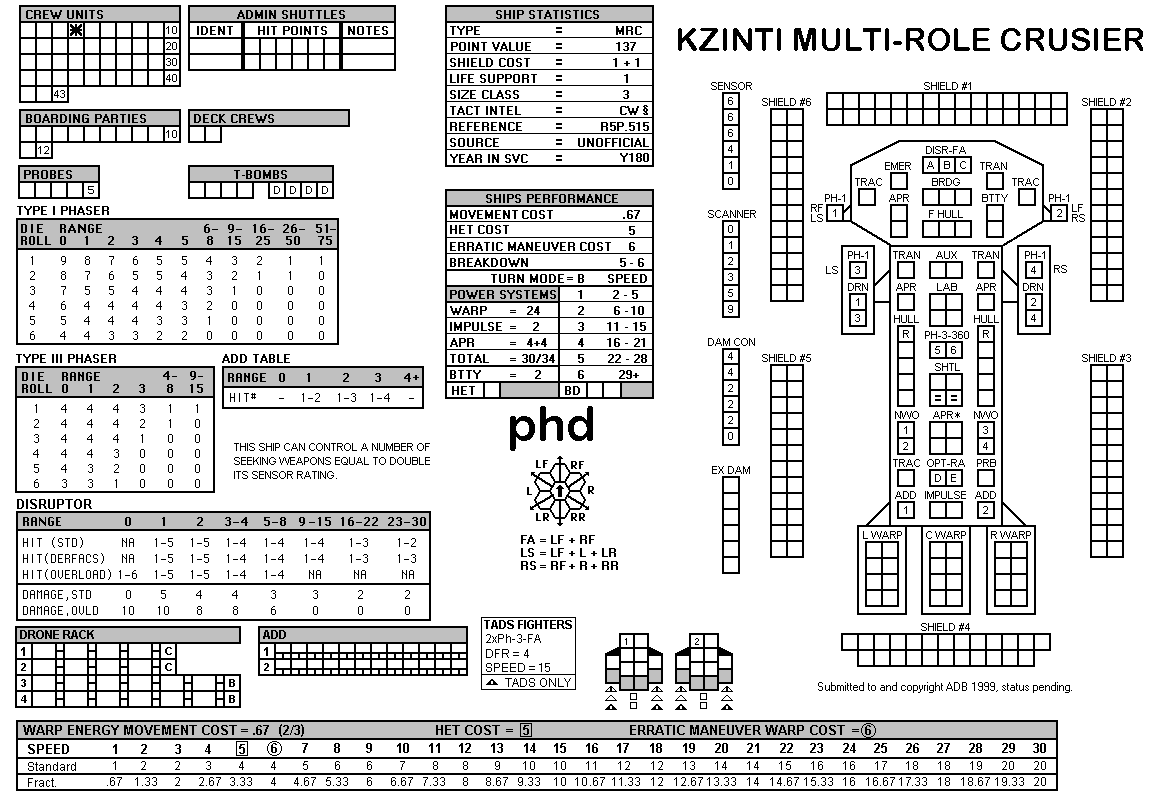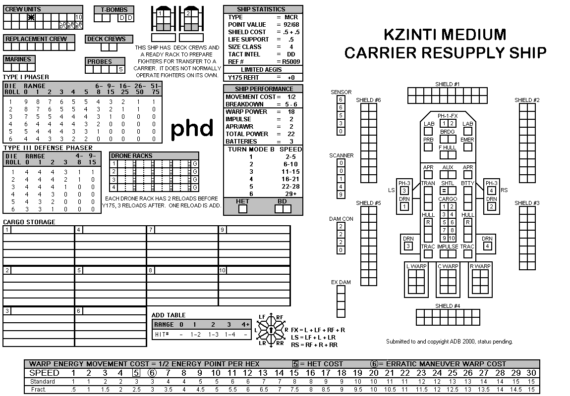 Y175 refit. NOTE: On some SSDs the fighter/shuttles have shaded boxes, these represent the crippled the status of the fighter/shuttle. NOTE: On some SSDs the crew check-off boxes have a 'B' or 'D' in them, these represent the crew units that are Boarding Parties or Deck Crews. |