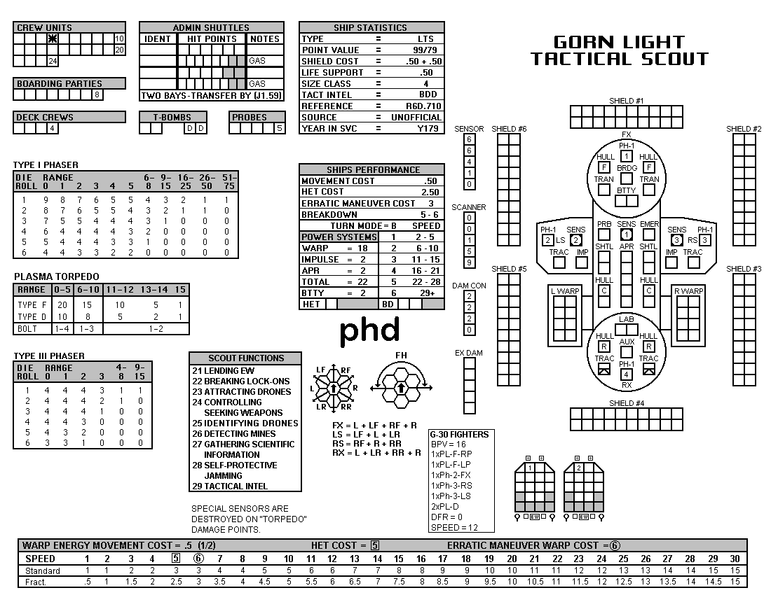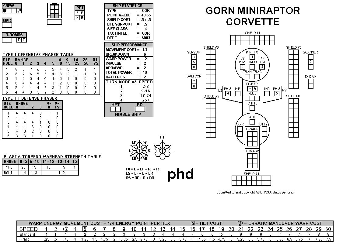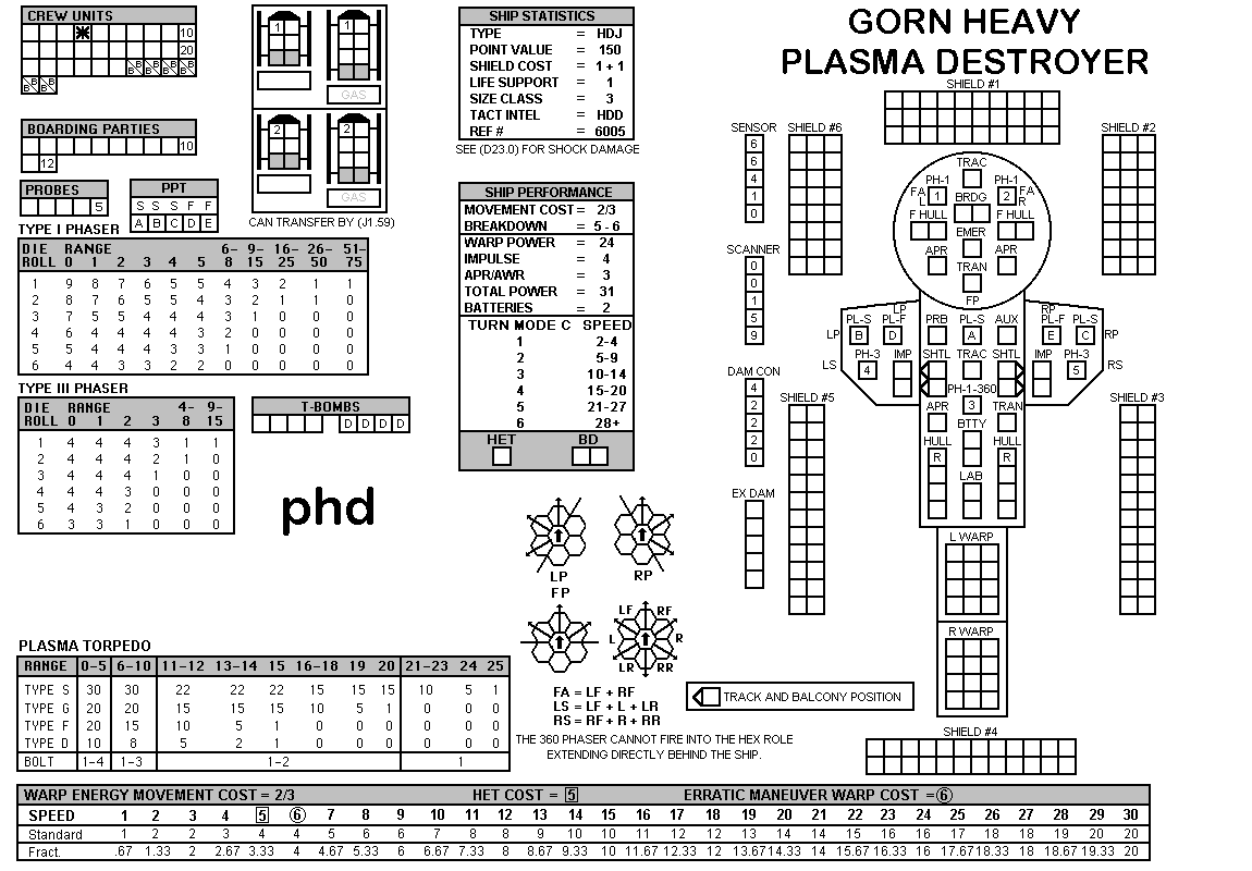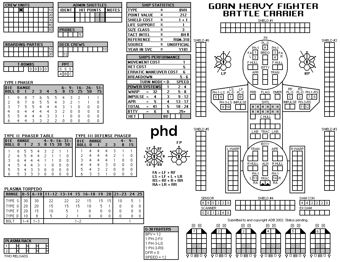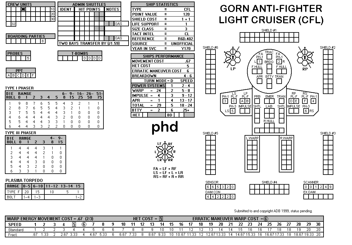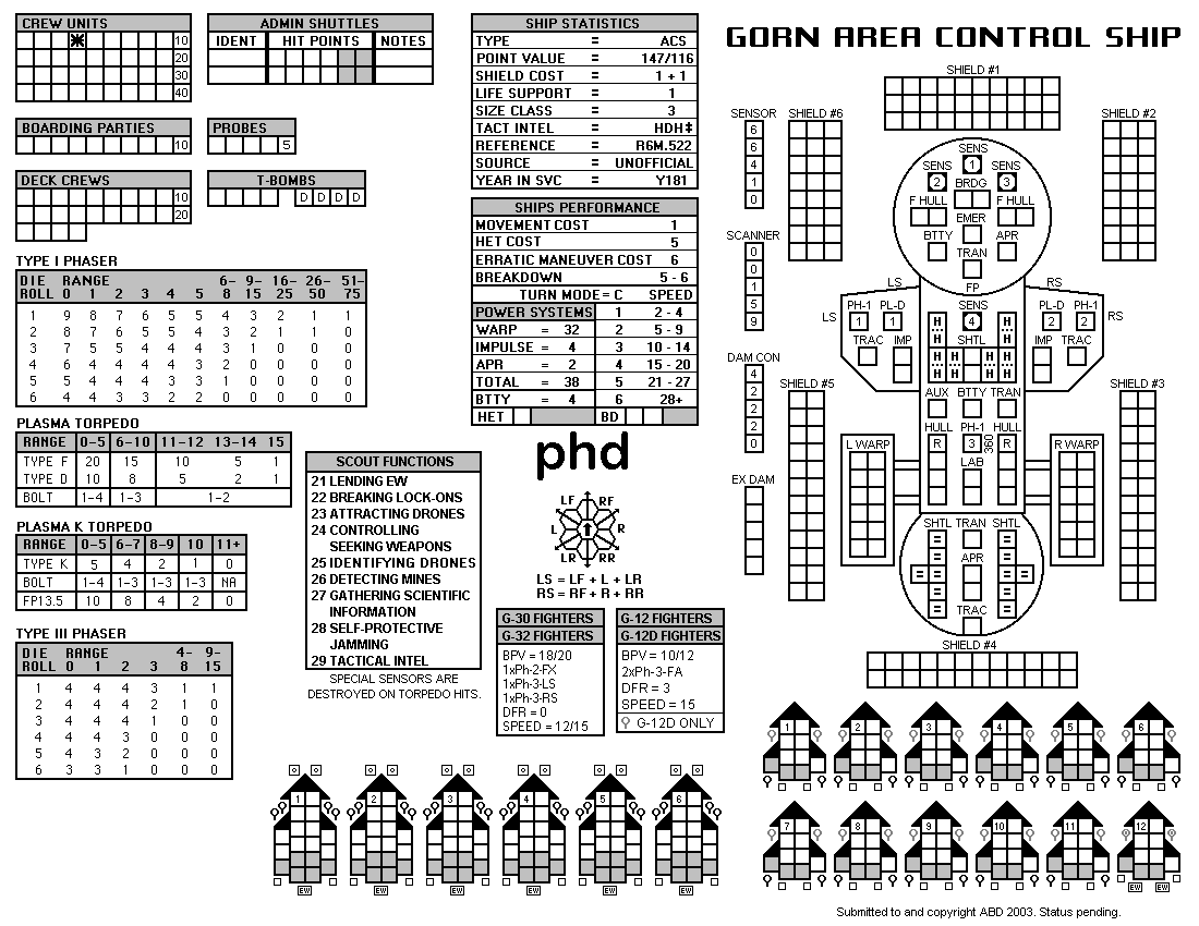 | Note: Due to the small size of this ship, a type-VI drone does 4 pts. of damage rather than 2, and any defensive fire systems treat this ship as if it was a PF. |