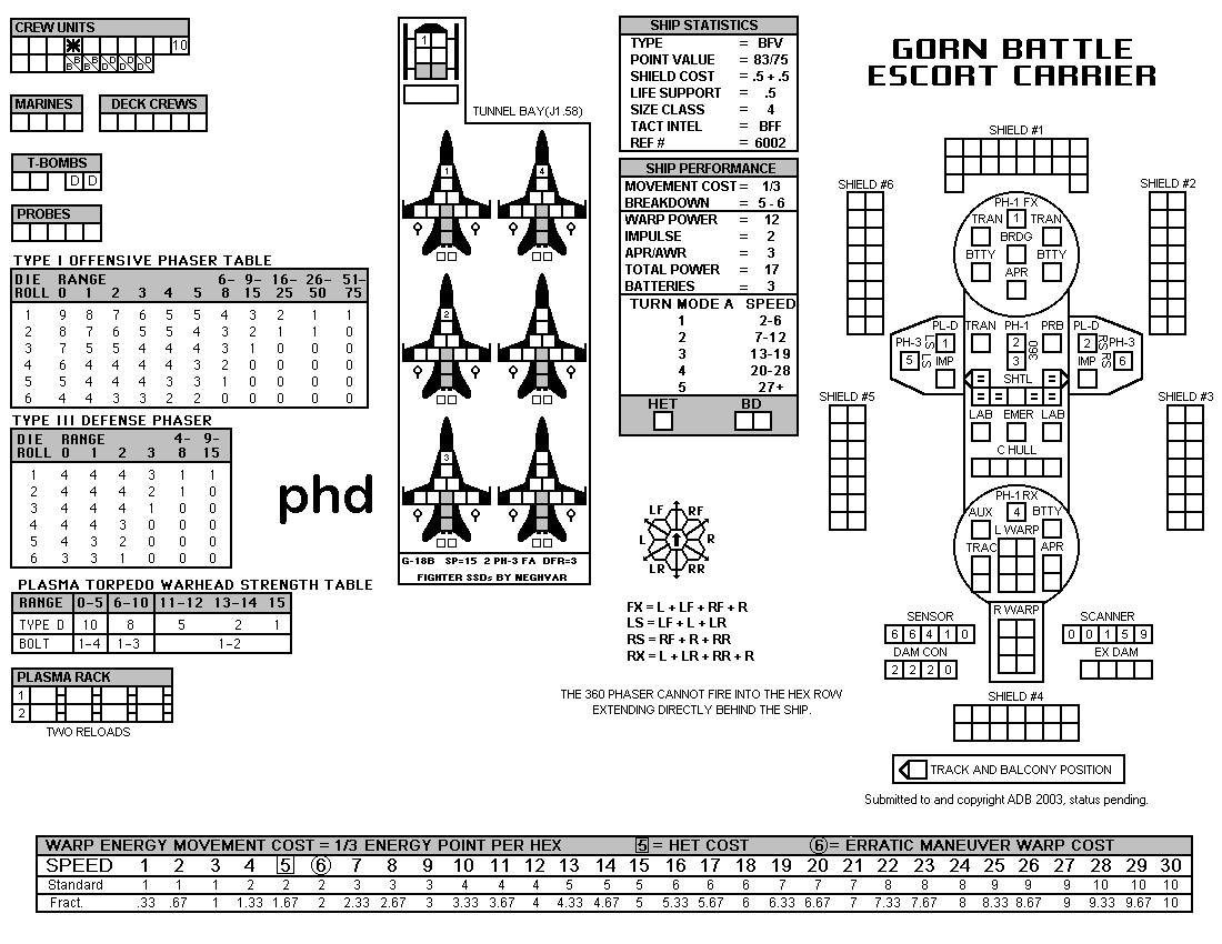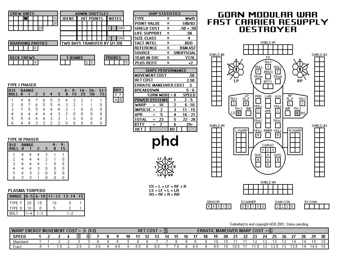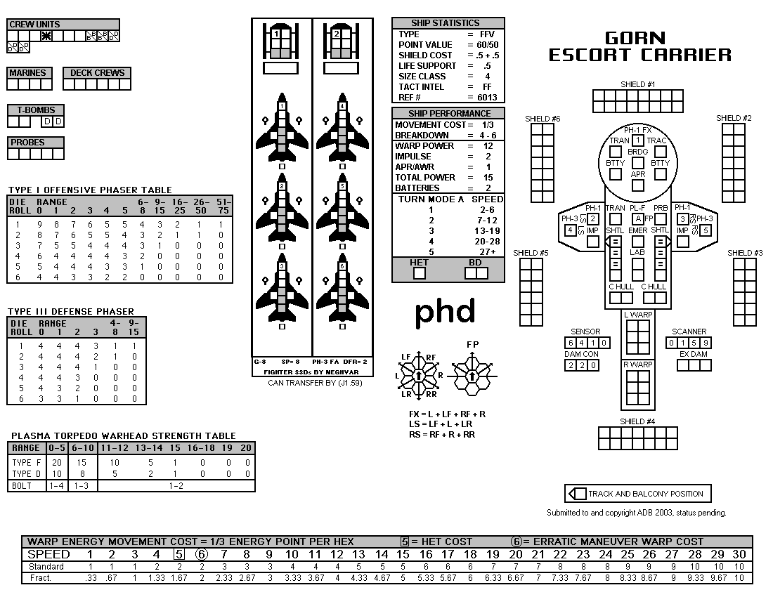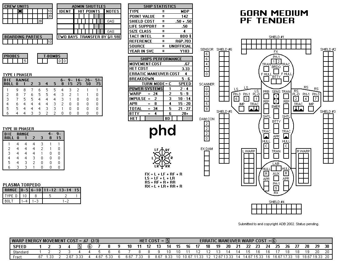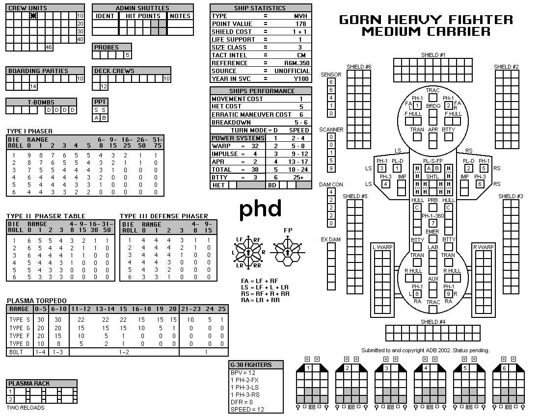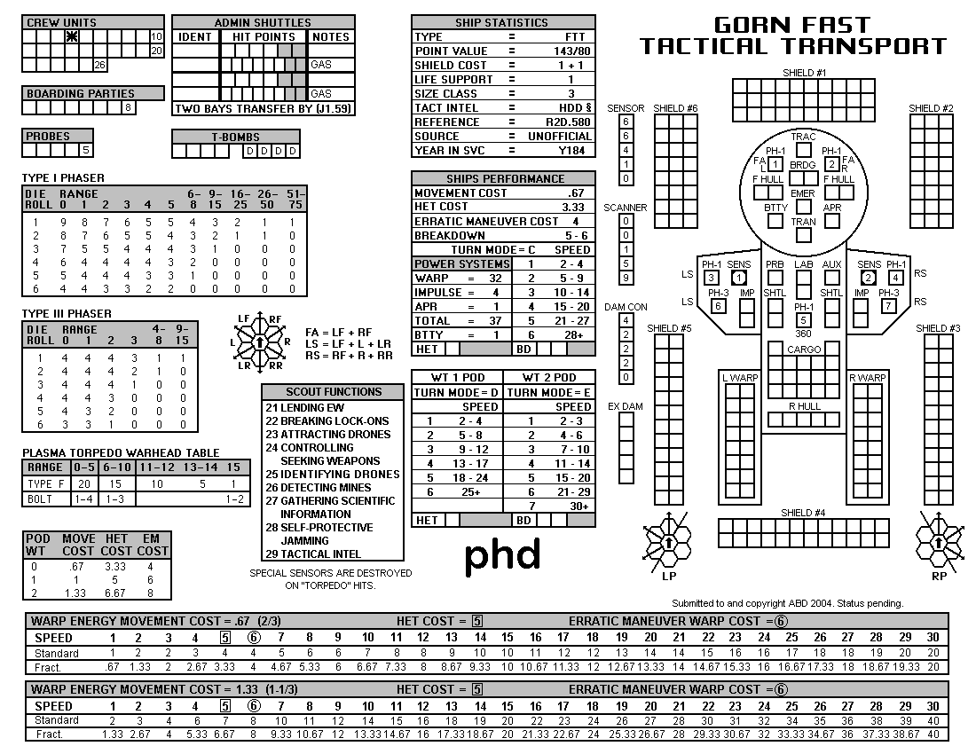 | Note: Due to the small size of this ship, a type-VI drone does 4 pts. of damage rather than 2, and any defensive fire systems treat this ship as if it was a PF. |