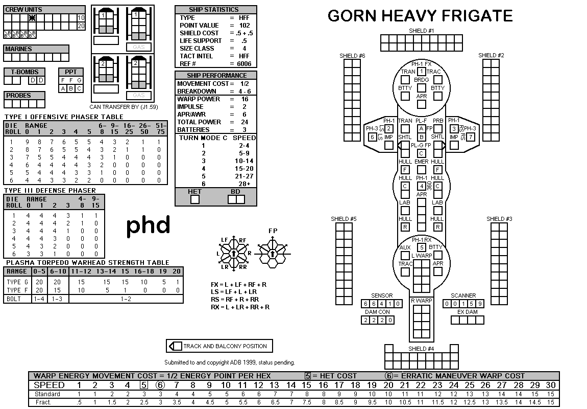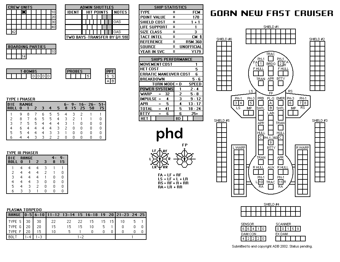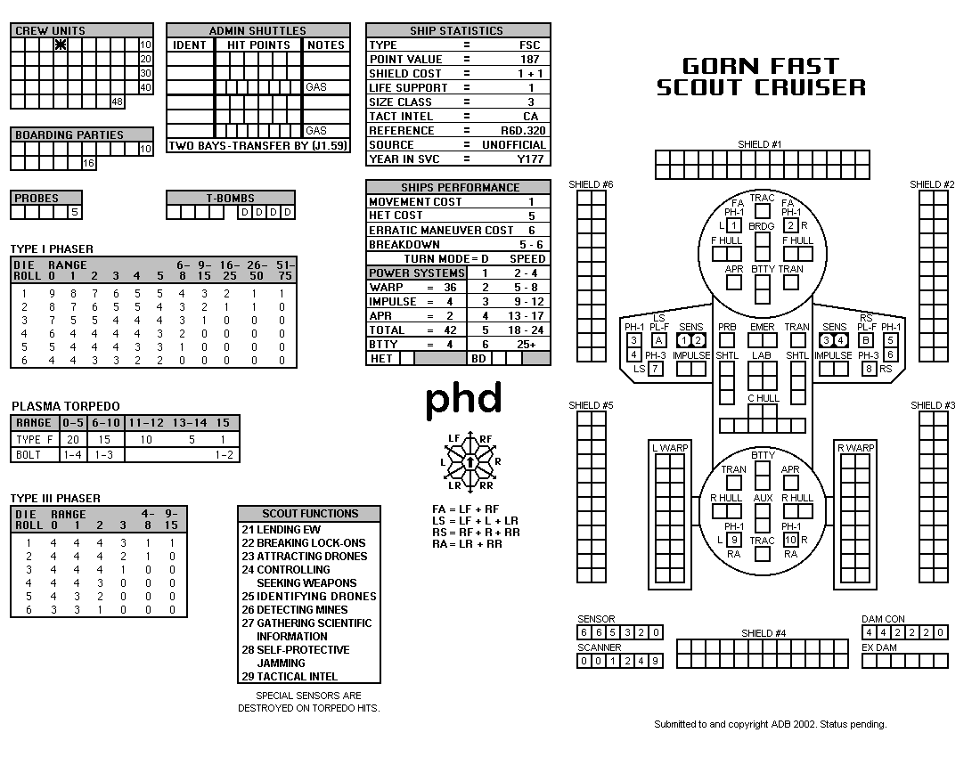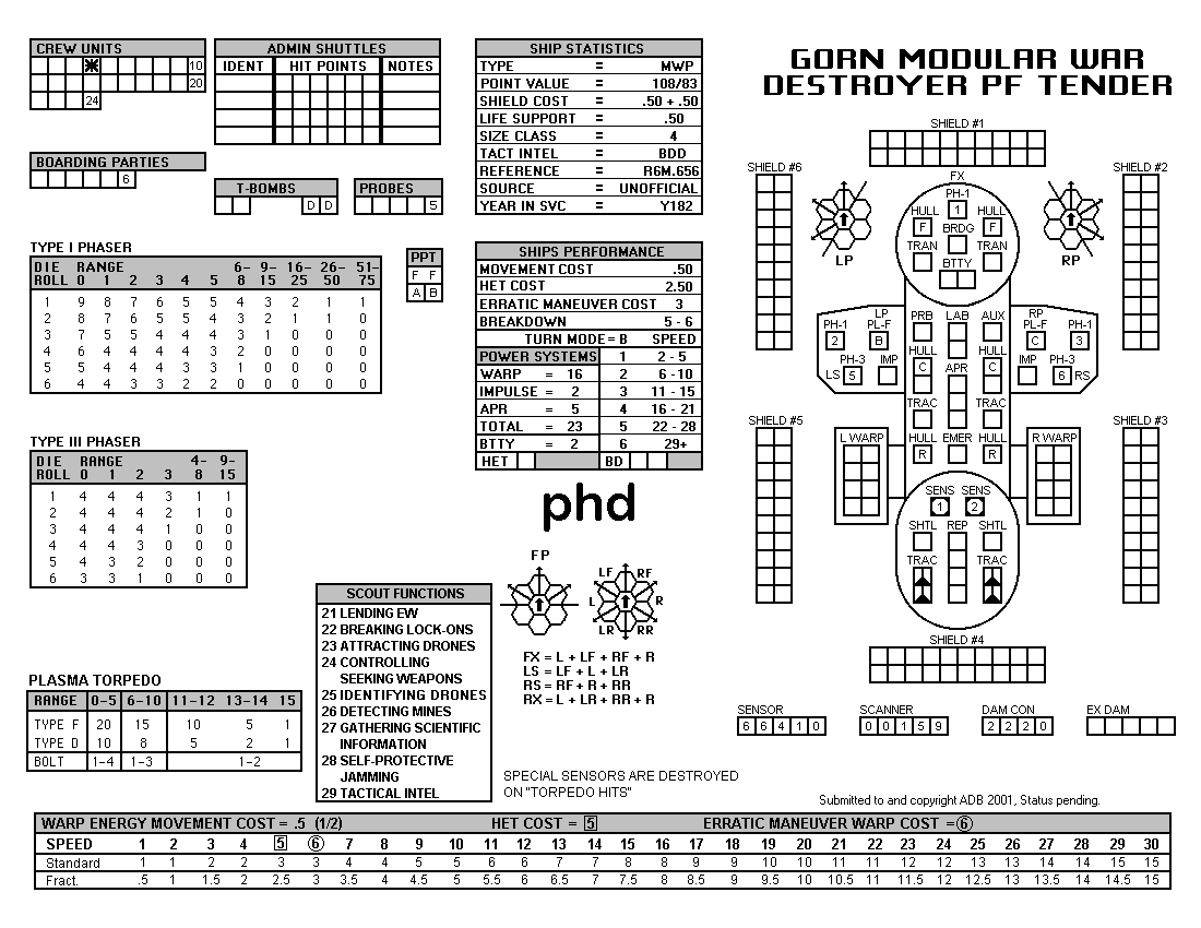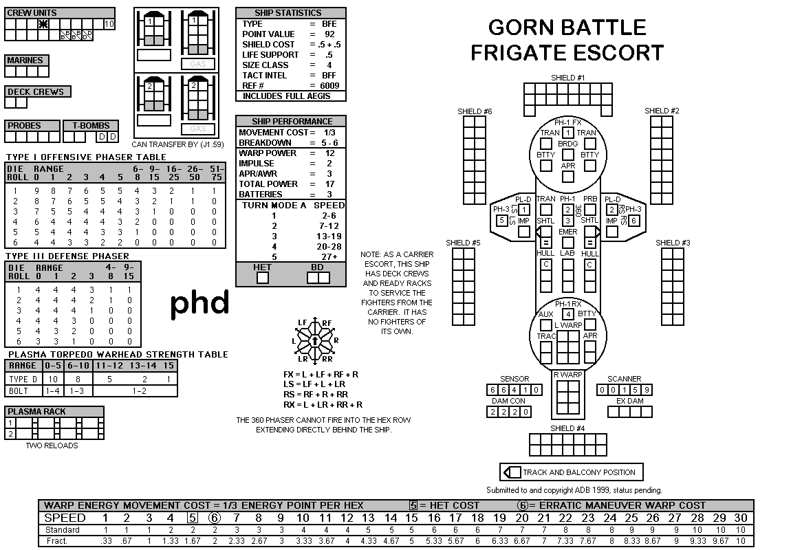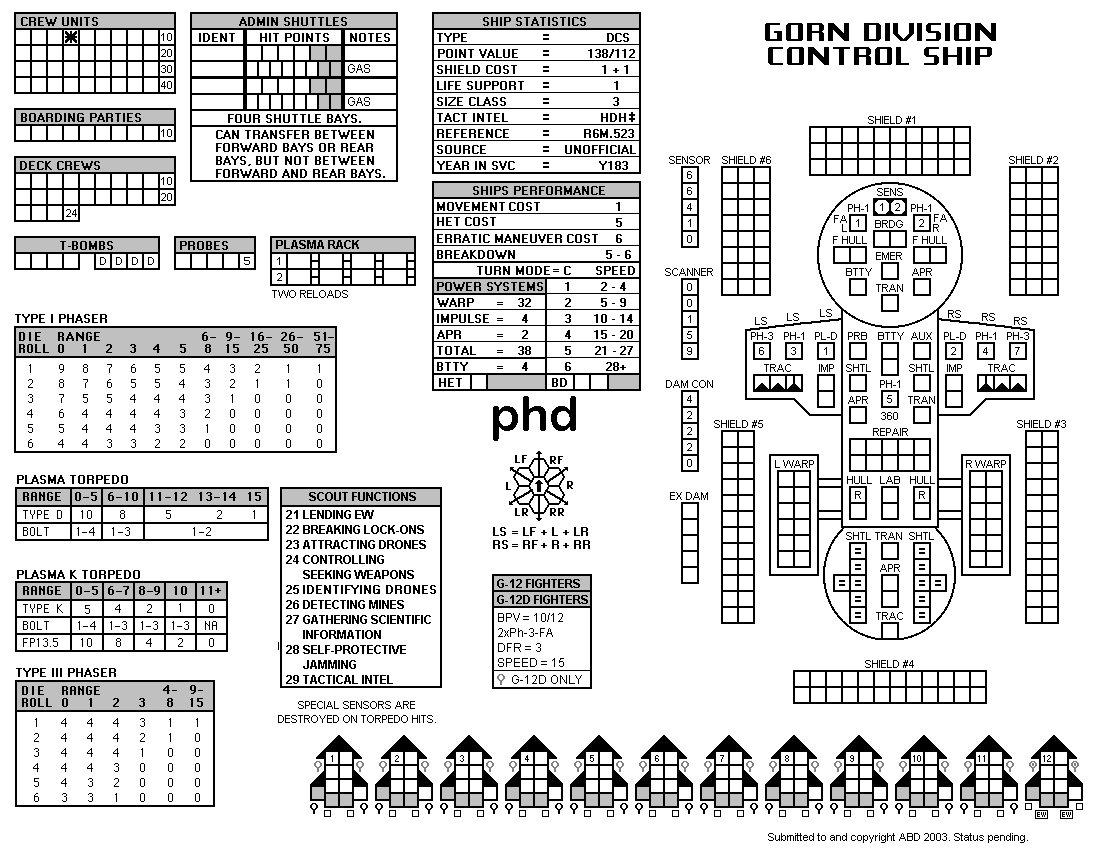 | Note: Due to the small size of this ship, a type-VI drone does 4 pts. of damage rather than 2, and any defensive fire systems treat this ship as if it was a PF. |